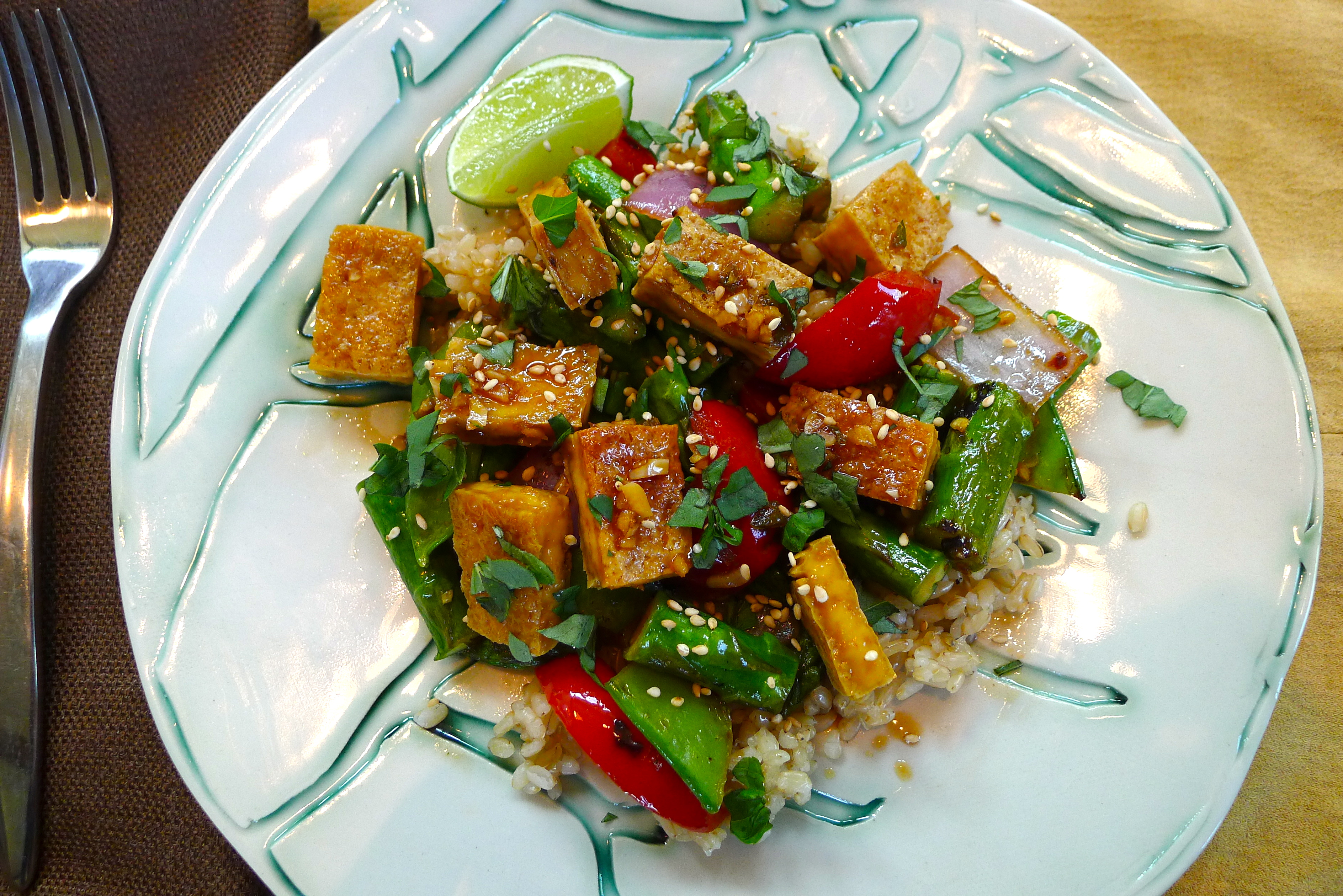 Heat the remaining sauce in a pan on the stove to reduce. While the tofu bakes, sauté the veggies in a little bit of olive oil to desired doneness, spooning in a little bit of the reserved sauce. Serve the tofu and veggies over brown rice. Drizzle some of the reduced sauce over the dish and sprinkle with chopped cilantro and sesame seeds. Enjoy while dining outdoors in summertime or looking out the window at a snowstorm, with gratitude for the season. Yum!