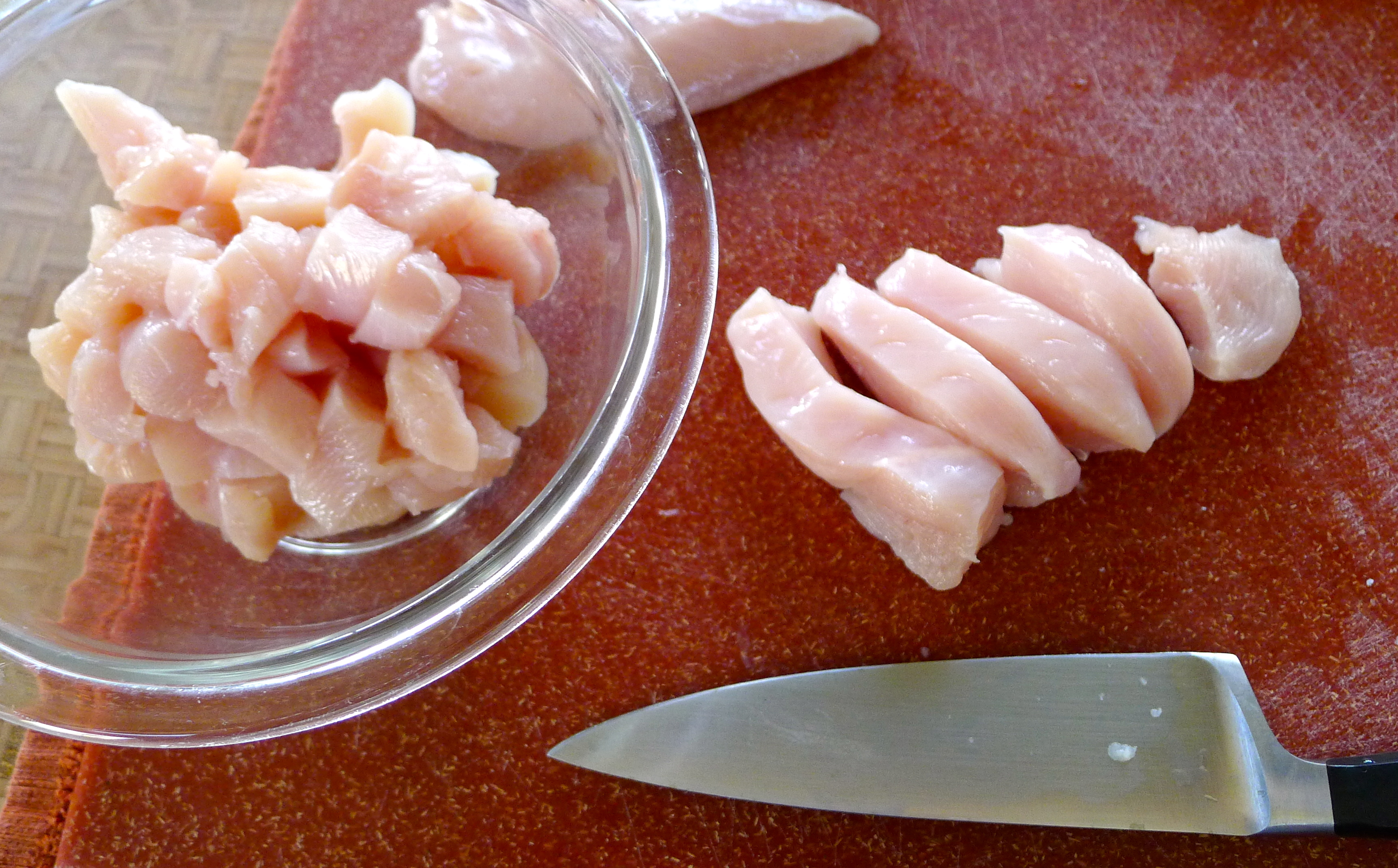 I started by cooking a cup of brown rice and letting it cool. In the meantime, I chopped up two chicken breasts, sautéed it in a combination of a little olive oil and butter, and set it aside.