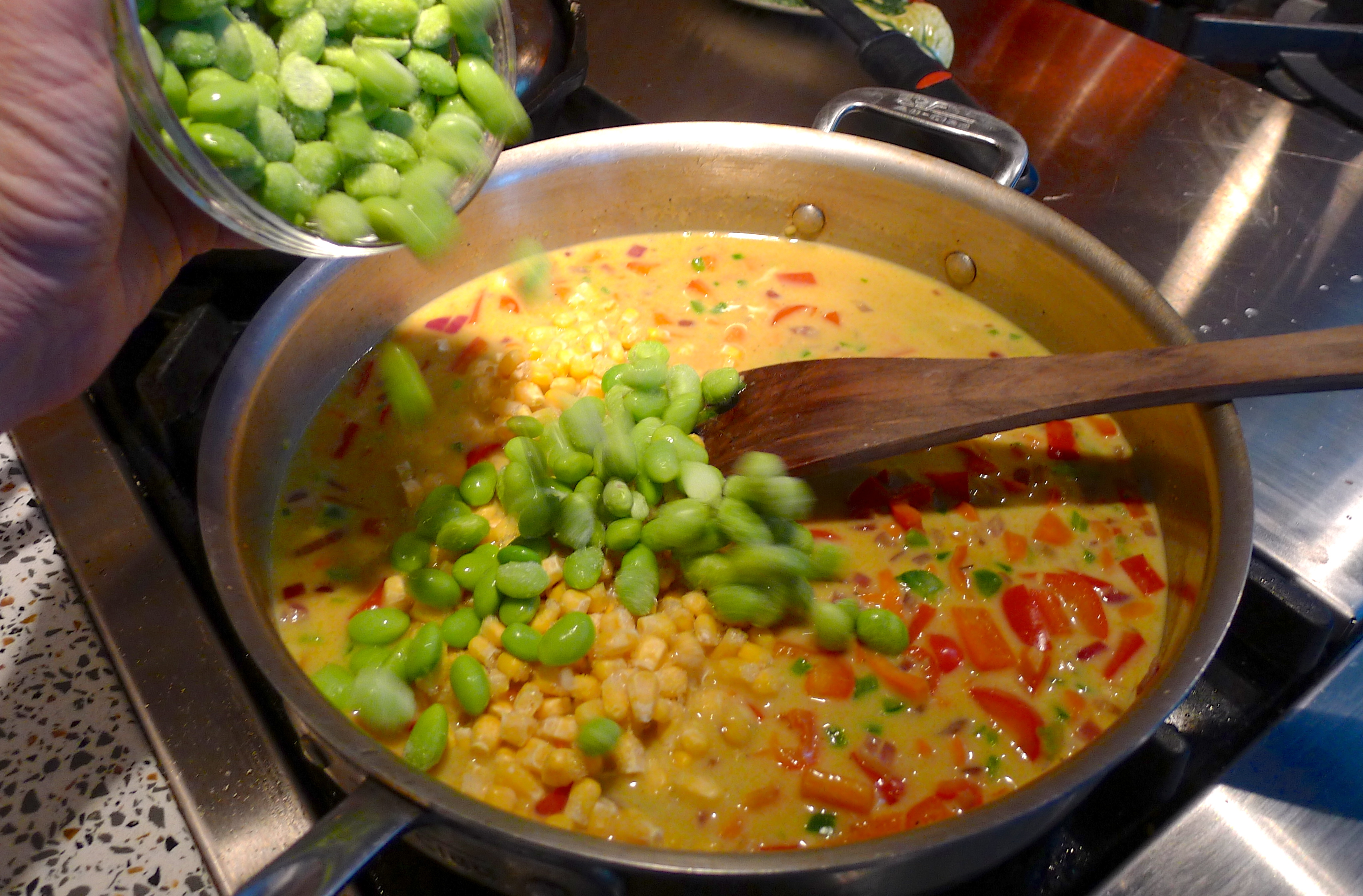 In a medium-heat saucepan, swirl in a little bit of olive oil. Add the onion and sauté for a few minutes. Add the carrot and bell pepper and continue to cook. When those veggies are softening, add the garlic, ginger, and jalapeno. Season well with salt and pepper. Stir to combine and cook for 2-3 minutes. Stir in the curry powder, followed by the coconut milk. Add the edamame, corn, most of the cilantro and basil, and lemon juice. Continue to cook for a few minutes, then remove from heat.