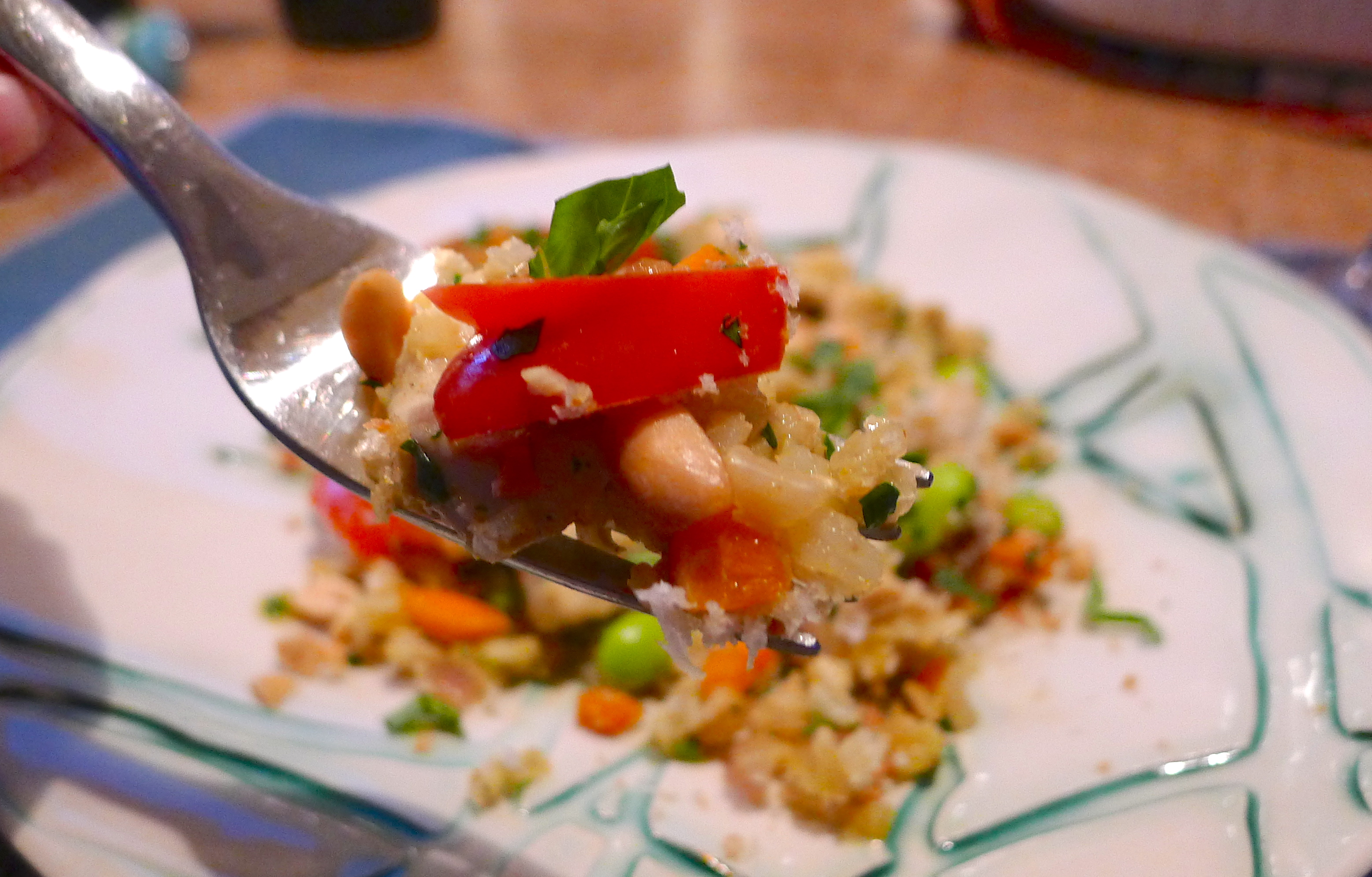 And now for the curry: a generous tablespoon, stirred right into the veggies. I poured in an entire can of light coconut milk (cream top and all) and watched the mixture turn into creamy, curry-yellow deliciousness. The last of the veggies to go into the pan were the corn and edamame. I also stirred in a handful of chopped cilantro and some basil. After a few more minutes to allow flavors to meld, I took a taste and adjusted seasoning (more salt). I squeezed in just a tiny bit of lemon juice at the end.