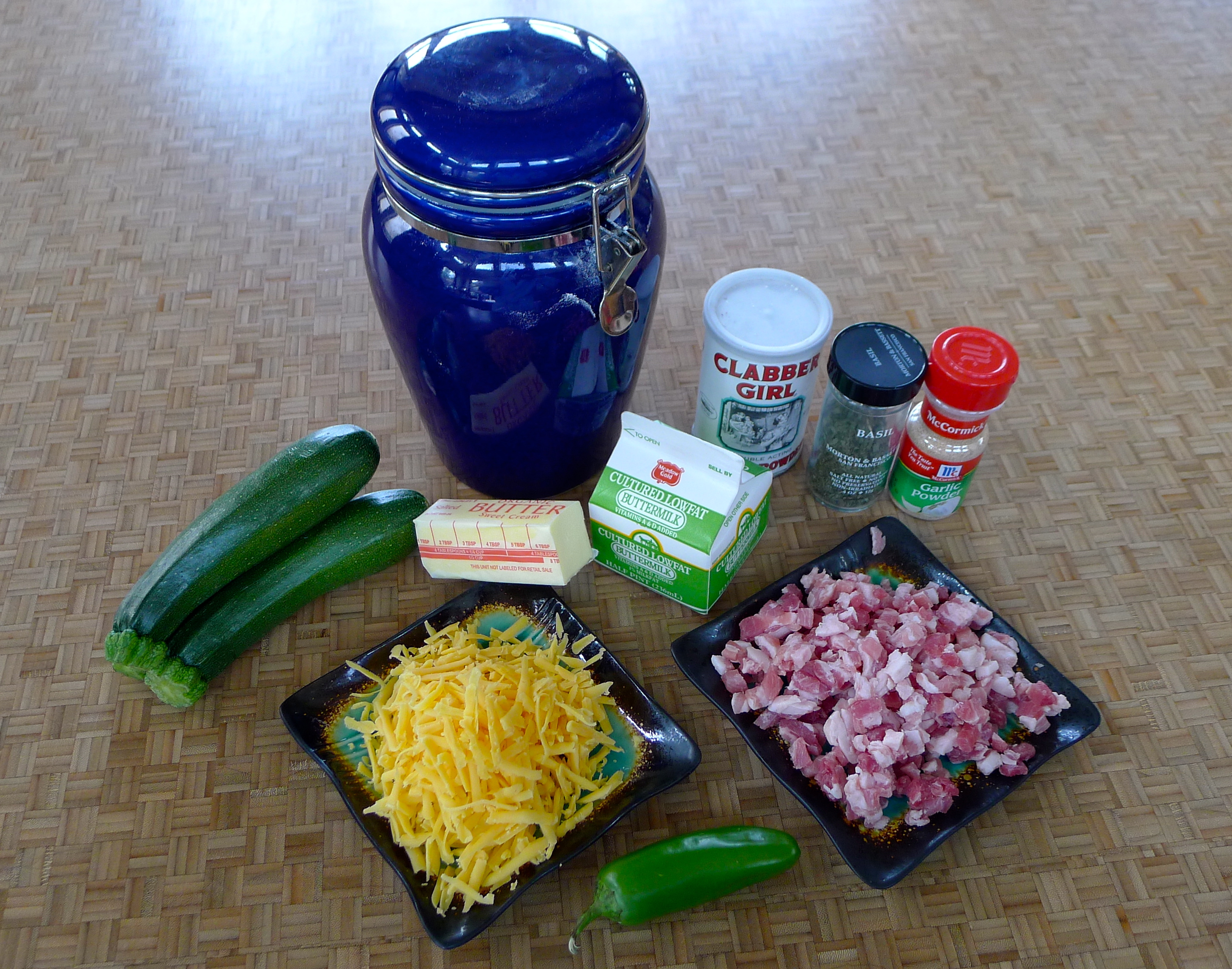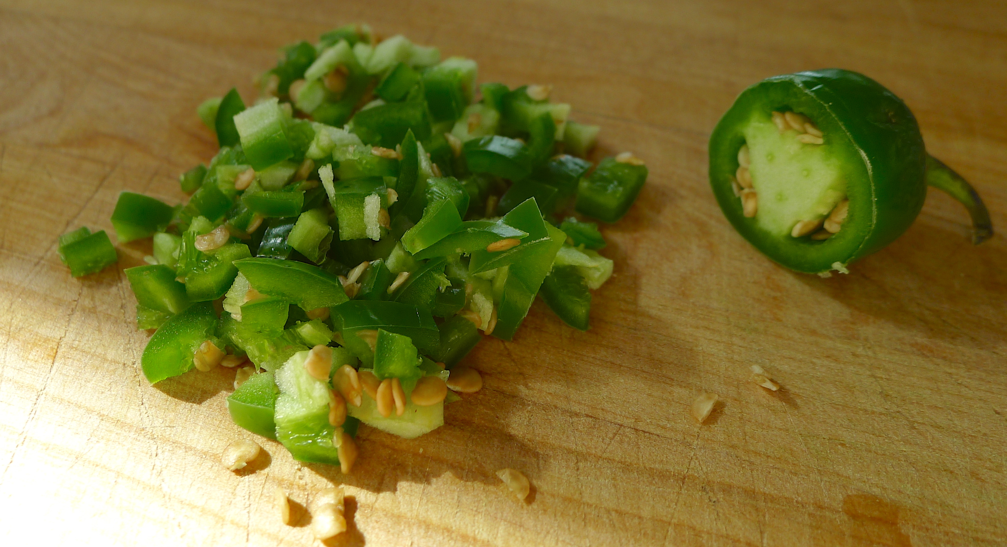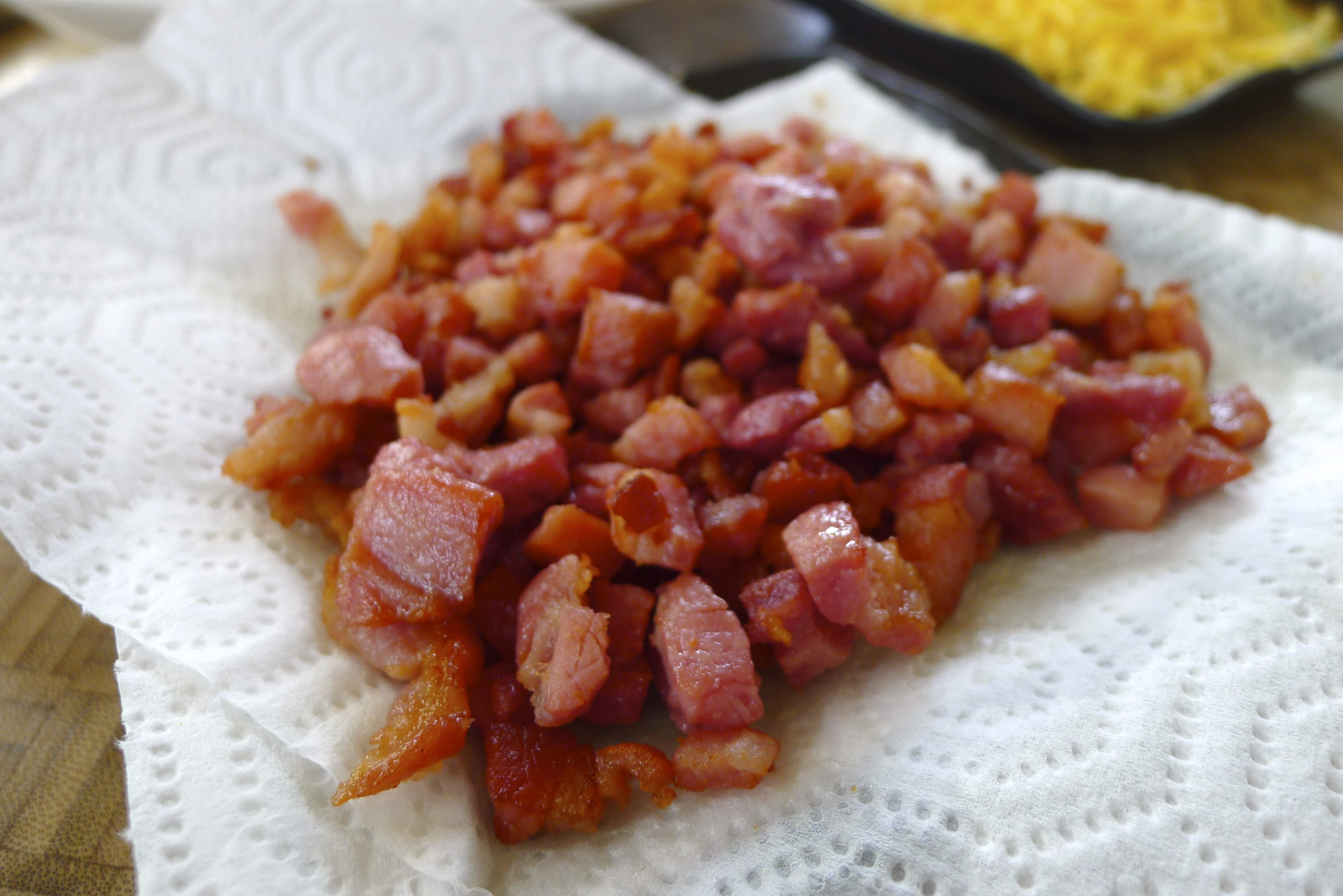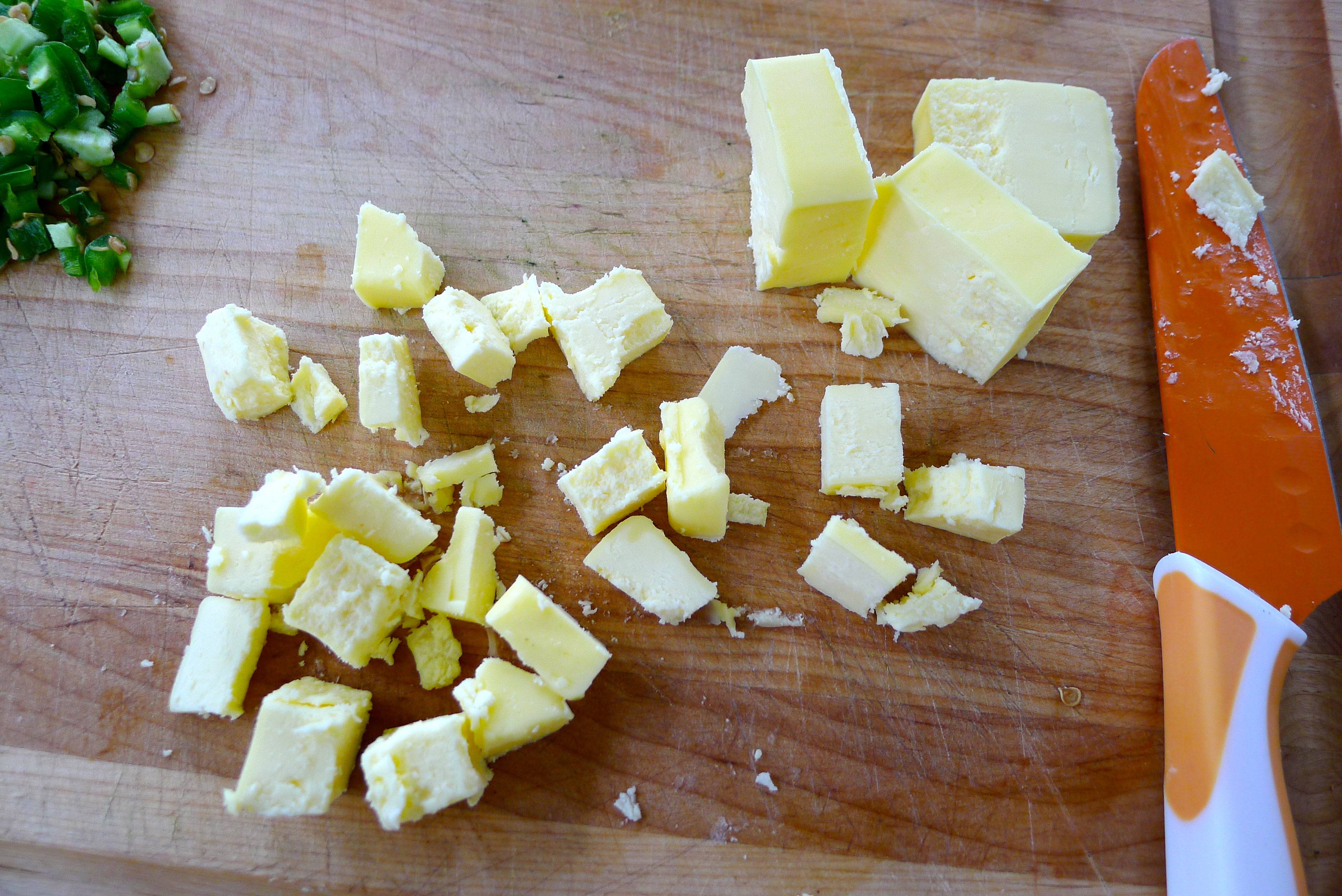 With the salty, crispy pancetta set aside, I prepped the other fillings. I grated zucchini and cheddar cheese, and chopped up a whole jalapeno (seeds and all). We like it hot!