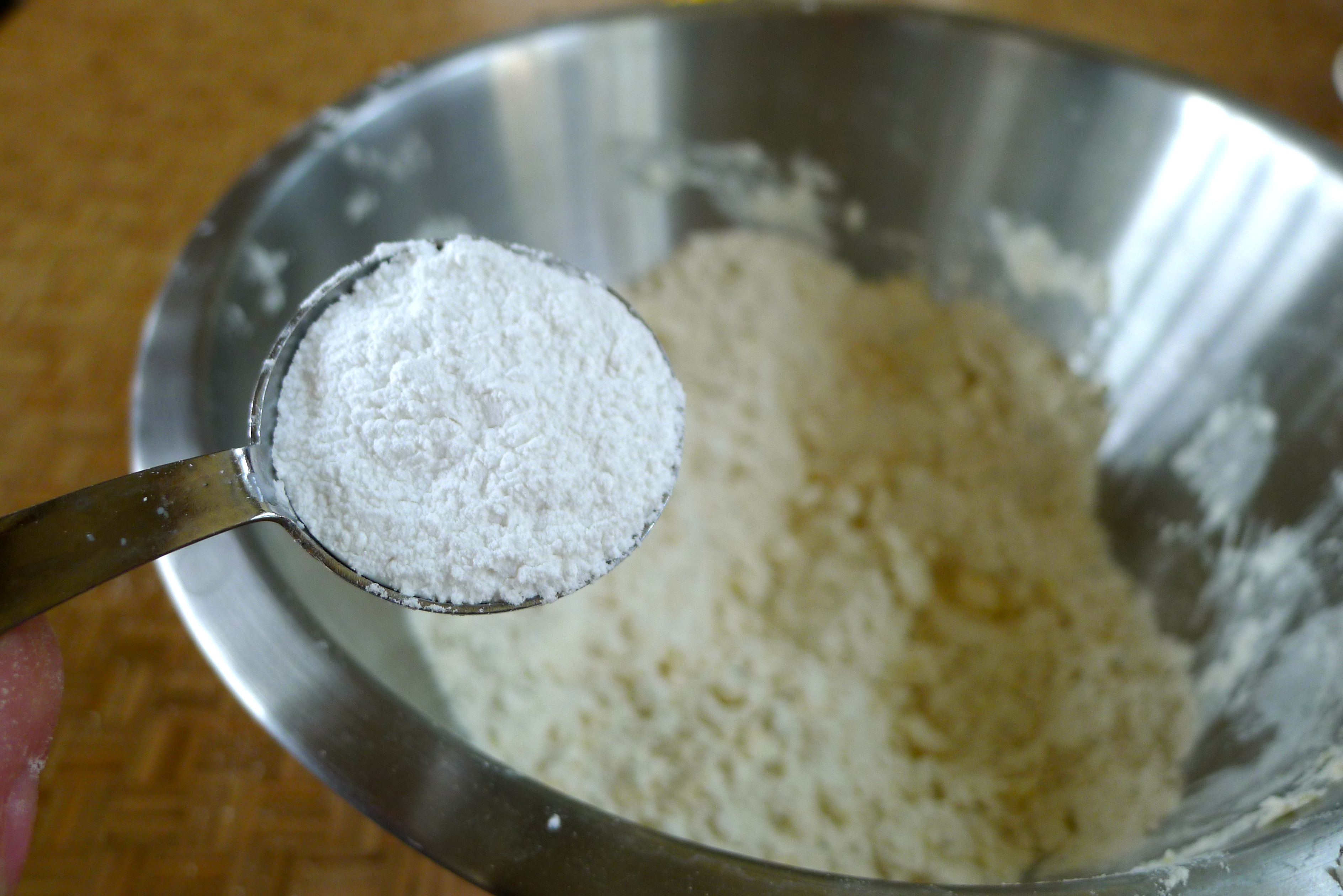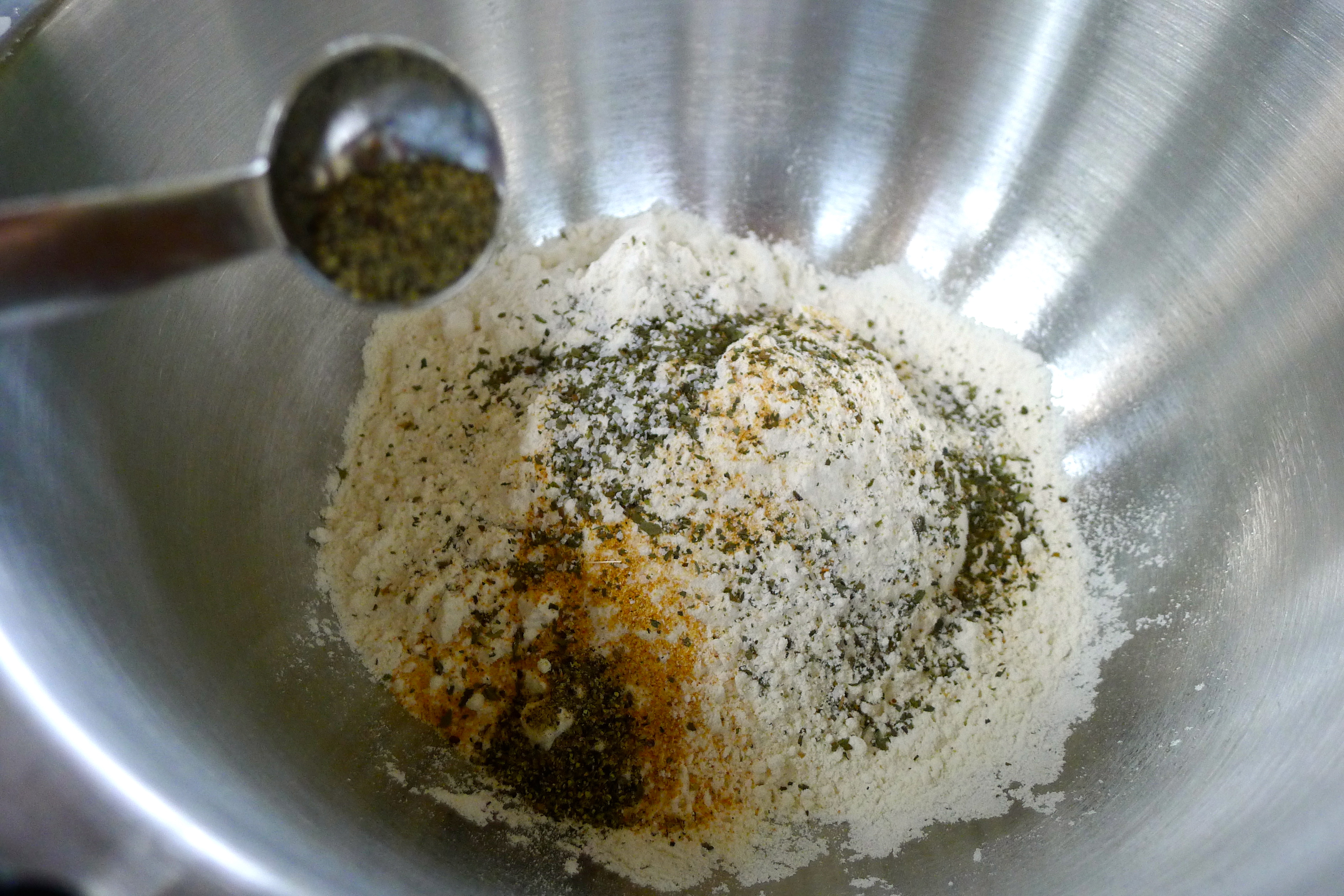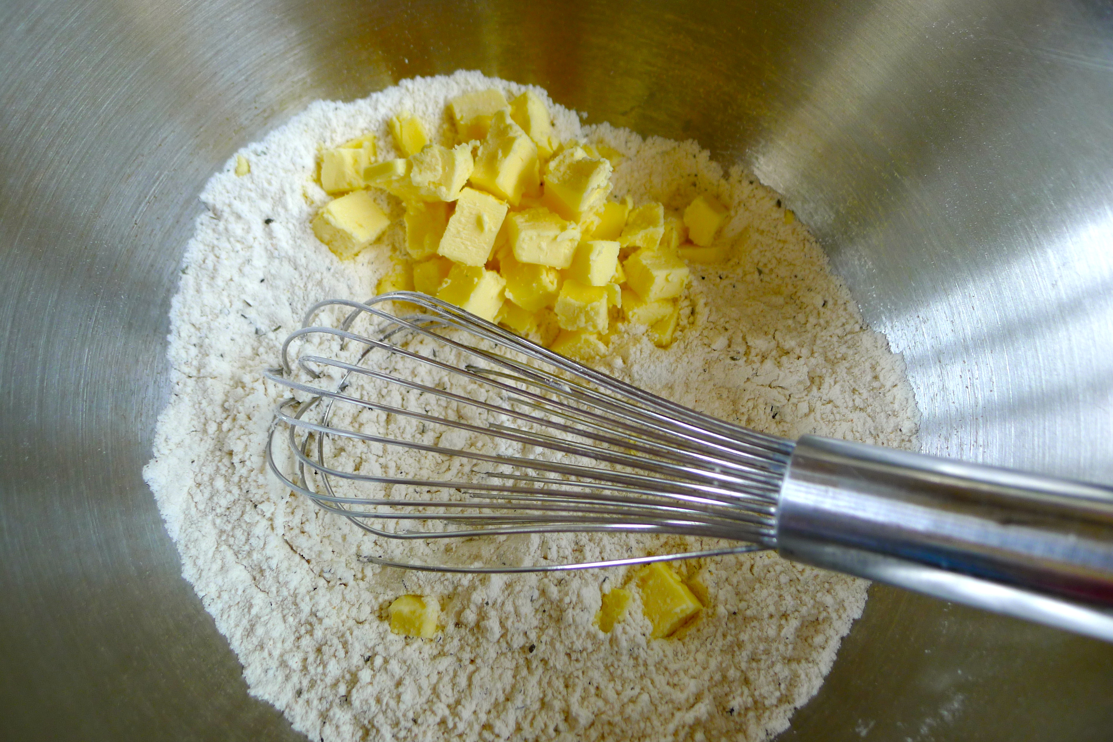 Next I mixed the dry ingredients. Flour, a little dried basil, garlic powder, salt and black pepper. I pulled the butter out of the fridge at the last minute. When you make biscuits, the little chunks of butter in the dough melt in the oven, leaving air pockets in the dough and making the biscuits light and flaky. Cold butter is important. I used two forks to cut the butter into the flour.