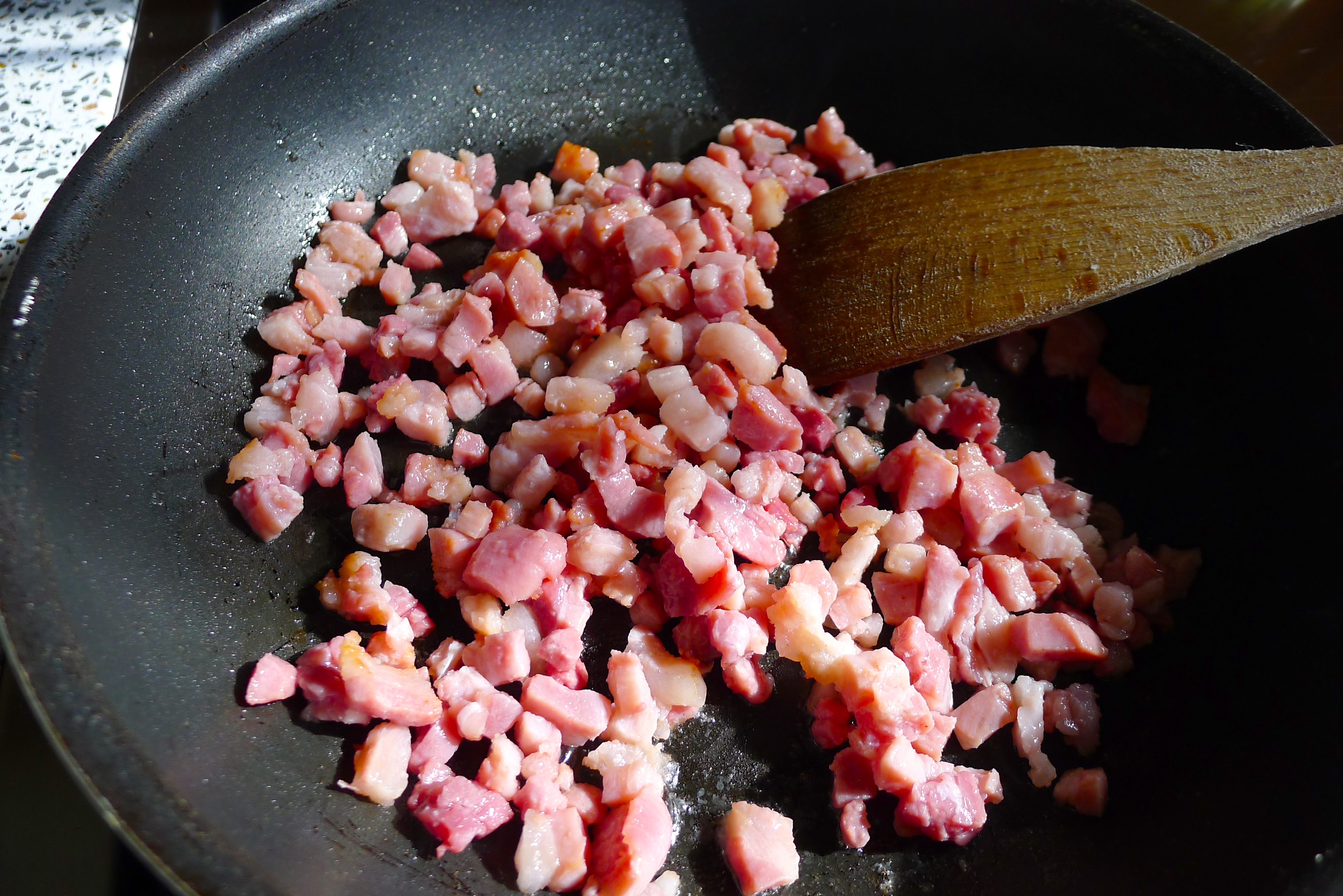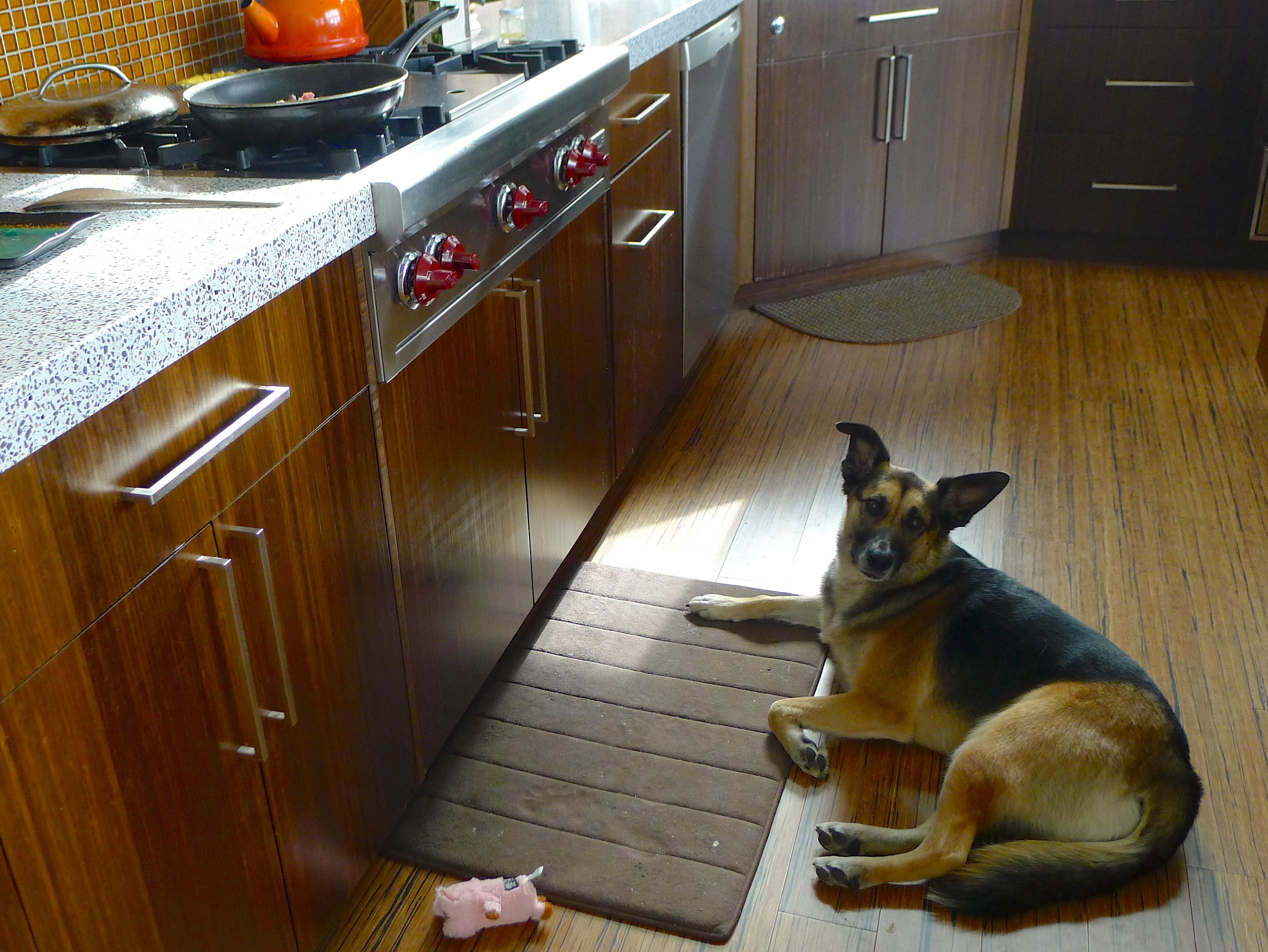 I started with the cast iron skillet. Like I did with these goat cheese-dill biscuits, I heated the skillet in a hot oven while I made the dough. First up: browning the pancetta. (There was another interested party in the pancetta process.)