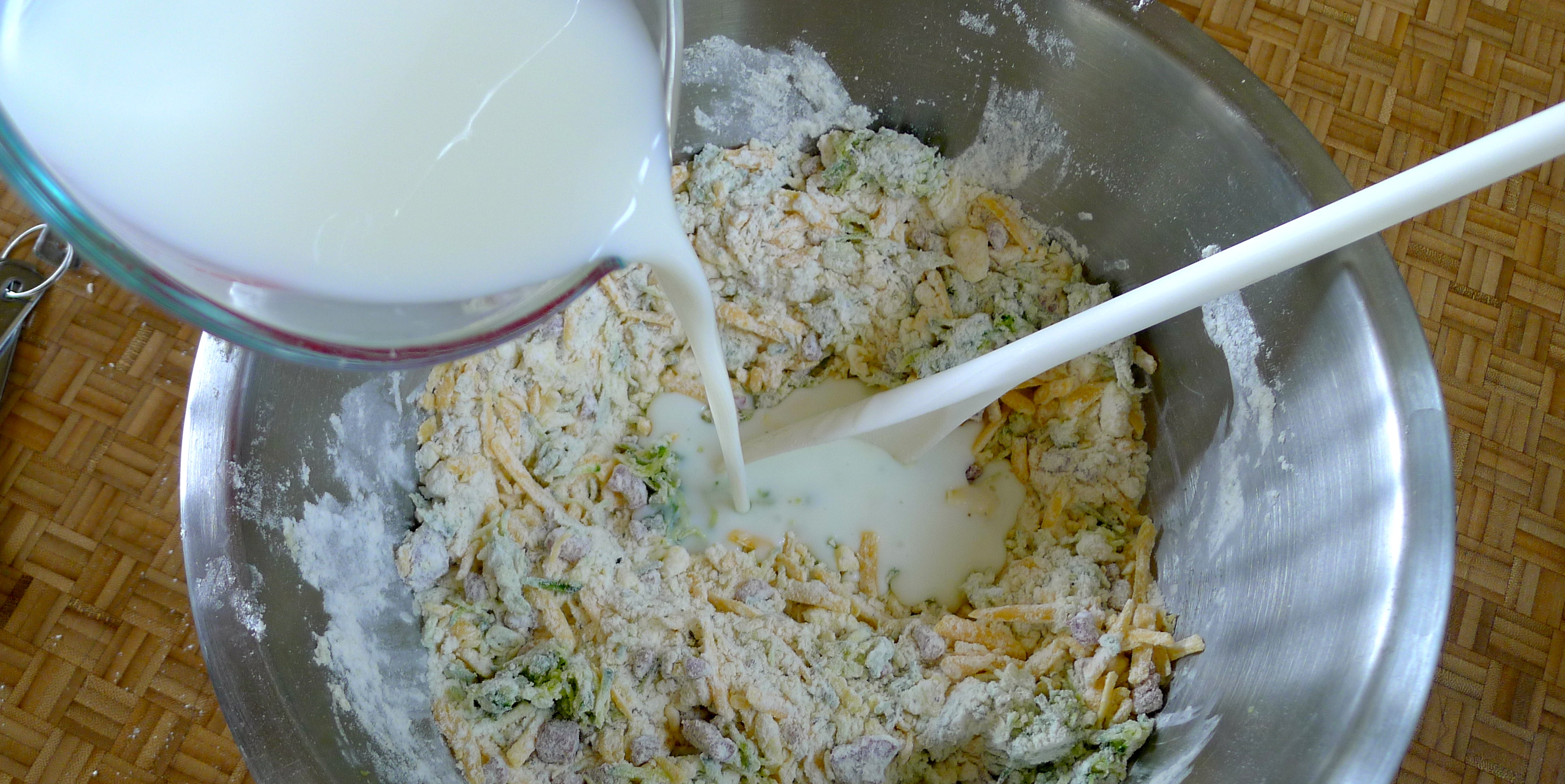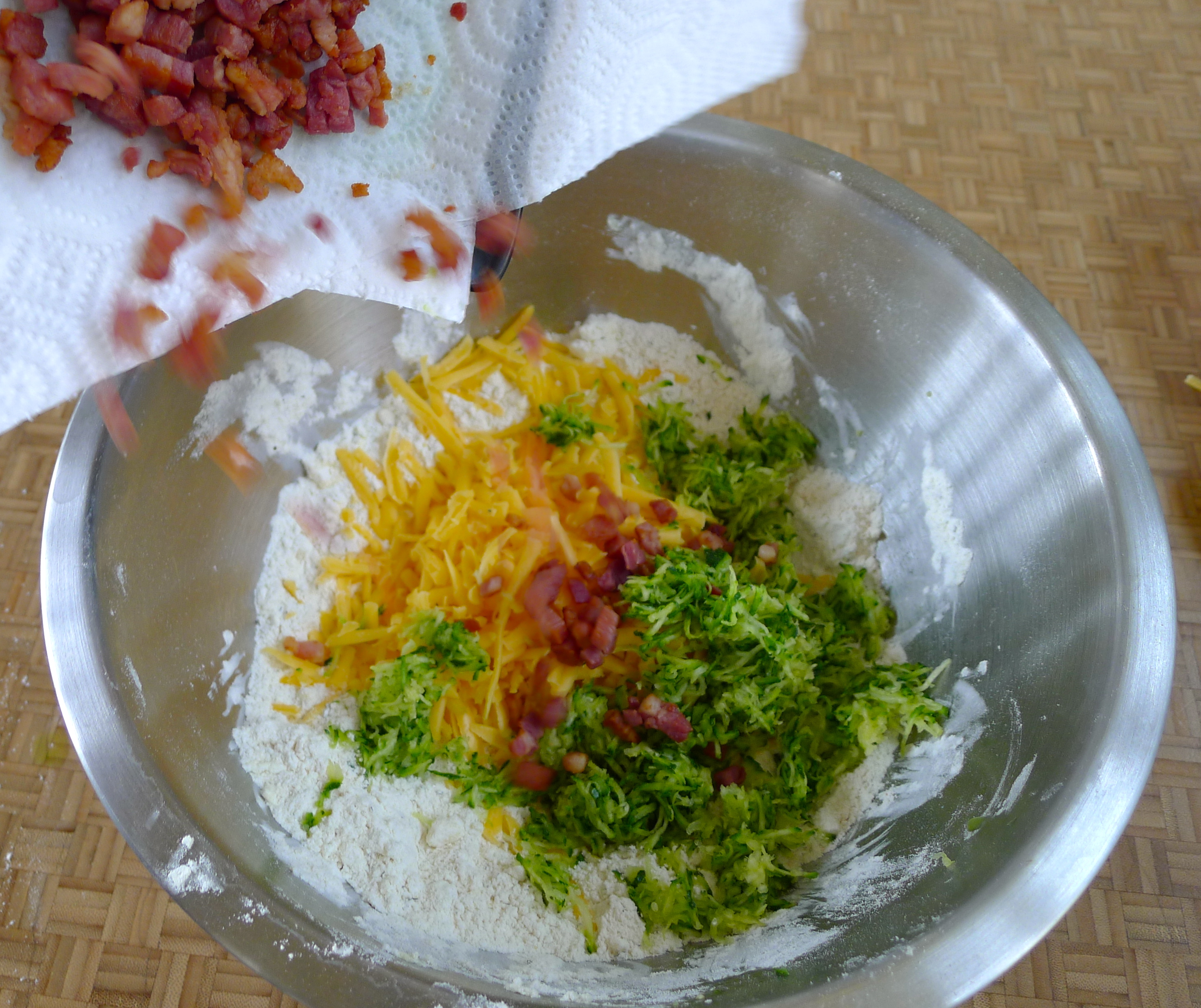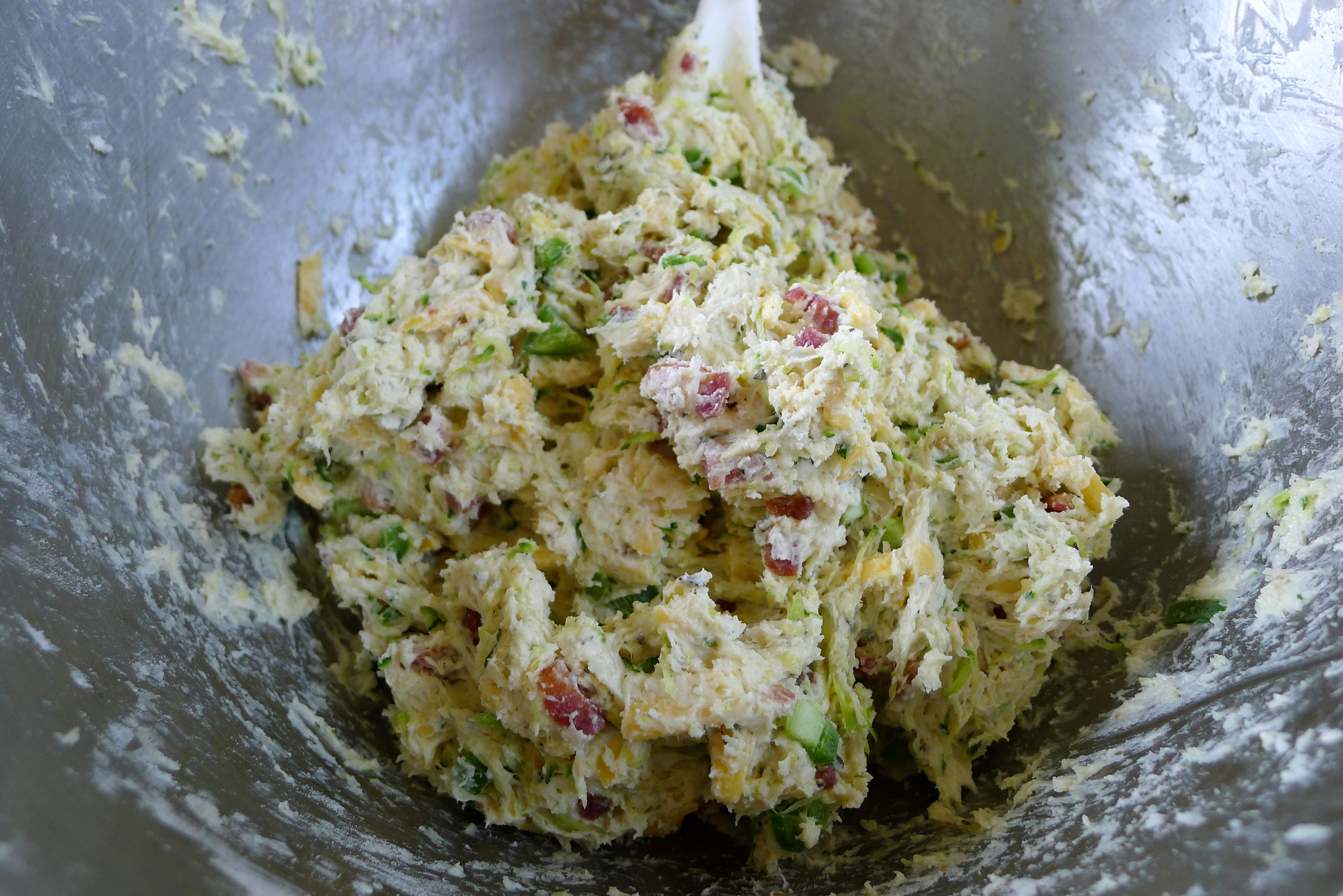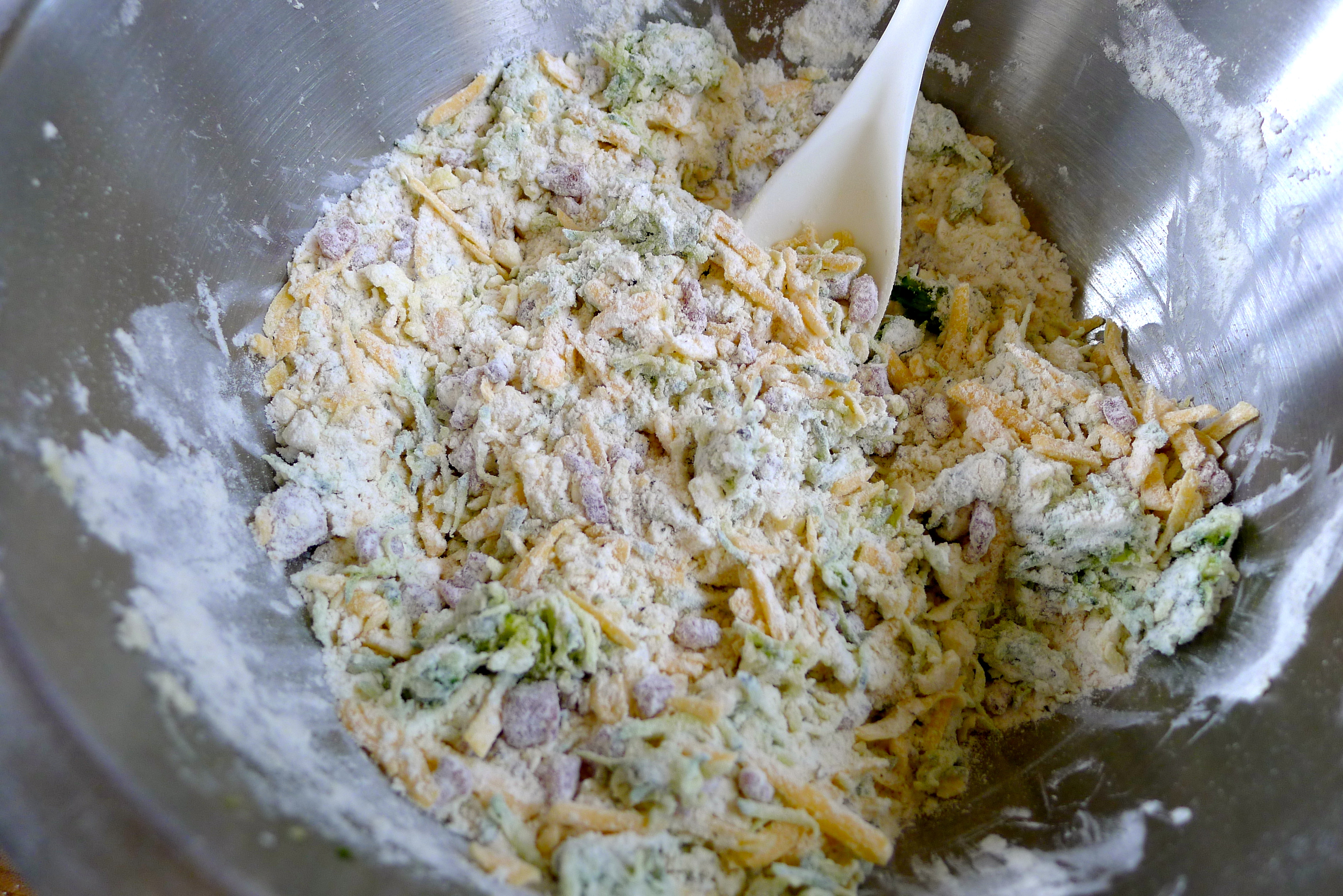 It was about now that I realized I’d forgotten the baking powder; it should be sifted in with the dry ingredients. Next, I added the zucchini, cheddar cheese, the pancetta, and jalapeno and gave the mixture a good stir before pouring in a cup of buttermilk. The dough is sticky and full of delicious chunks of flavor!