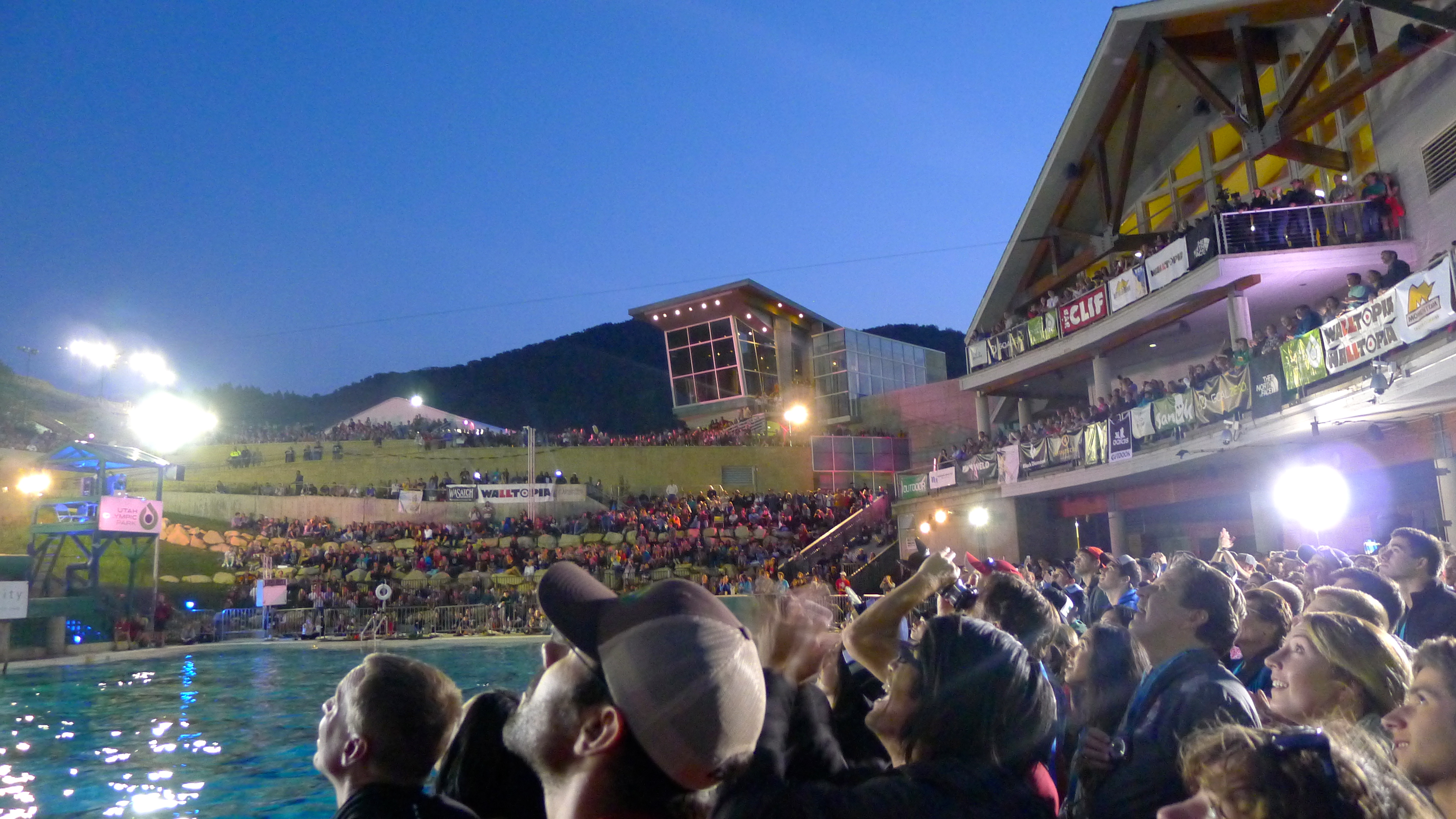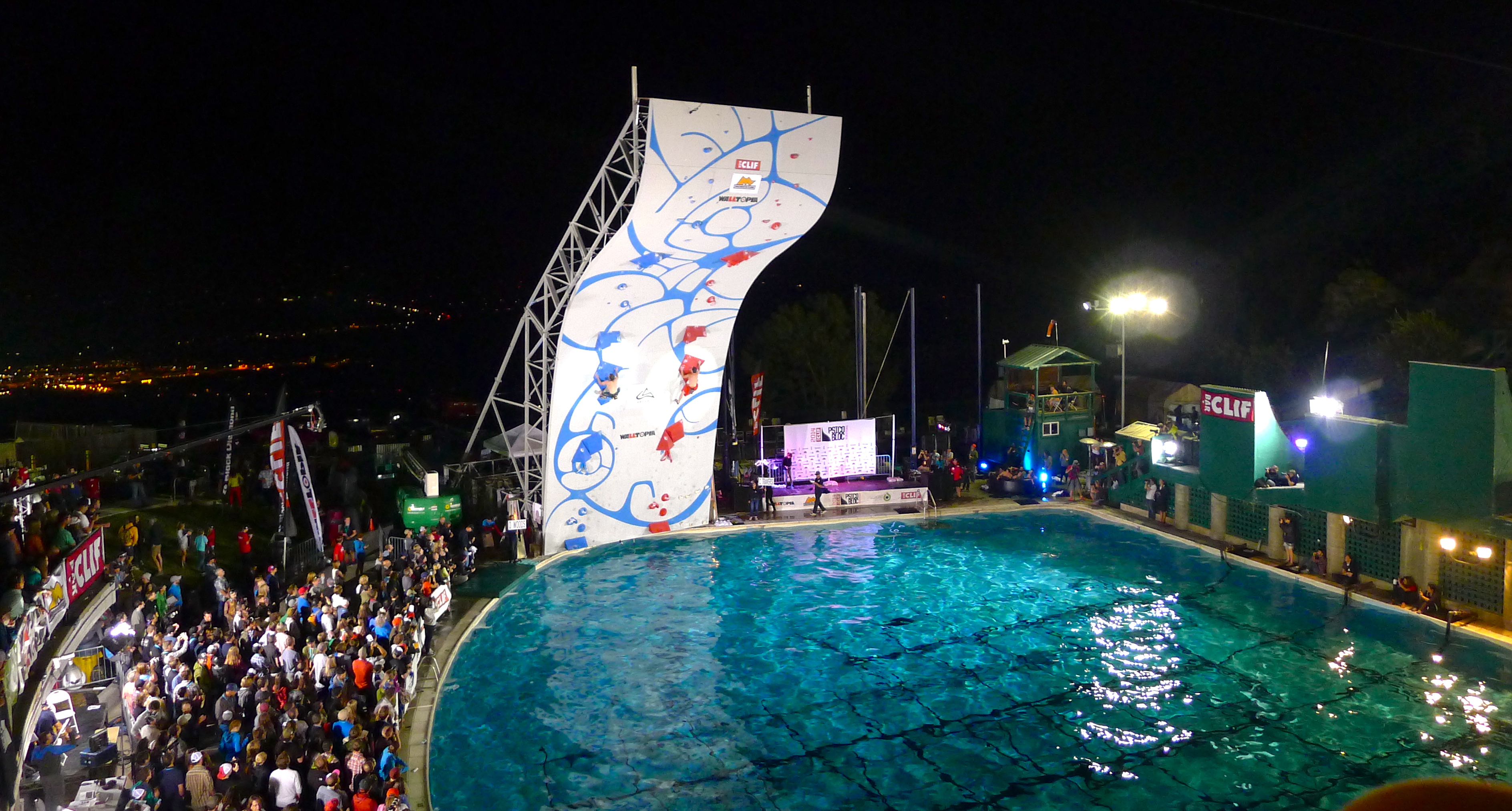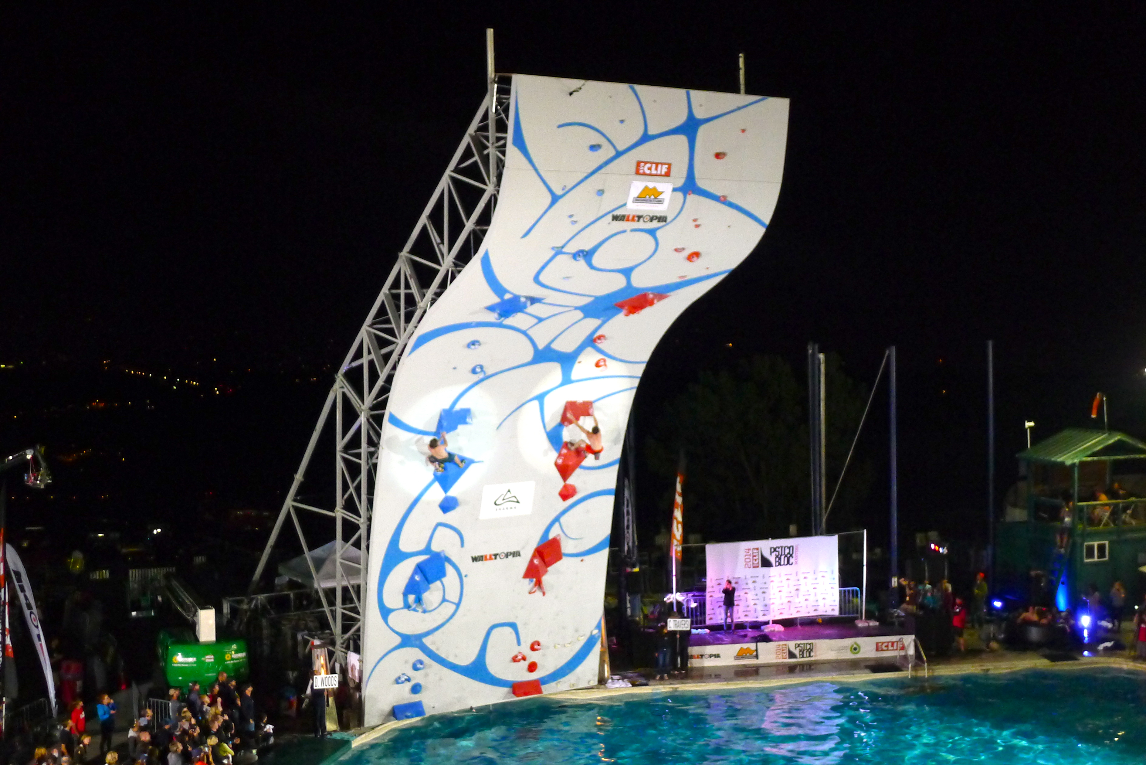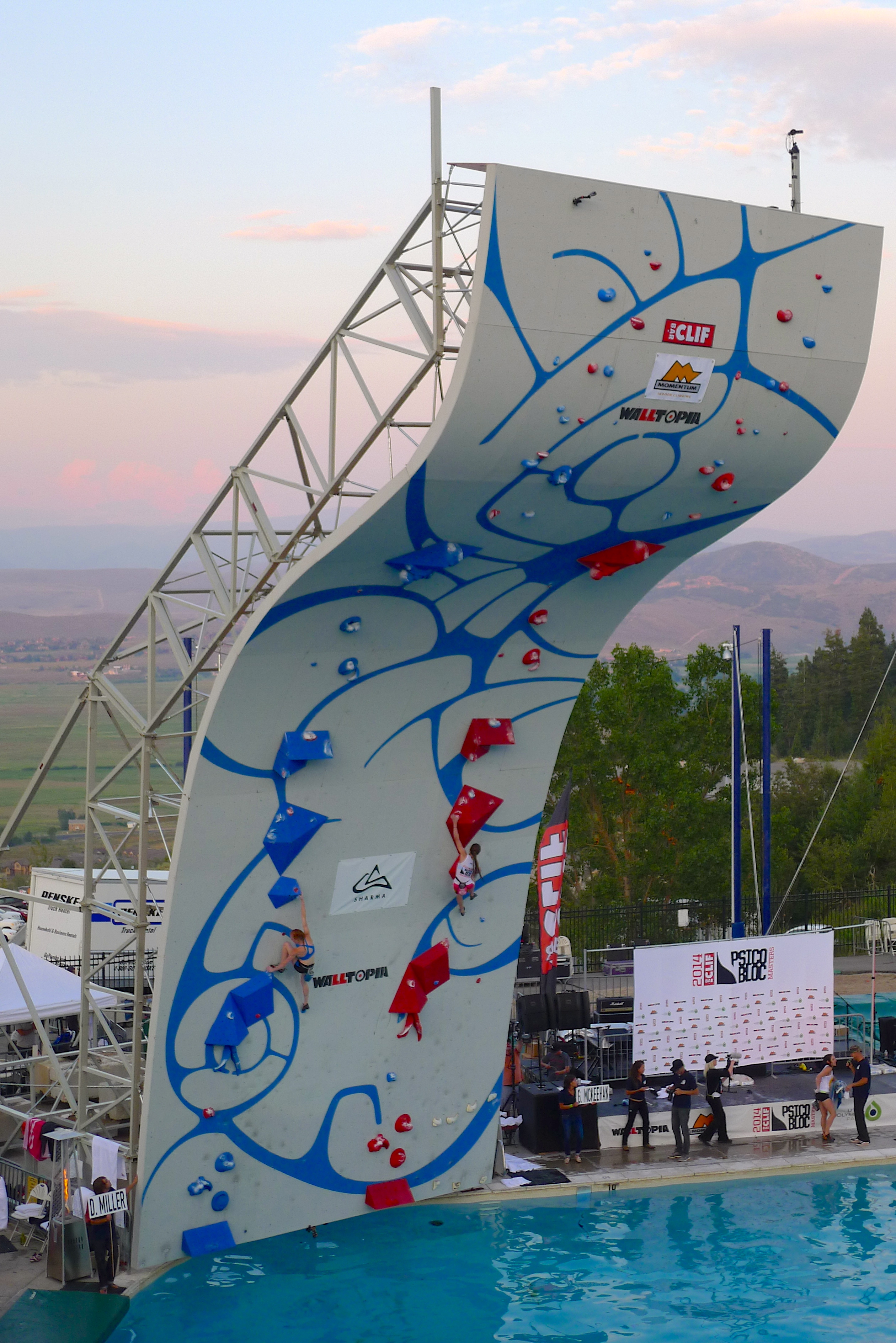 Workers adjusted the climbing wall holds to increase the difficulty for the men’s competition. We sipped drinks and watched the moon rise, entertained by the ski jumpers doing tricks into the pool. As the boys took their place on the wall, It was clear from the first heat that this was going to be a tight competition. I couldn’t believe how quickly these guys were climbing a 5.14 wall (one was timed at 40 seconds). Amazing talent!