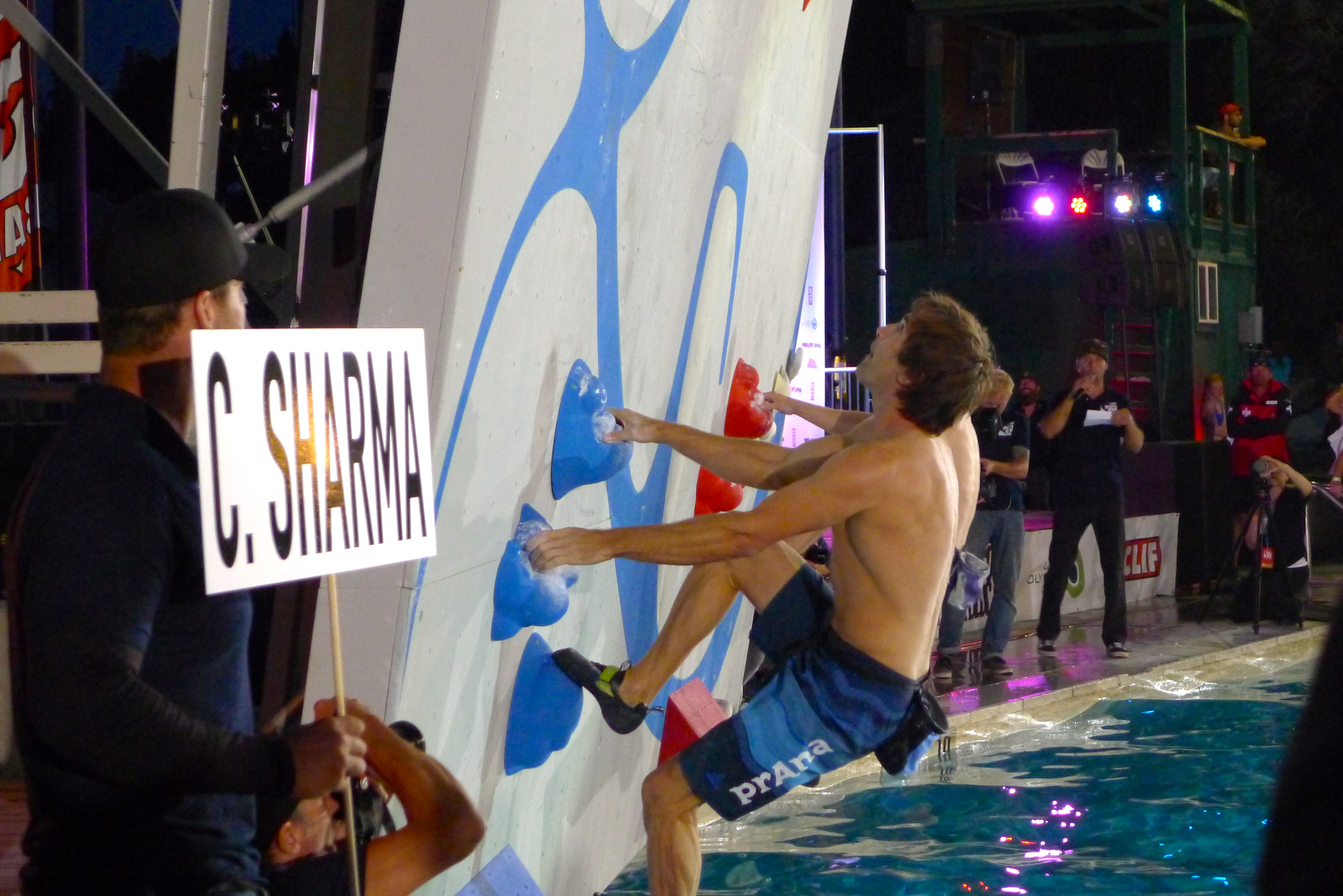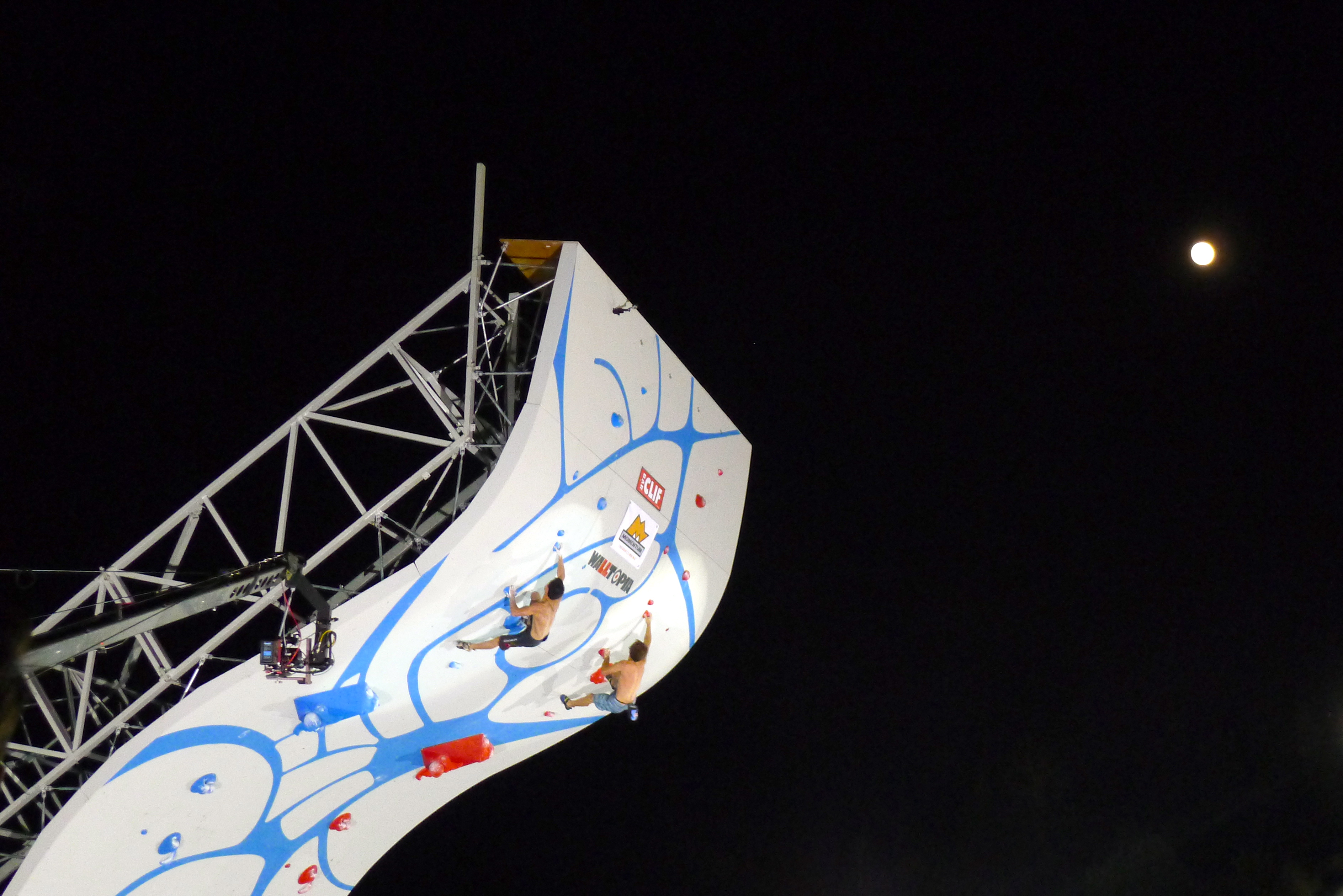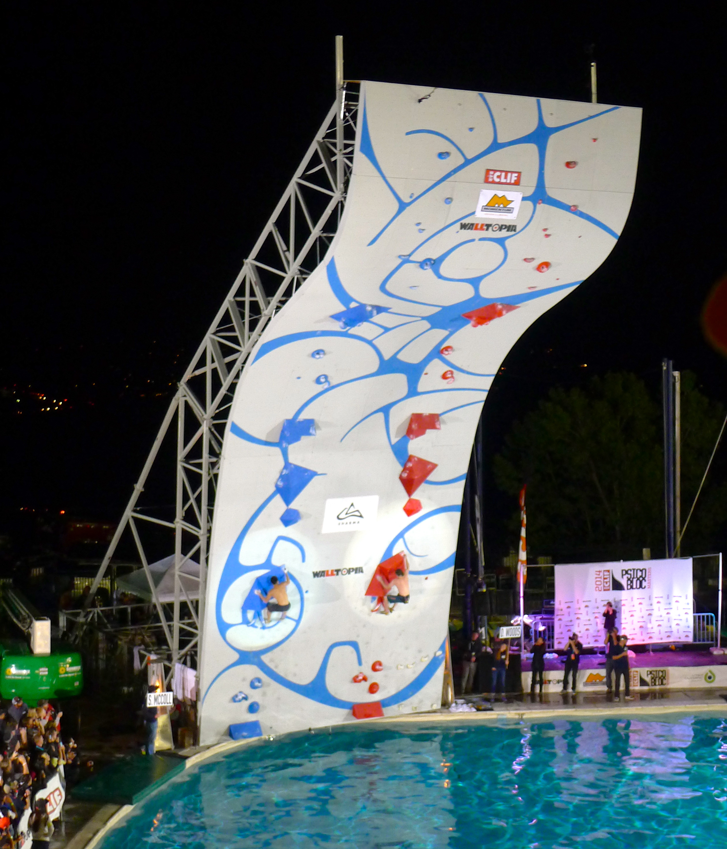 Workers adjusted the climbing wall holds to increase the difficulty for the men’s competition. We sipped drinks and watched the moon rise, entertained by the ski jumpers doing tricks into the pool. As the boys took their place on the wall, It was clear from the first heat that this was going to be a tight competition. I couldn’t believe how quickly these guys were climbing a 5.14 wall (one was timed at 40 seconds). Amazing talent!