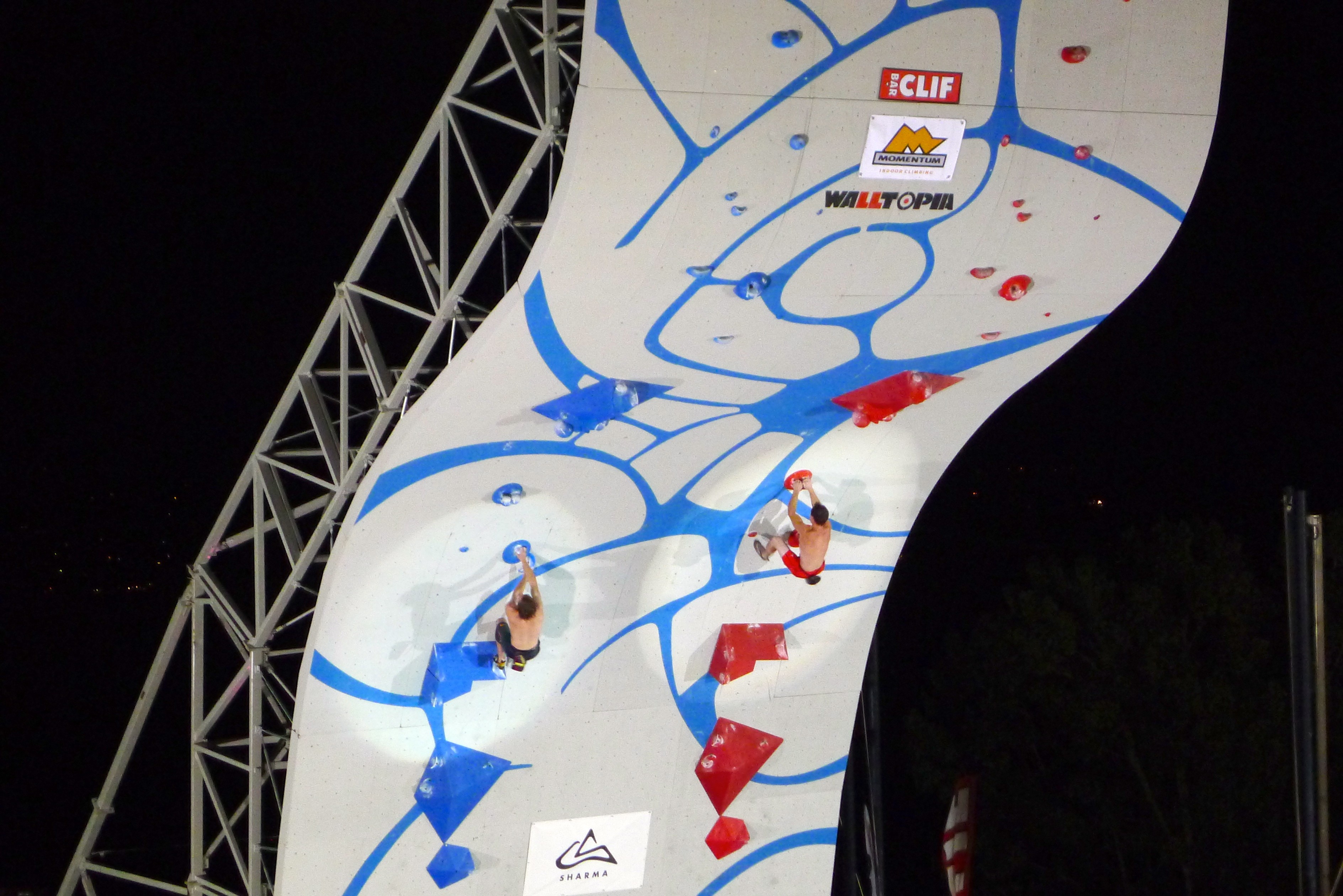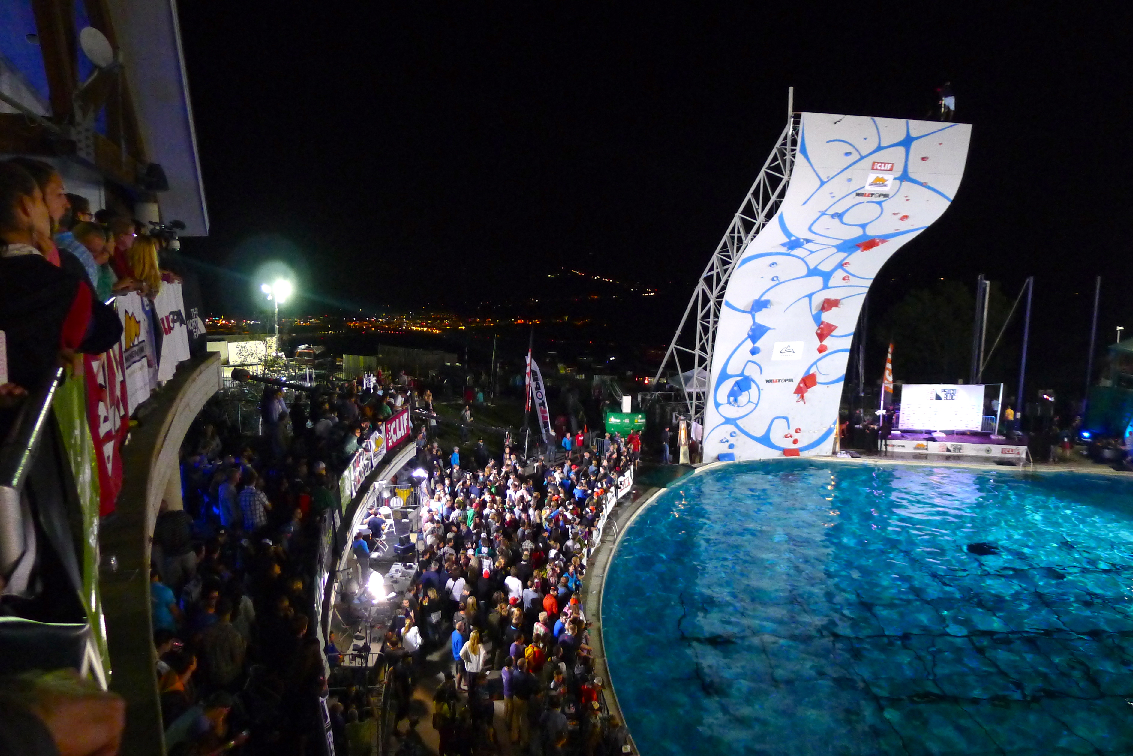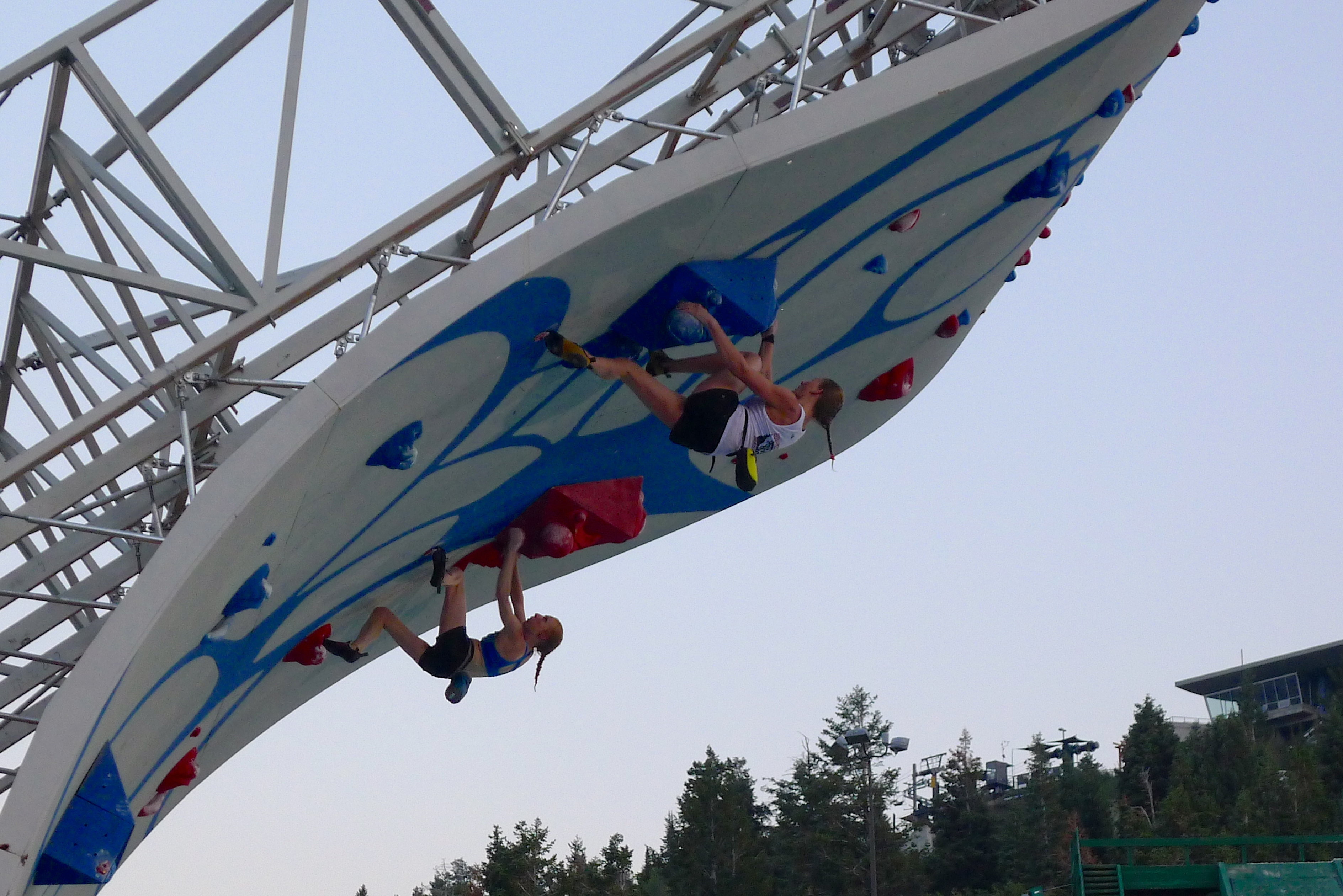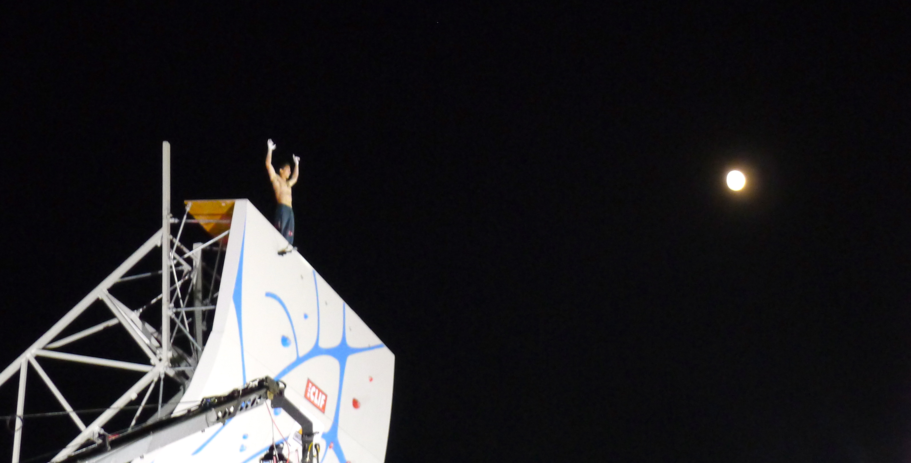 Workers adjusted the climbing wall holds to increase the difficulty for the men’s competition. We sipped drinks and watched the moon rise, entertained by the ski jumpers doing tricks into the pool. As the boys took their place on the wall, It was clear from the first heat that this was going to be a tight competition. I couldn’t believe how quickly these guys were climbing a 5.14 wall (one was timed at 40 seconds). Amazing talent!