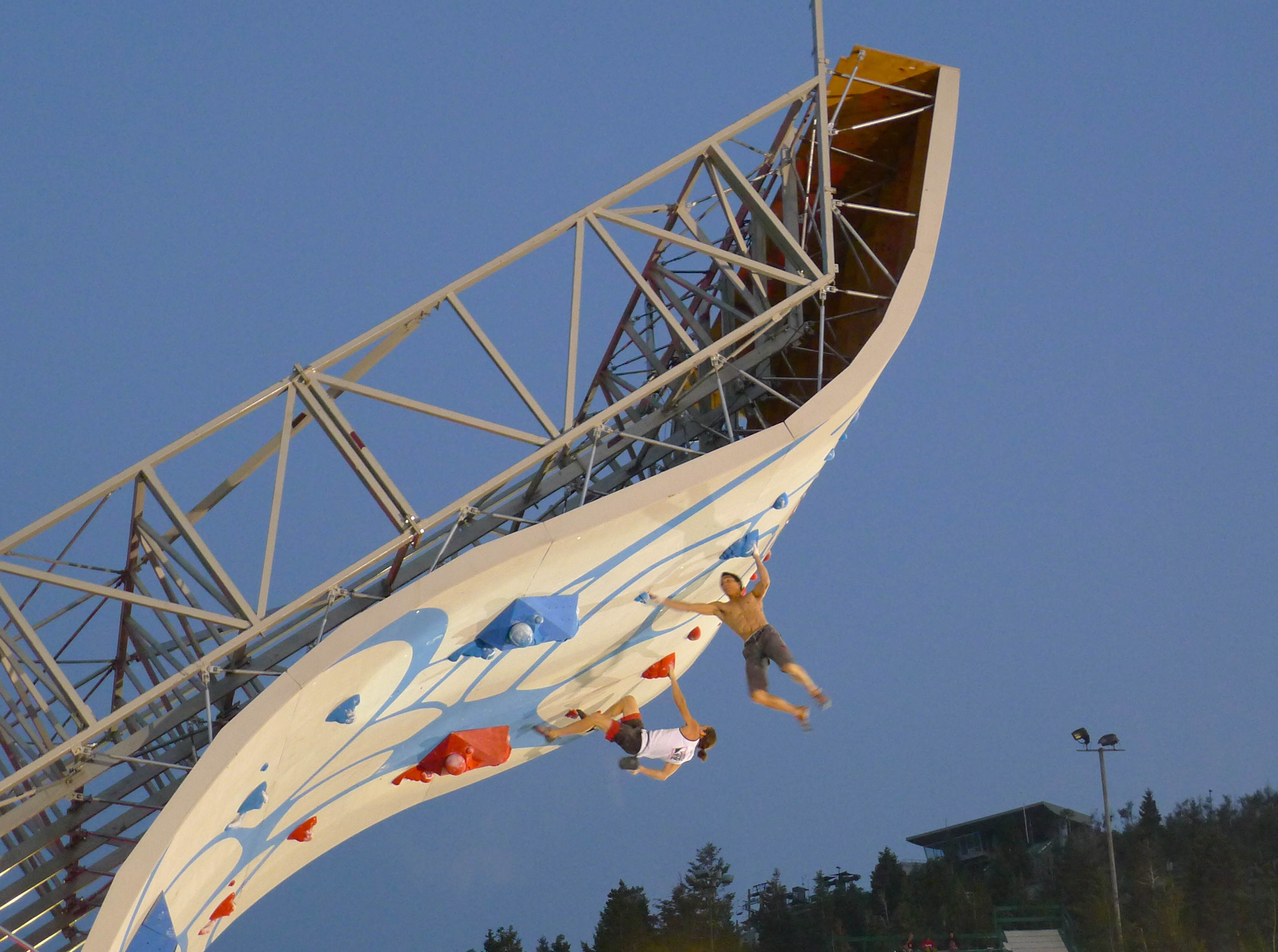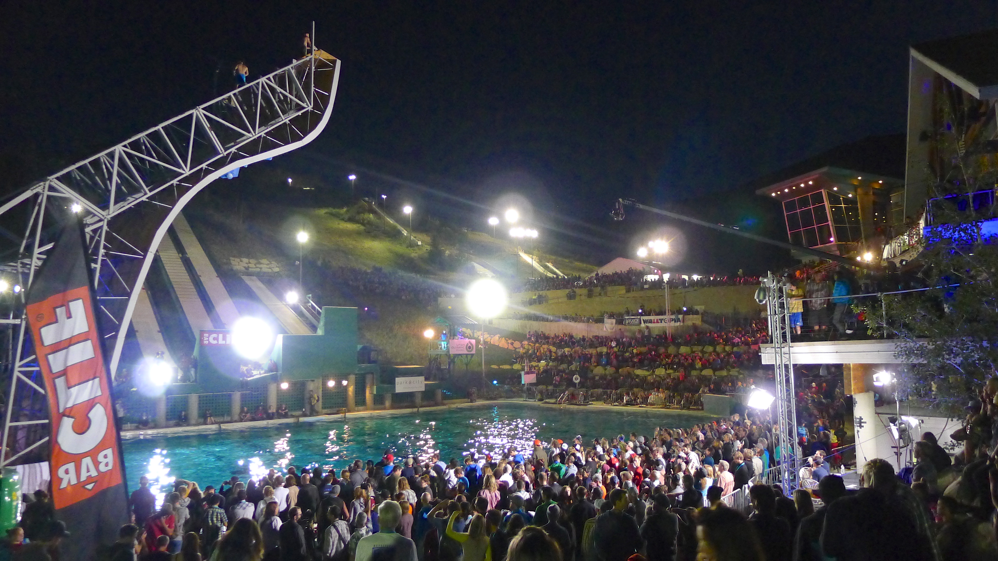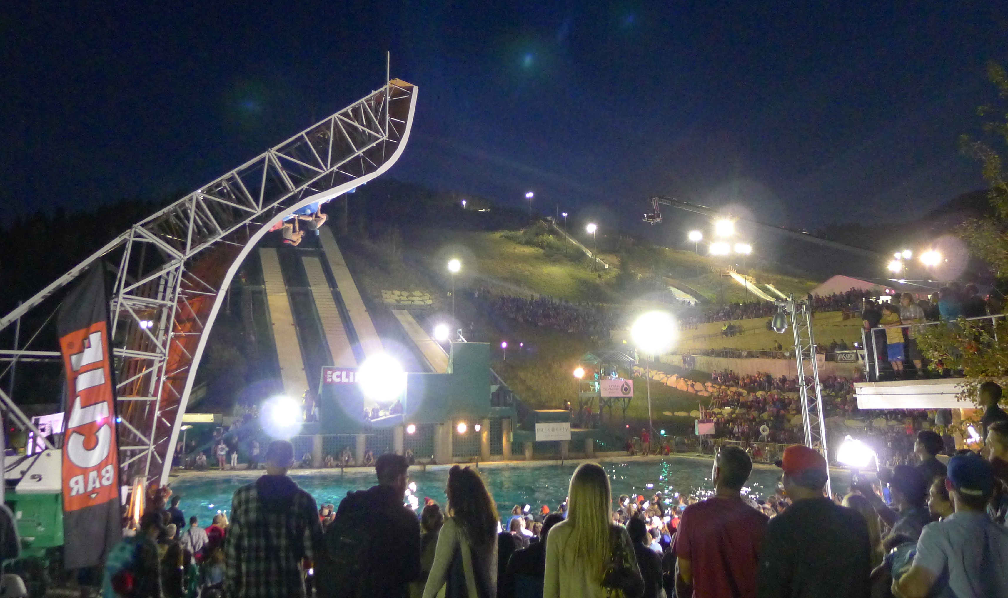 Psico Bloc refers to solo climbing (no ropes!) over a deep body of water. This event would bring the best climbers in the world to compete against each other (with $30,000 in prizes on the line). We’d seen the climbing wall from afar for a couple of weeks, but it’s far more intimidating up close. It was set up on the edge of the pool that ski jumpers use to land in during practice. The wall towered over the water, four stories high, with a significant overhang that meant gravity would be a serious factor in the competition. We snaked our way through food trucks and sponsor tents at the entrance and arrived at the pool just as the female climbers were finishing the heat to determine who would compete in the finals. Their strength was incredible, particularly on the overhang where they swung like monkeys and held on for dear life. Once at the top, there’s only one way down: to JUMP into the pool, 50 feet below. Whoa.