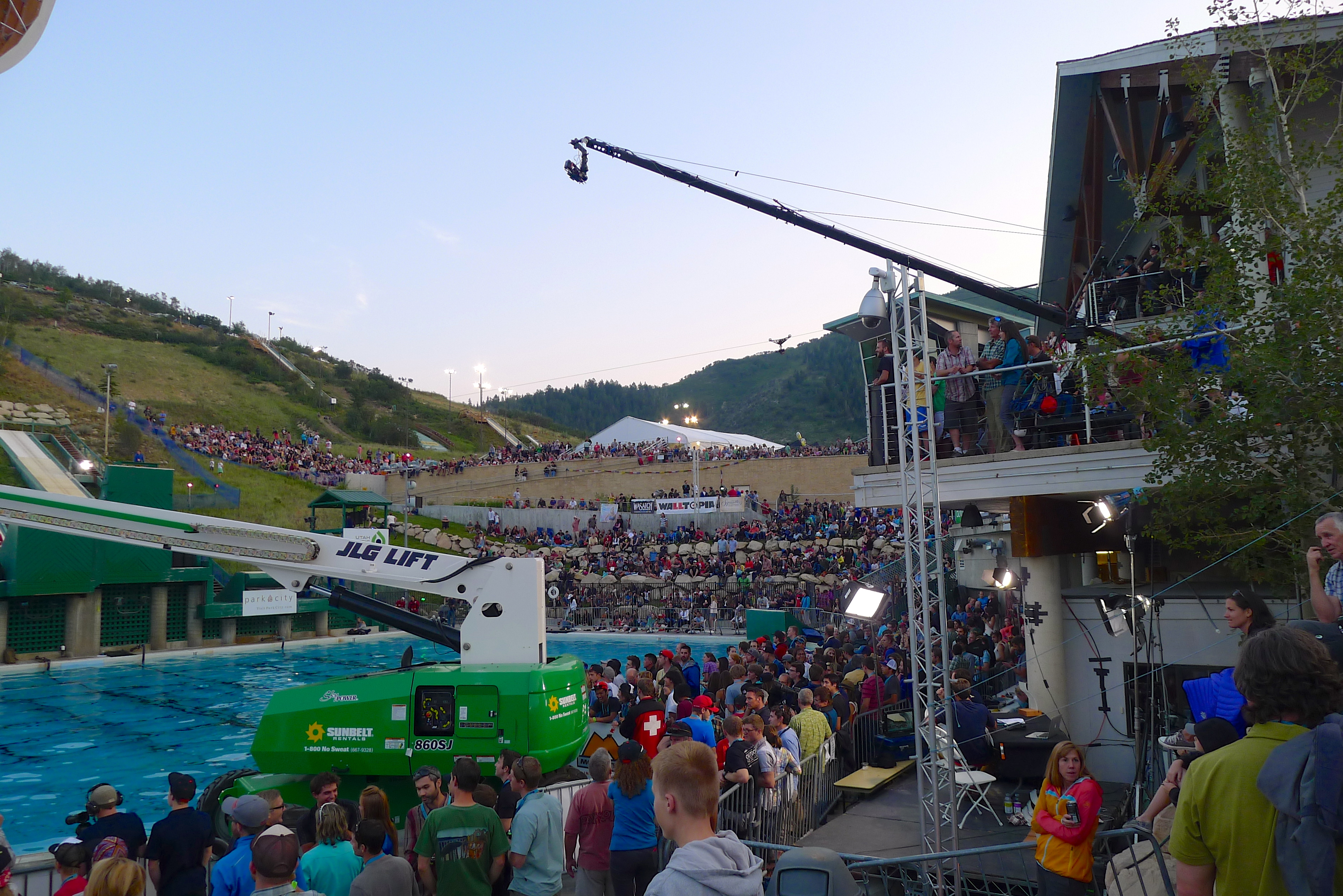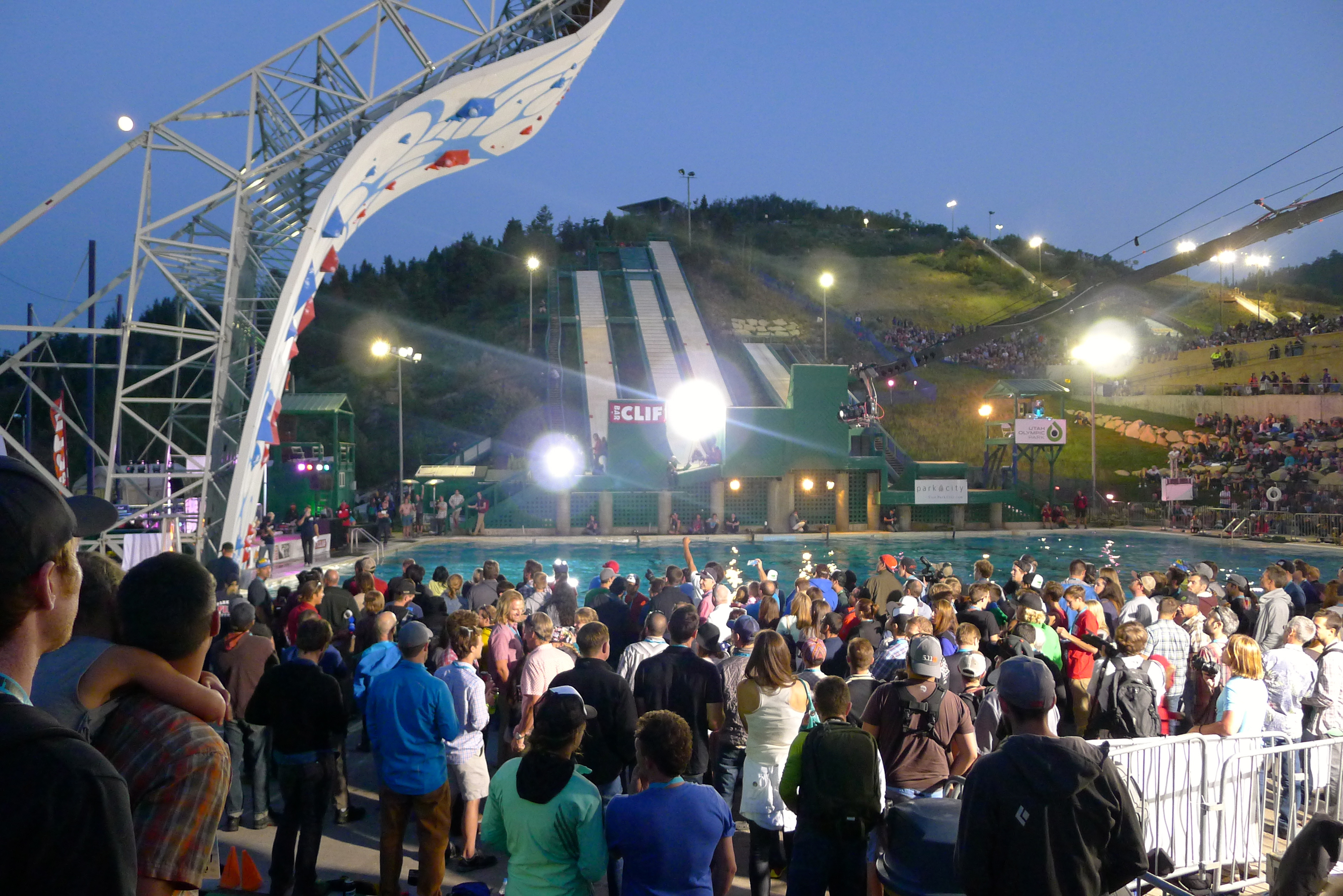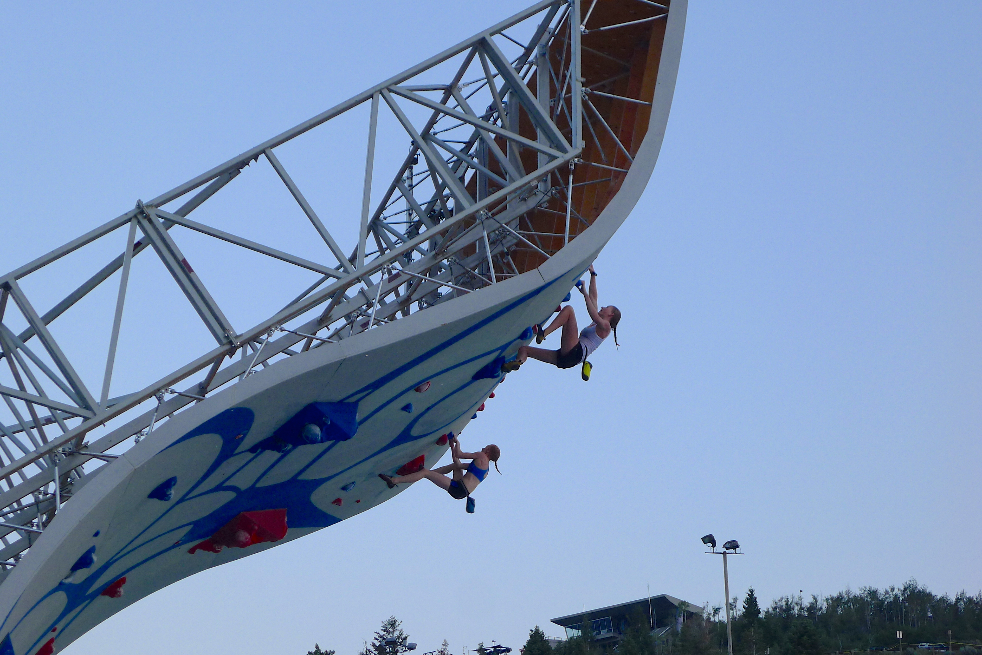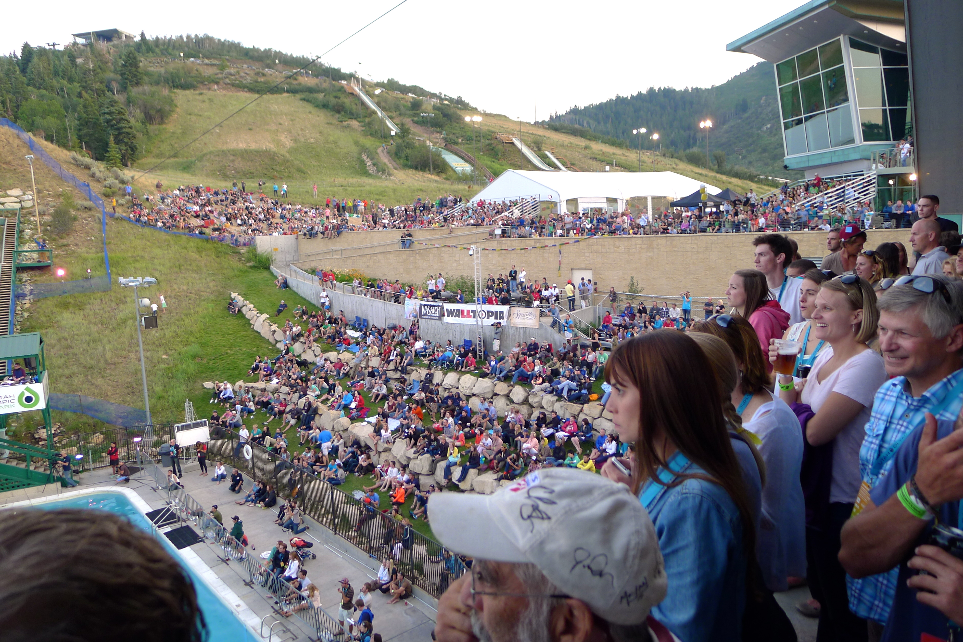Psico Bloc refers to solo climbing (no ropes!) over a deep body of water. This event would bring the best climbers in the world to compete against each other (with $30,000 in prizes on the line). We’d seen the climbing wall from afar for a couple of weeks, but it’s far more intimidating up close. It was set up on the edge of the pool that ski jumpers use to land in during practice. The wall towered over the water, four stories high, with a significant overhang that meant gravity would be a serious factor in the competition. We snaked our way through food trucks and sponsor tents at the entrance and arrived at the pool just as the female climbers were finishing the heat to determine who would compete in the finals. Their strength was incredible, particularly on the overhang where they swung like monkeys and held on for dear life. Once at the top, there’s only one way down: to JUMP into the pool, 50 feet below. Whoa.
