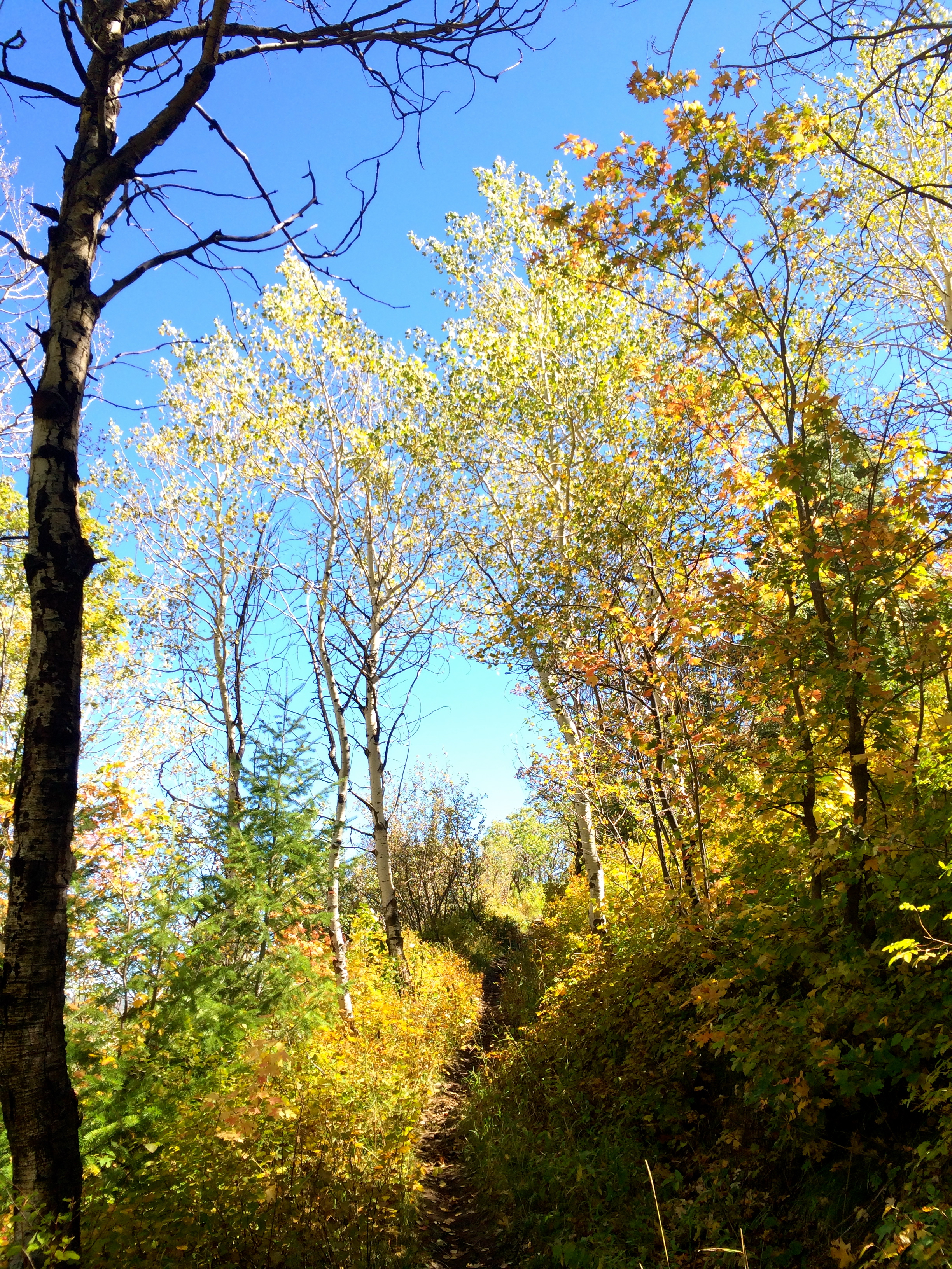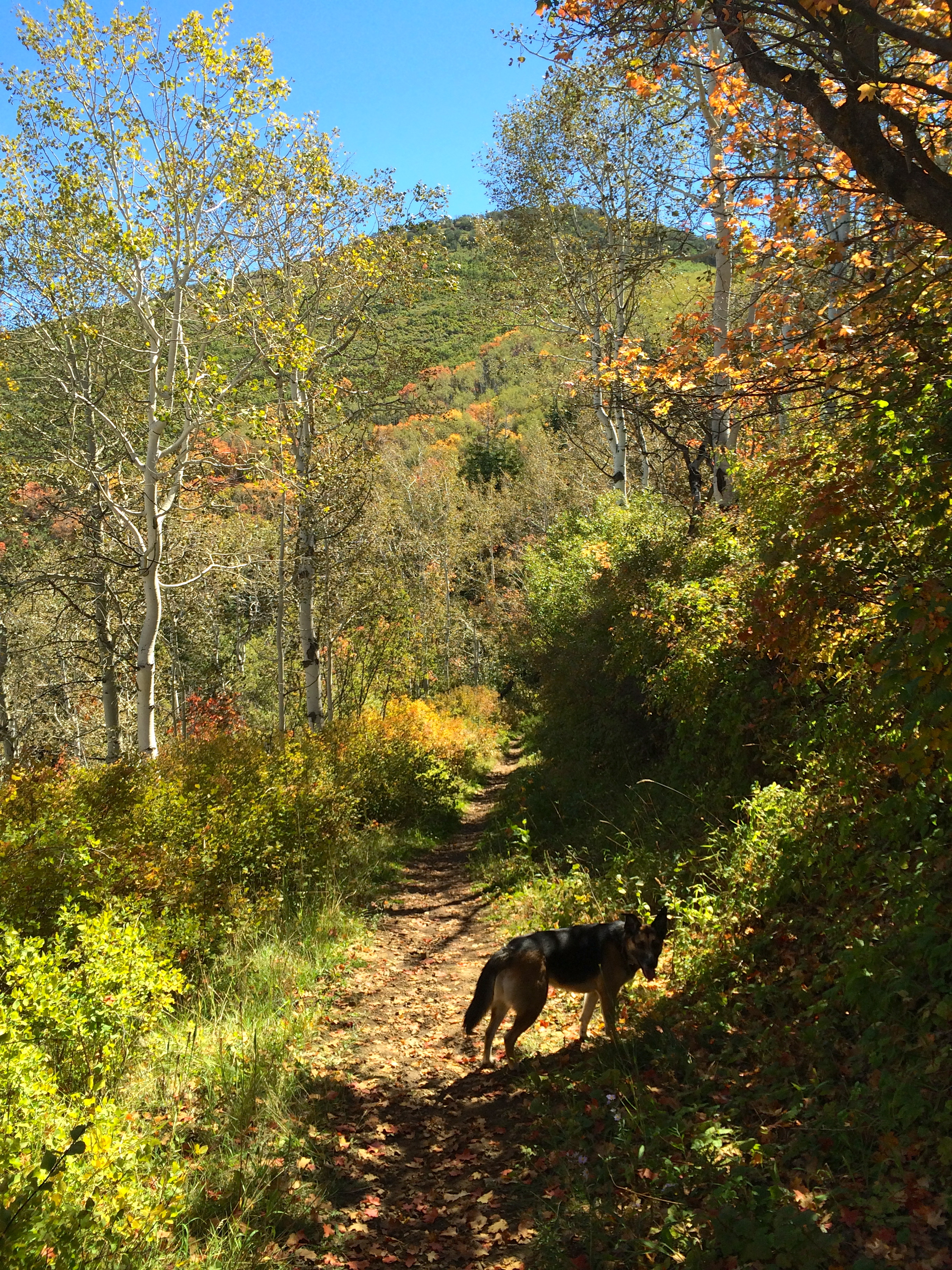 I’ve been drawn to the color, needing to get out IN IT, so I went exploring in the Pinebrook neighborhood yesterday. The Spring Trail was tacky, still damp from recent rains but not too muddy. I walked over a carpet of fallen leaves- sometimes golden, sometimes rust, sometimes crimson in color. There was not a cloud in the sky, but under the canopy of aspens and maples and oak, I needed a warm layer. Senses that have been dormant all summer were nudged awake. Aside from a small pack of mountain bikers, Cholula and I had the trail to ourselves to explore and inhale and soak in, daydreaming about the season ahead and all it will bring.