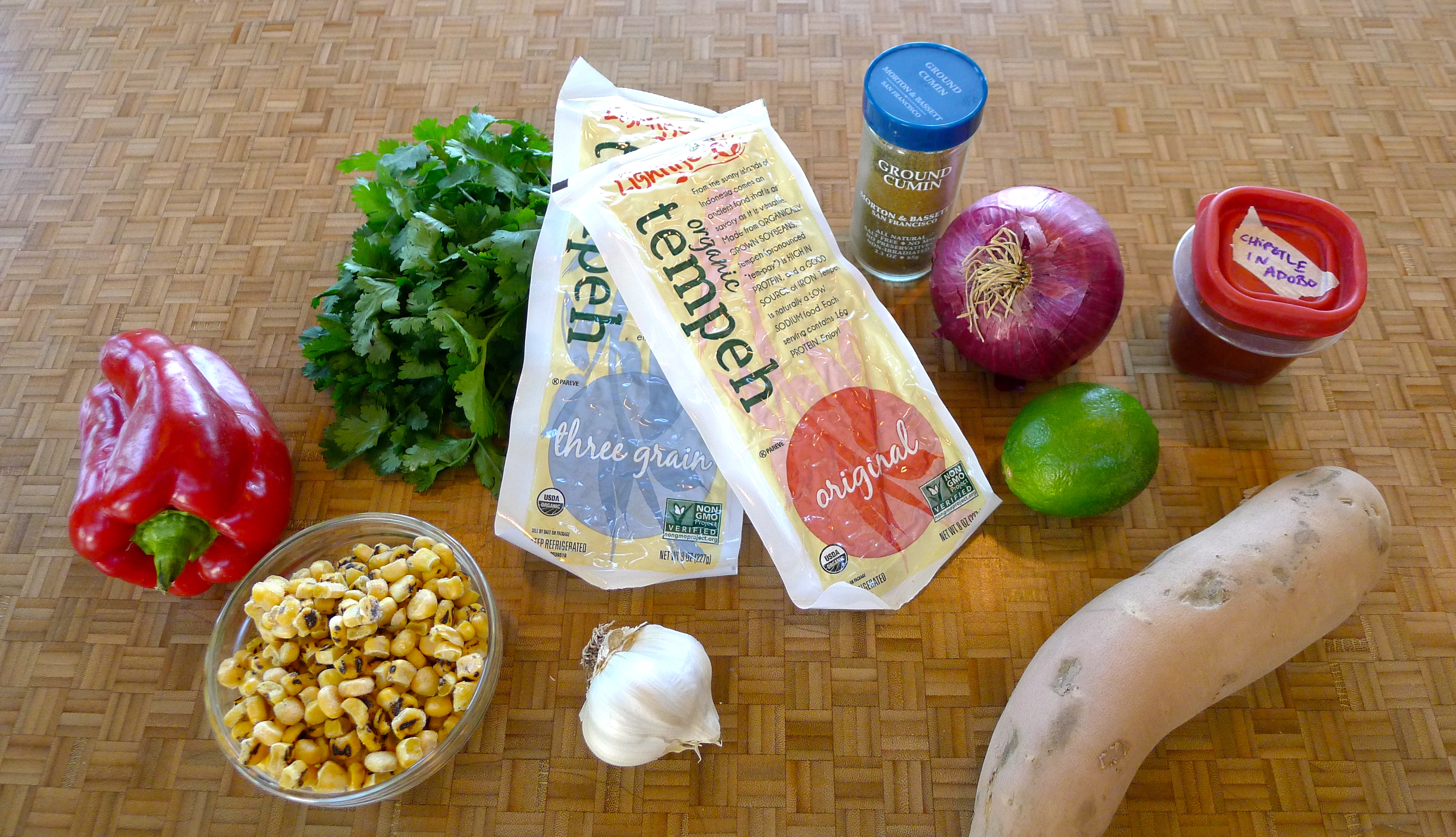 Crumble the tempeh into a bowl. Swirl some olive oil in a pan on the stove at medium heat. Add the onion, garlic, and bell pepper. Sauté until the onion is translucent. Add the cumin and stir. Add the crumbled tempeh, the chopped chipotle peppers, and two spoonfuls of the adobo sauce. Saute for at least five minutes, stirring often. Add corn, sweet potato, and cilantro and cook until warmed through. Serve with charred tortillas and toppings of your choice. Cheers to Meatless Monday! Yum.