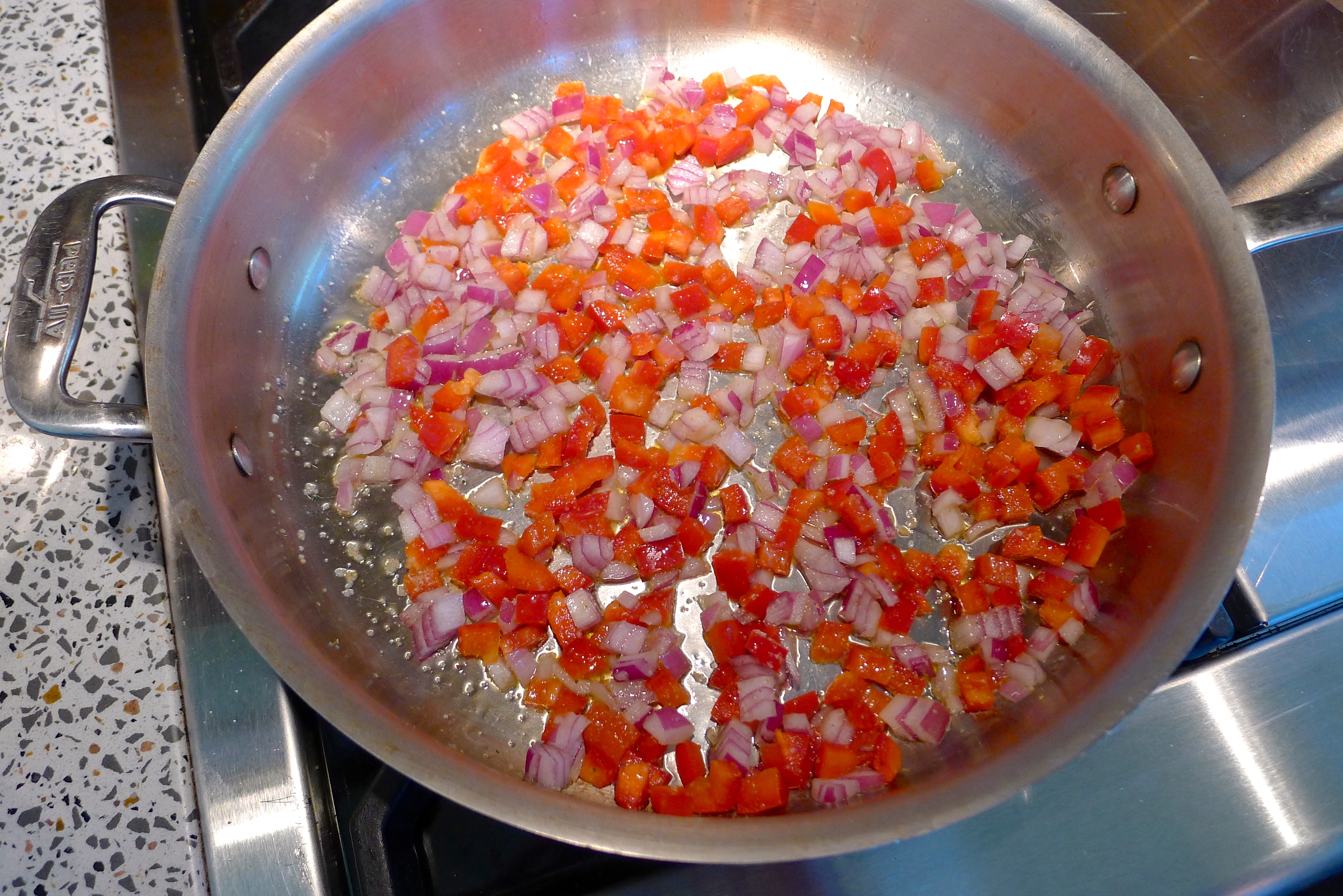 Similar to tofu, tempeh is relatively bland and needs some doctoring up to be delicious. A few chopped chipotle chiles and some of the adobo sauce would give the tempeh a flavor boost. I also finely chopped some red onion, bell pepper, and garlic to sauté into the taco filling. I peeled and chopped up half of a sweet potato, tossed it in a little olive oil and chile powder, and roasted it. The last filling item was some frozen fire-roasted corn, thawed.