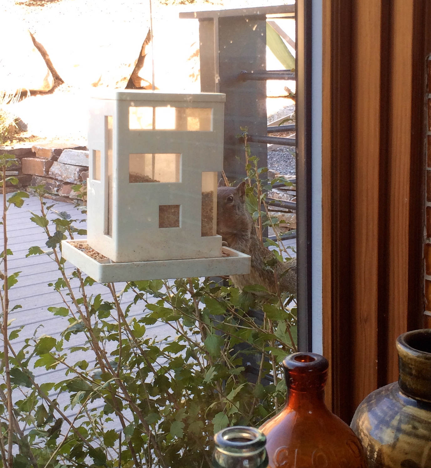 Please note the squirrel hanging off the railing, with very full cheeks, emptying my bird feeder (again).