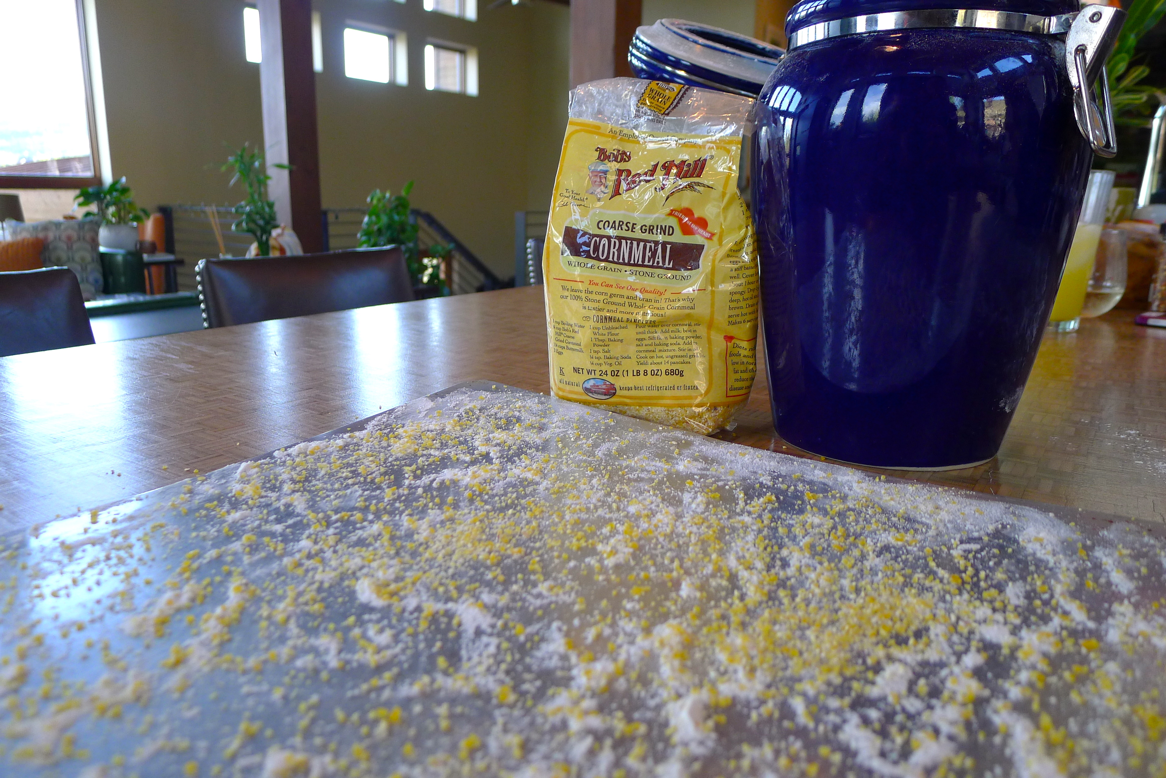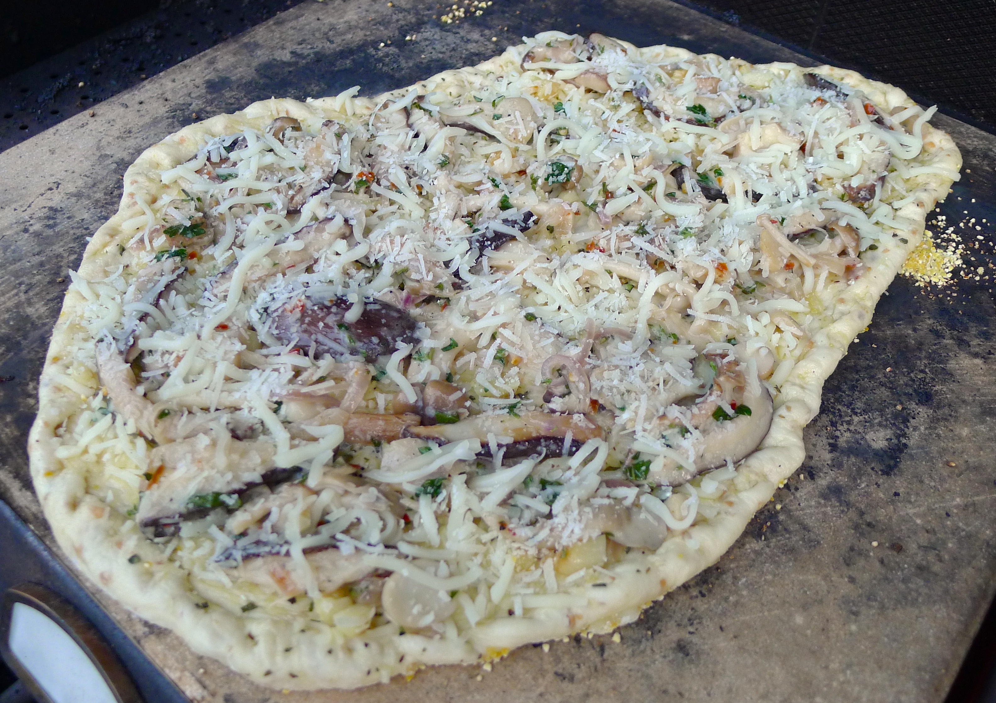 Heat a pizza stone on a grill at 500 degrees (or in the oven at 450). Generously flour the counter, cut the ball of dough in half, and roll the dough into a thin crust. Transfer the crust to a sheet pan that has been dusted with flour and a lot of cornmeal. Crimp the edges of the crust.
