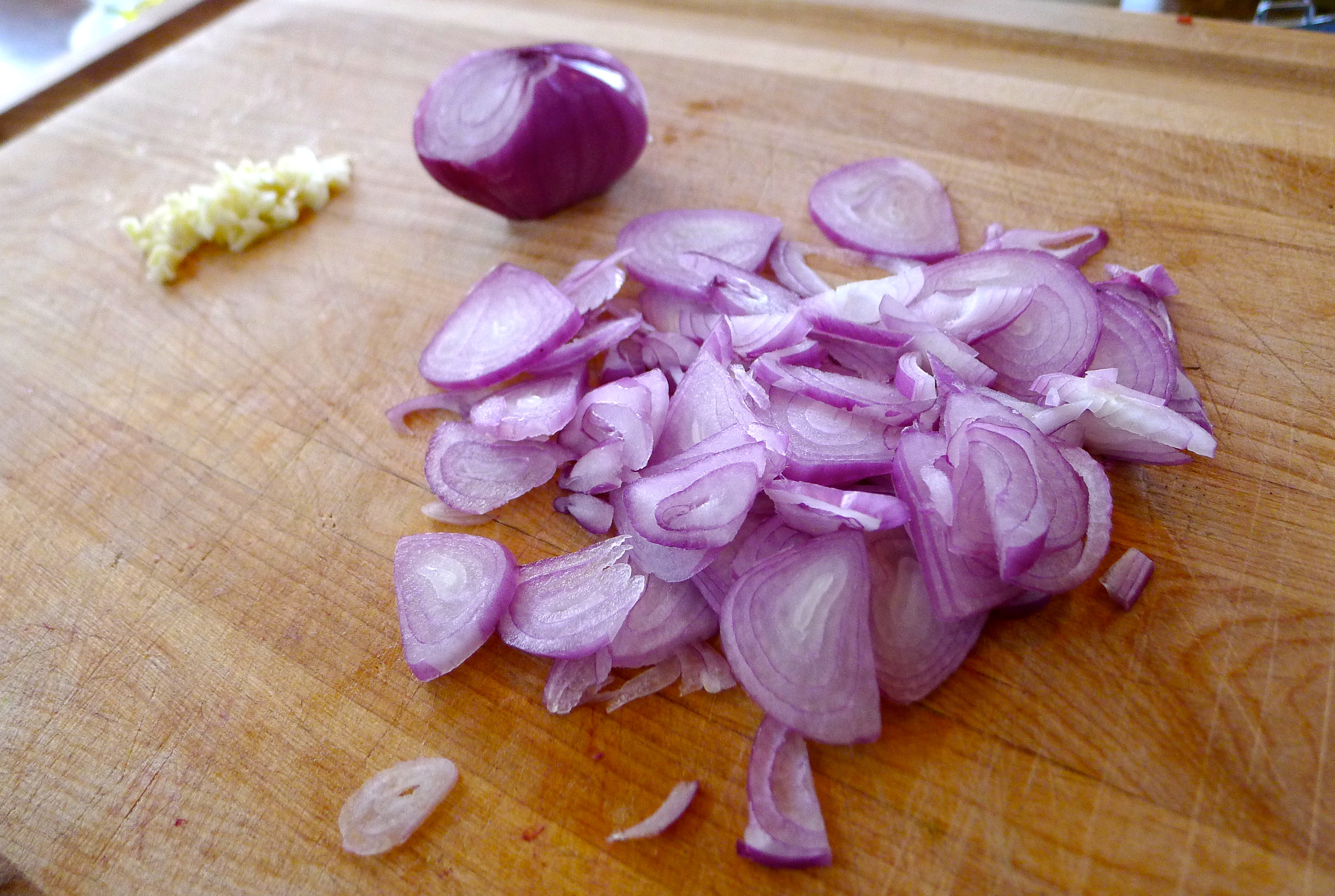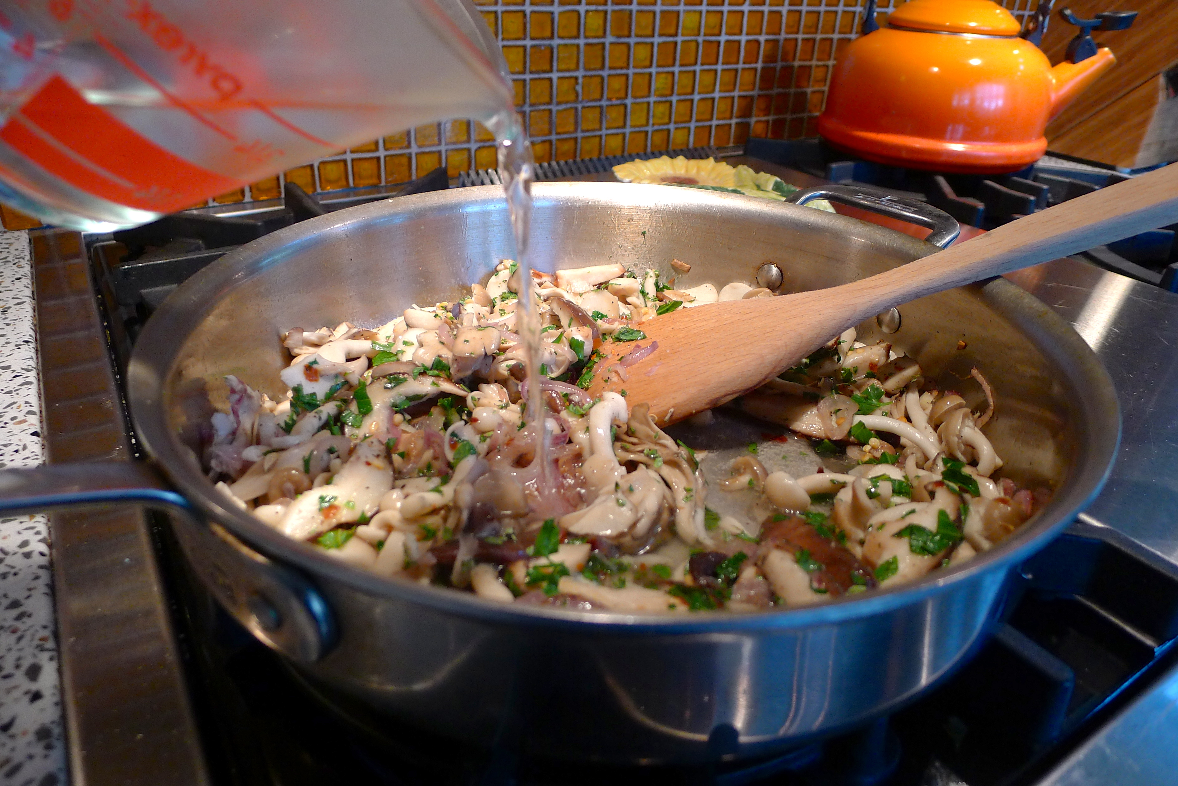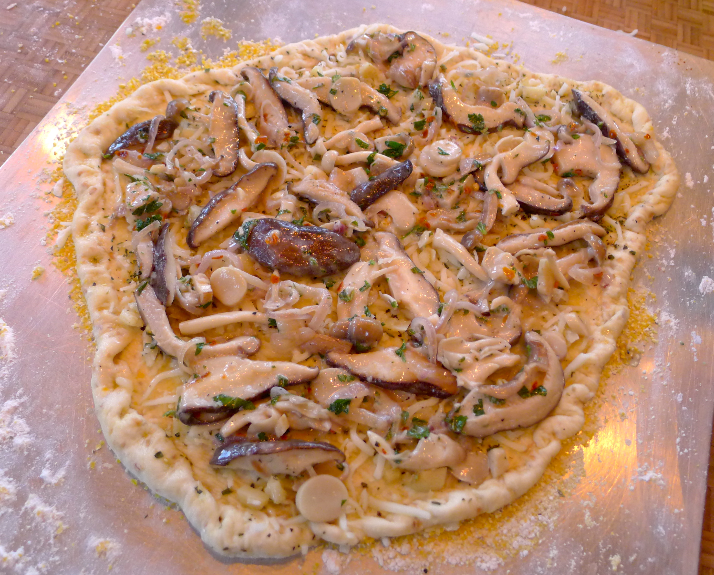 Look at these beauties! I chose a “Chef’s Selection” bunch of mushrooms that included clamshells, little enokis, maitakes, and king oysters mushrooms. I added some big shiitake mushrooms to the mix. Any mushrooms would work; I like the differences in texture. I chopped the bigger mushrooms into bite size pieces and sliced a large shallot while John prepped the pizza dough.