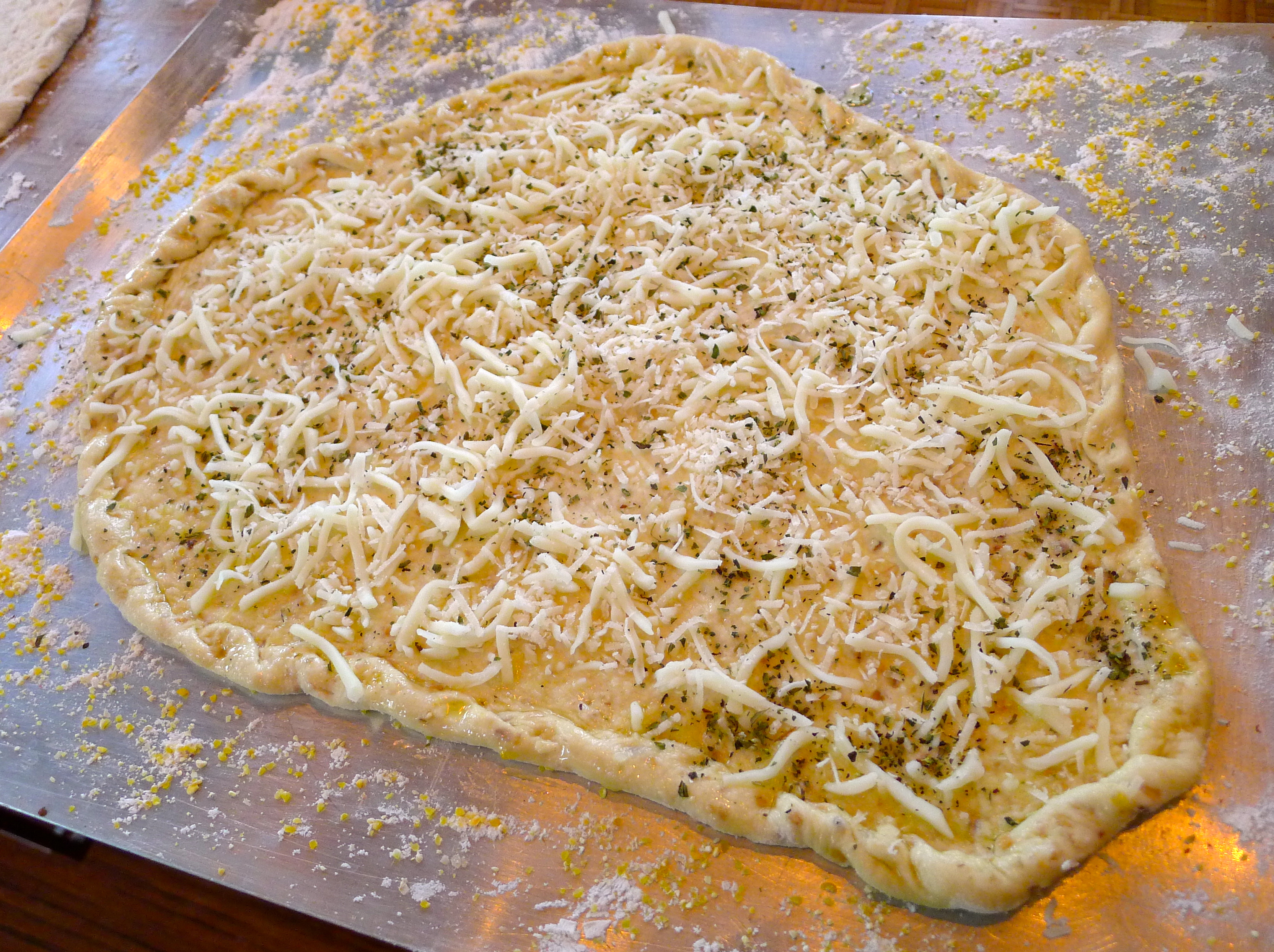 Let’s make a pizza! After brushing the entire crust with olive oil, I sprinkled a light layer of mozzarella cheese. I also added some dried oregano. Next came the roasted garlic.