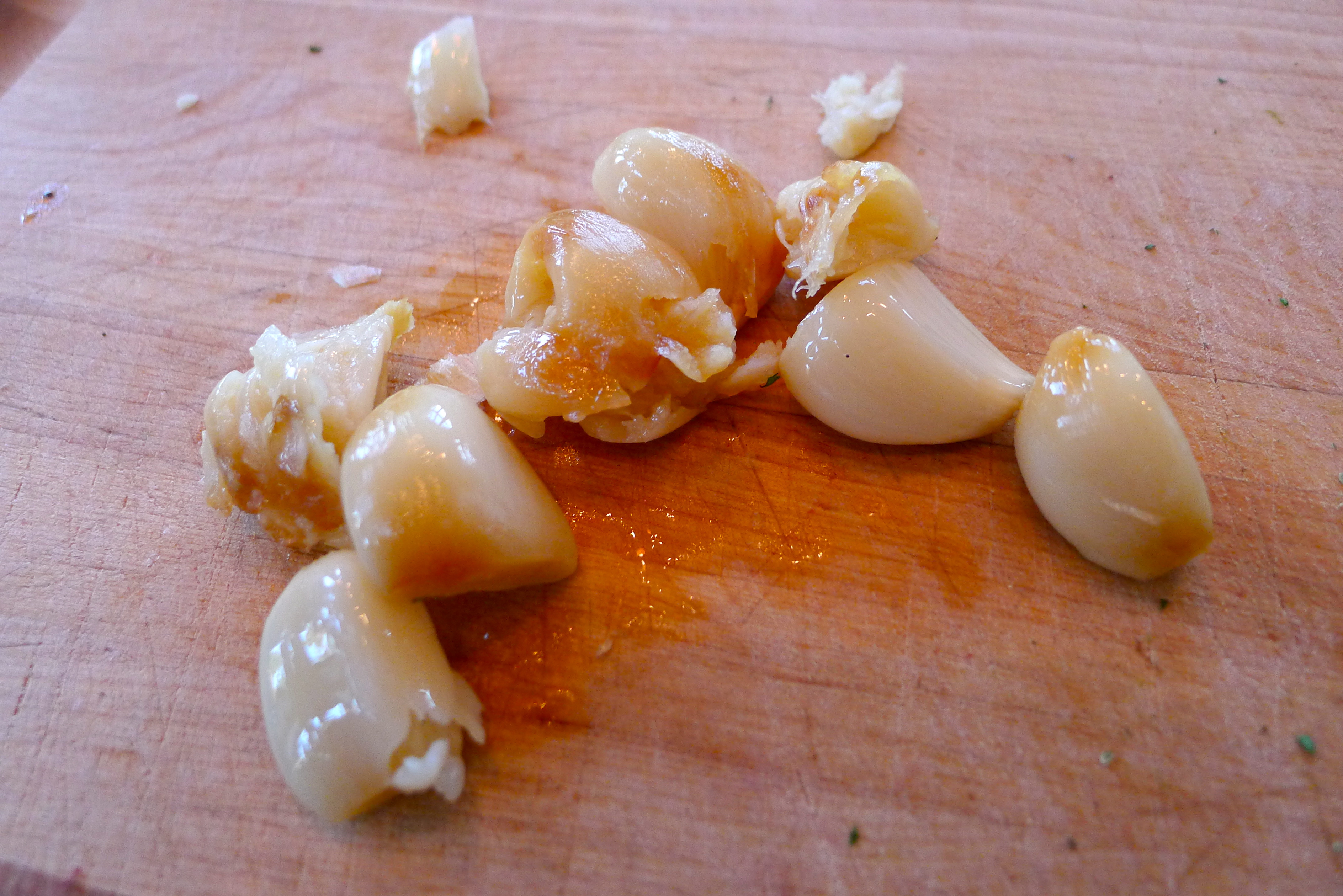 We’ve been using Whole Foods wheat pizza dough all summer. While it was rising in a bowl, I started by roasting a head of garlic. Roasting garlic makes it buttery and brings out a sweetness that is delicious. I cut off the top of the head of garlic, dipped the cut side in olive oil for a while, then wrapped it in foil and let it roast for about 25 minutes in a 450 degree oven. When it’s done, the garlic cloves are soft and can easily be pushed out of the peel.