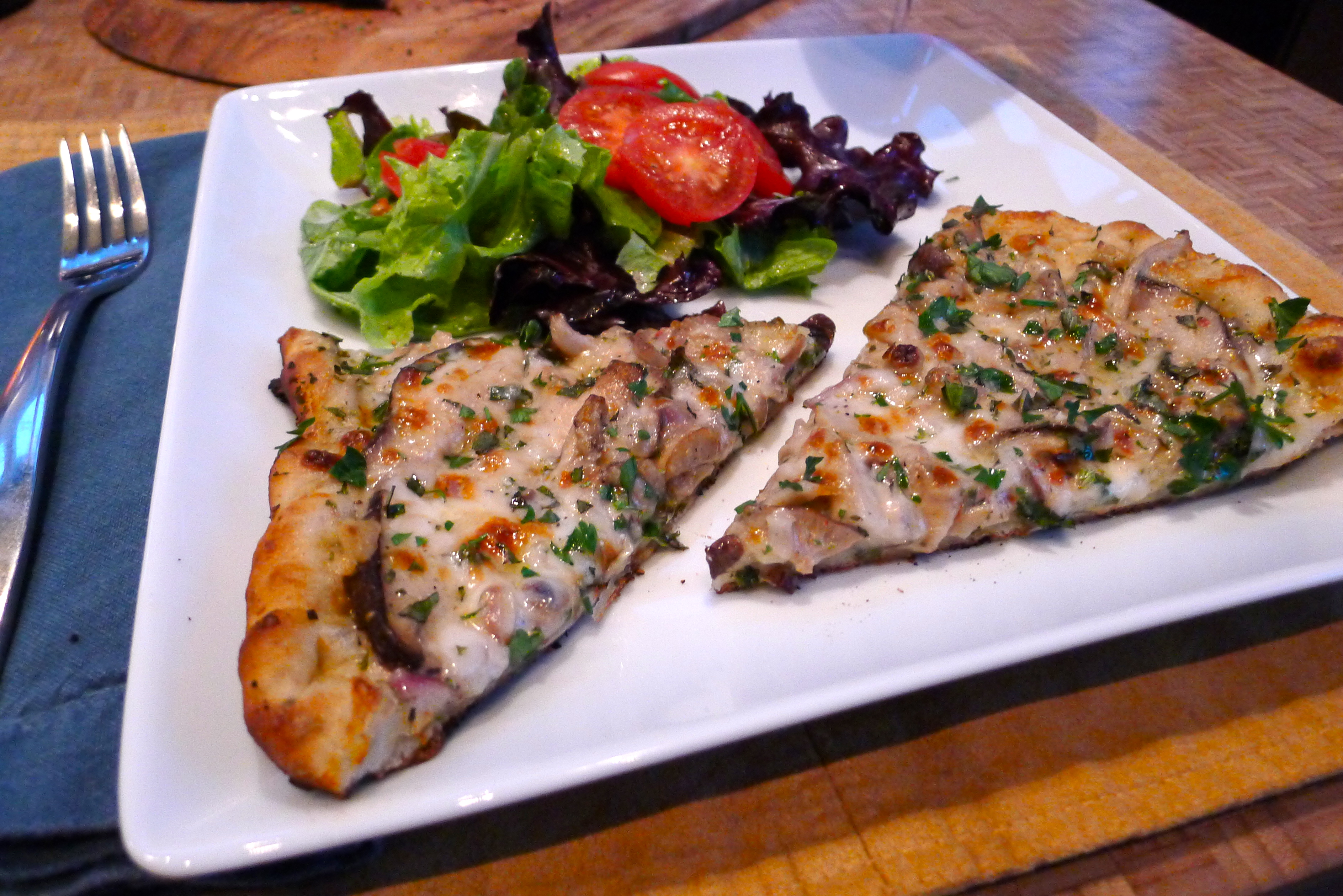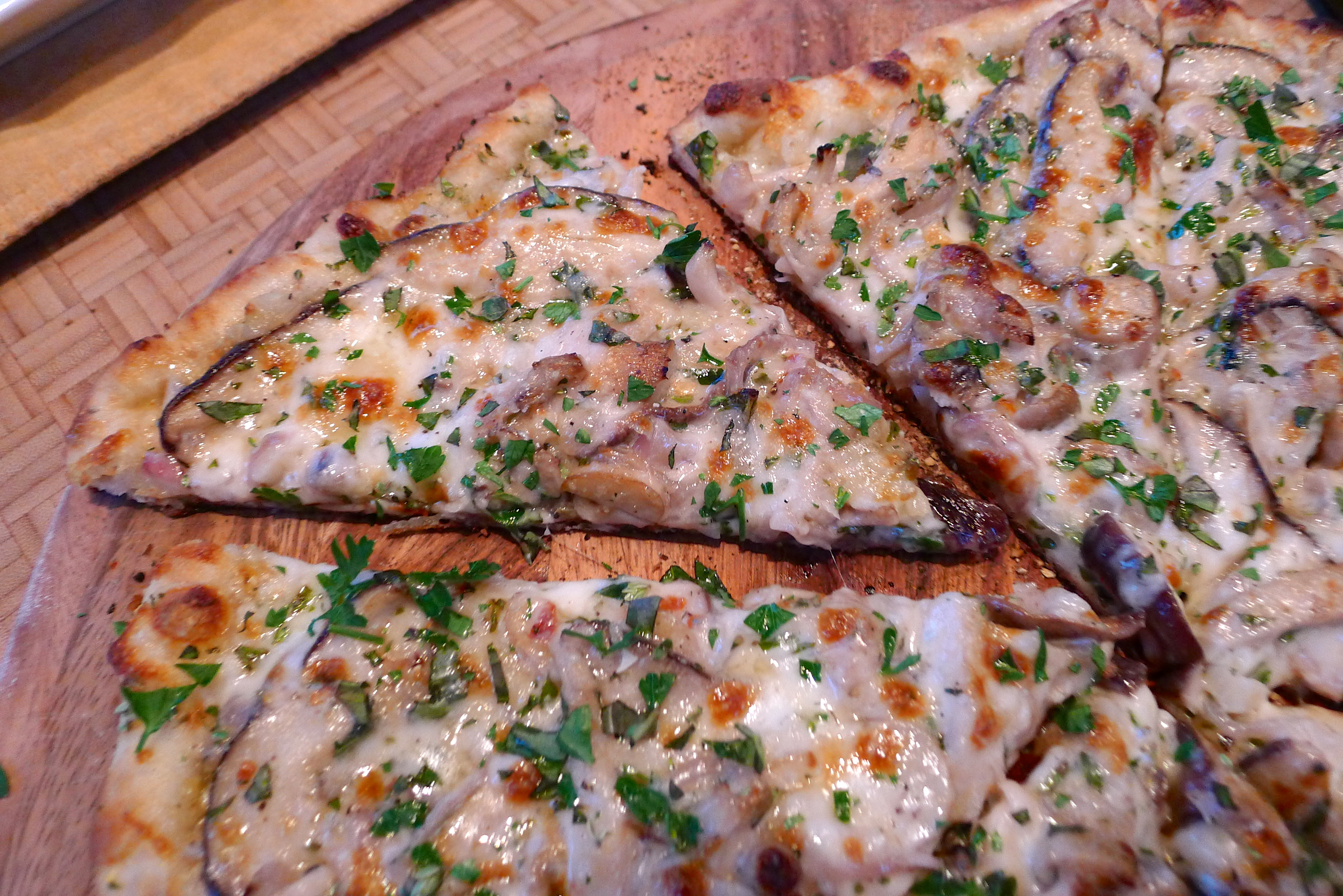 It was his idea to turn this fungi fusilli into a fungi flatbread. We’ll put anything on a pizza, and I figured the mushroom sauce for the pasta would work right on a pizza crust. I love taking one kind of food and applying it to something completely different (like Mexican pizza or Thai tacos). So we tried it!