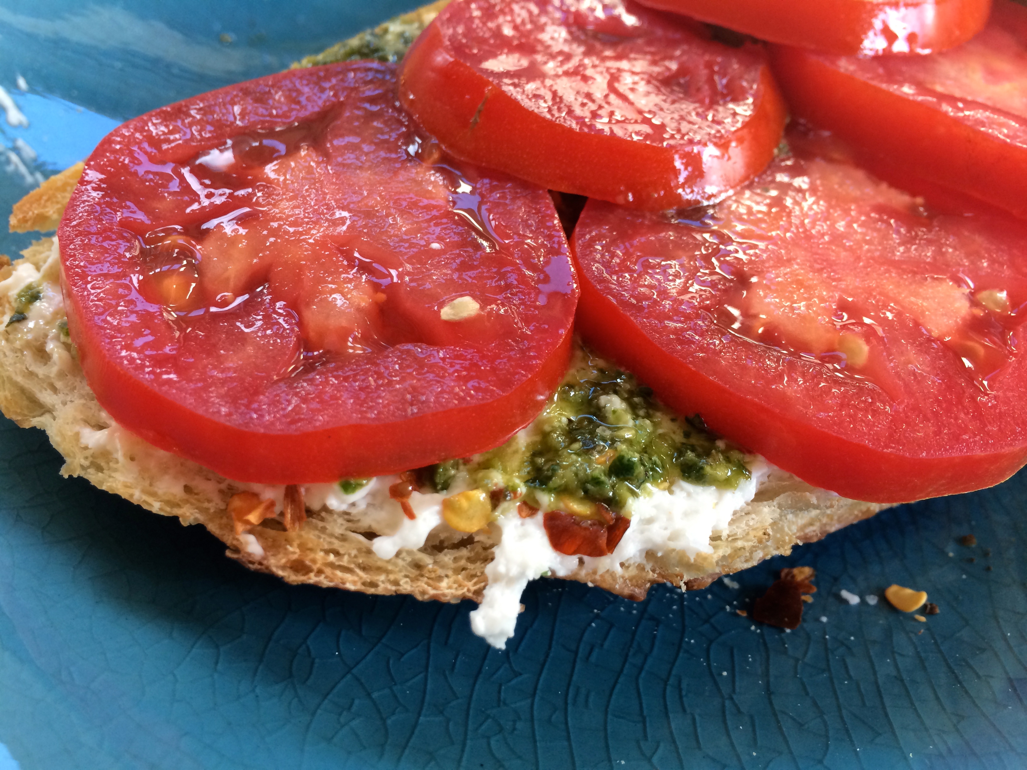 And this morning, I made delicious cream cheese pesto tomato toasts with goodies from the garden.