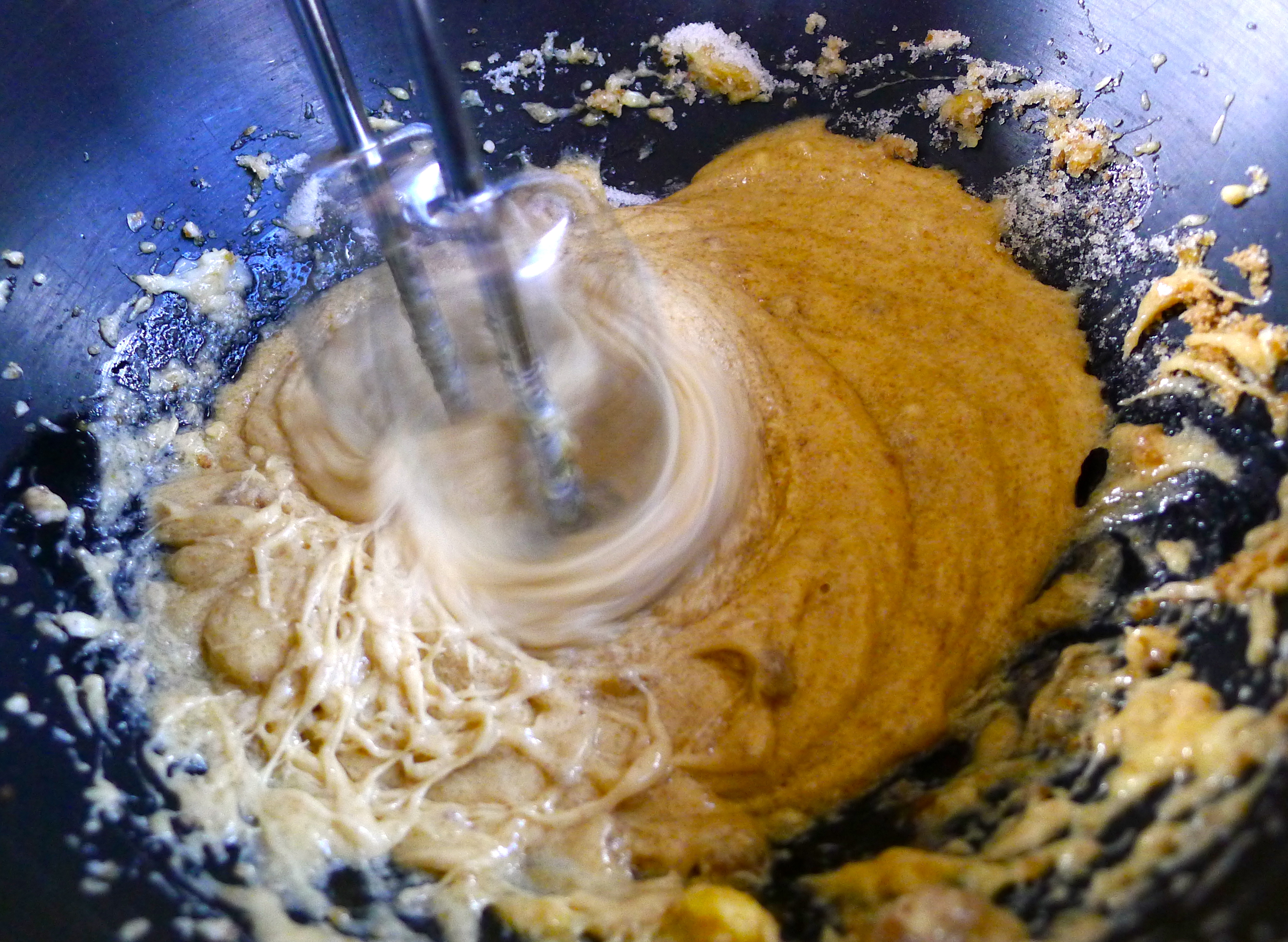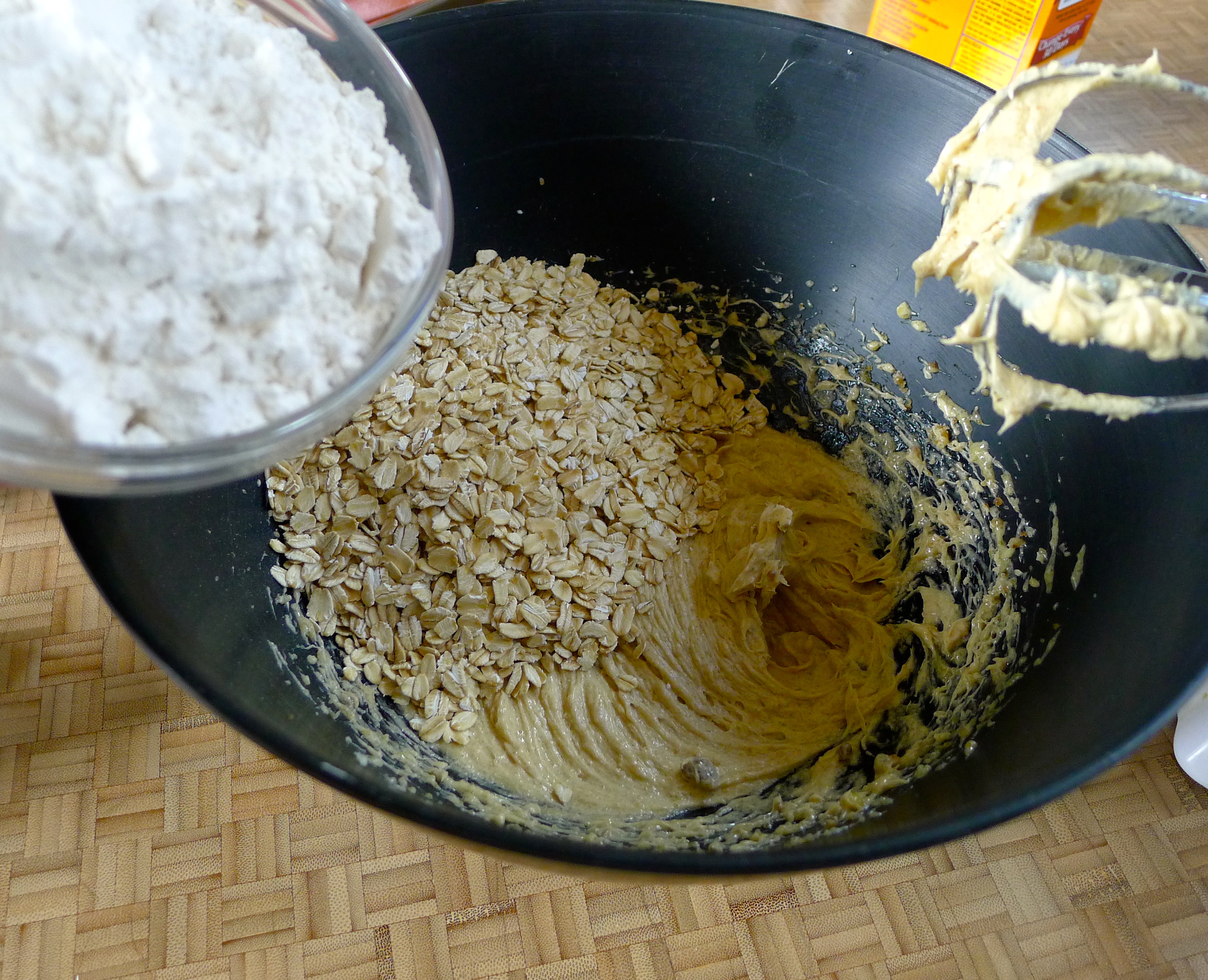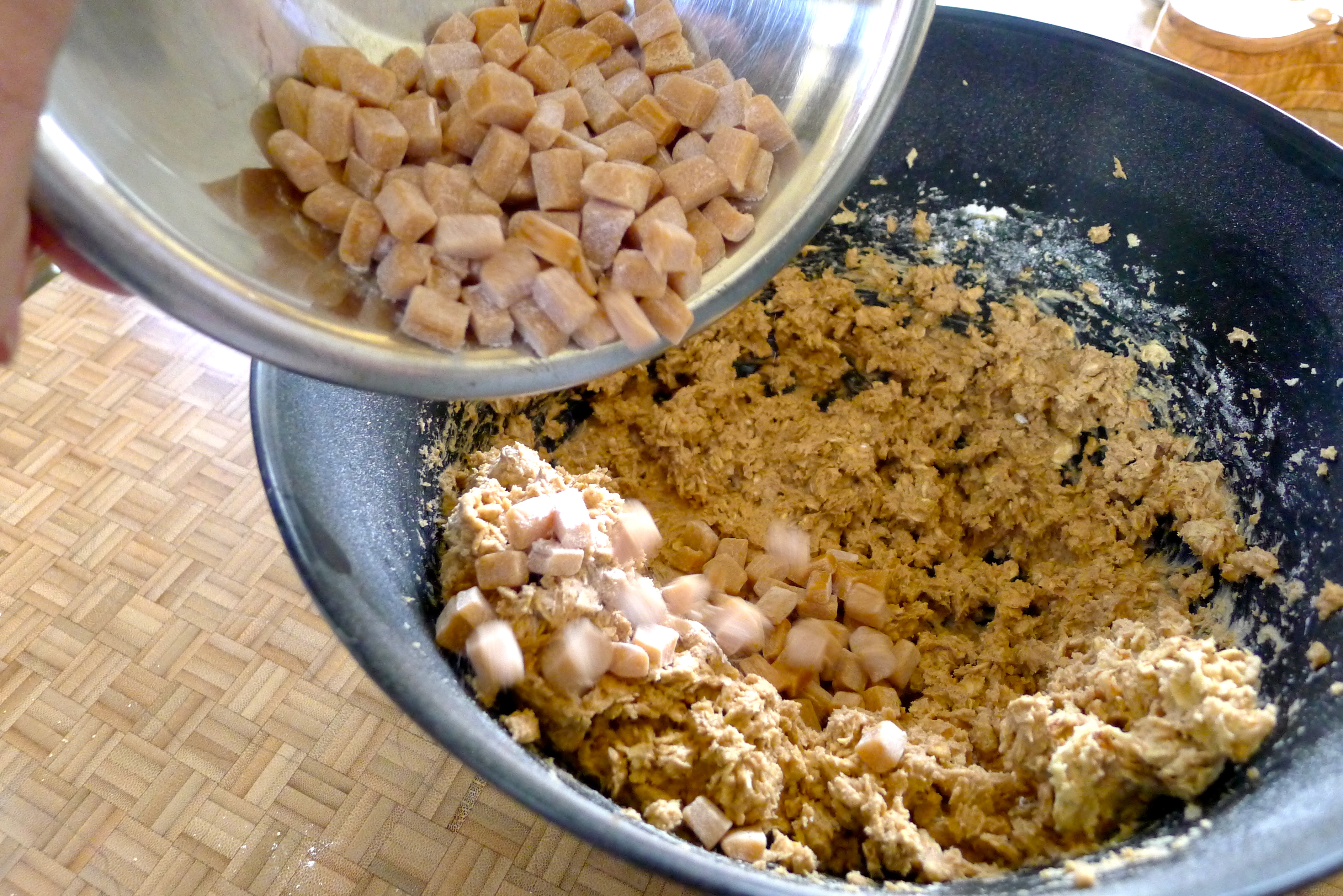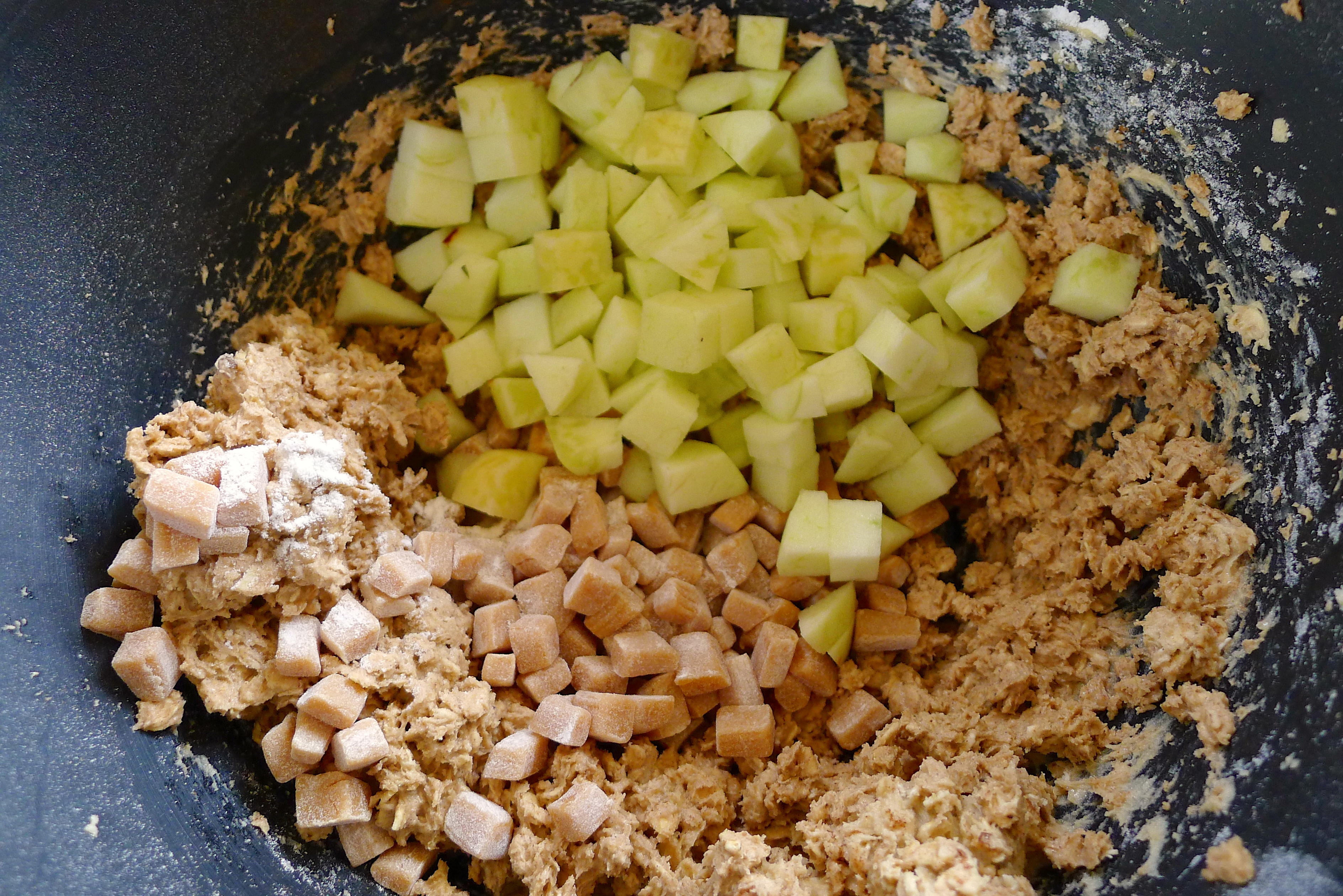 To begin, I blended the wet ingredients with a hand mixer. In stages, I added the oats, flour, spices, baking soda, and salt. Last, I stirred in sweet chunks of apple and caramel, both chopped into chunks about the size of a chocolate chip.