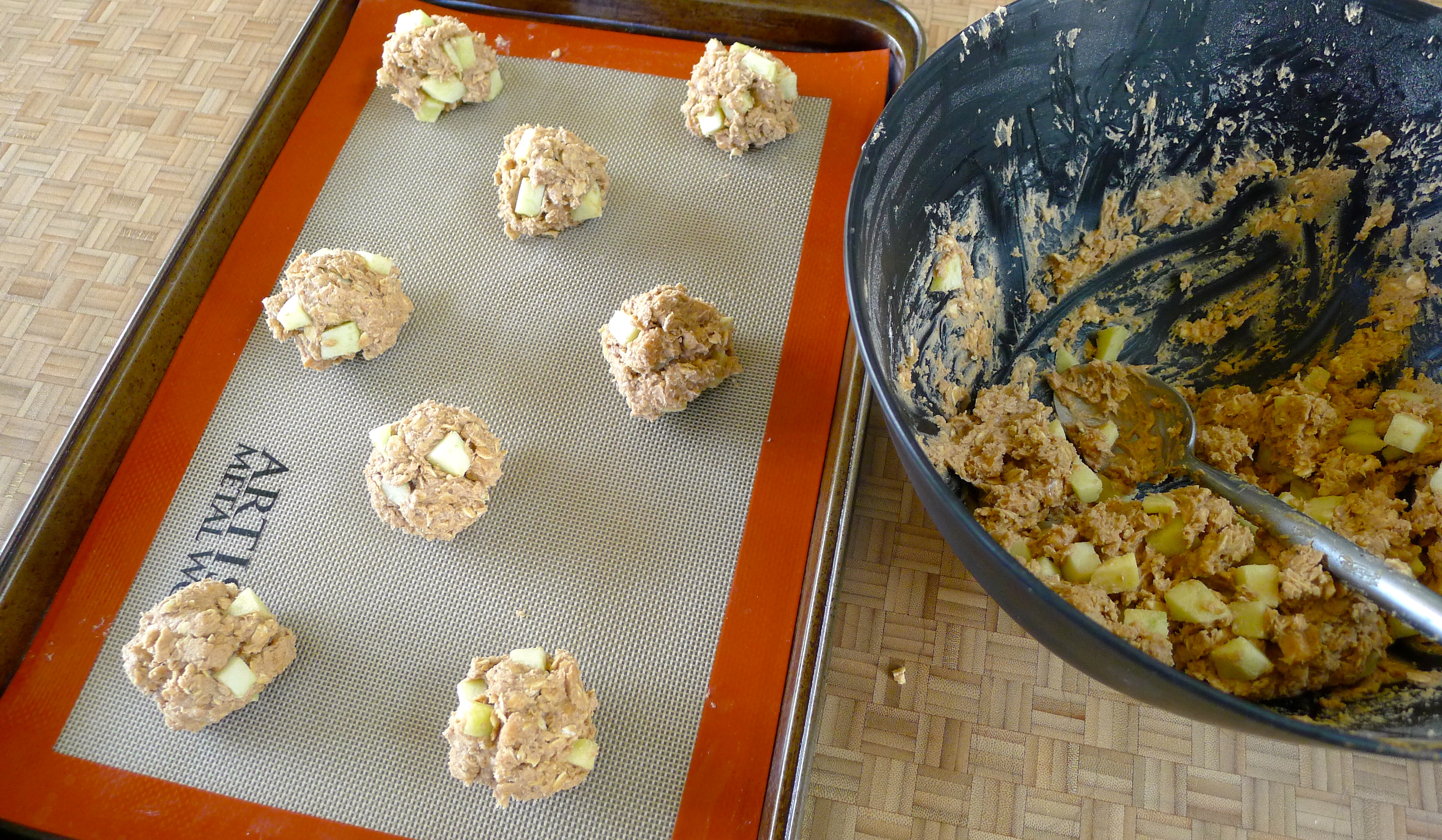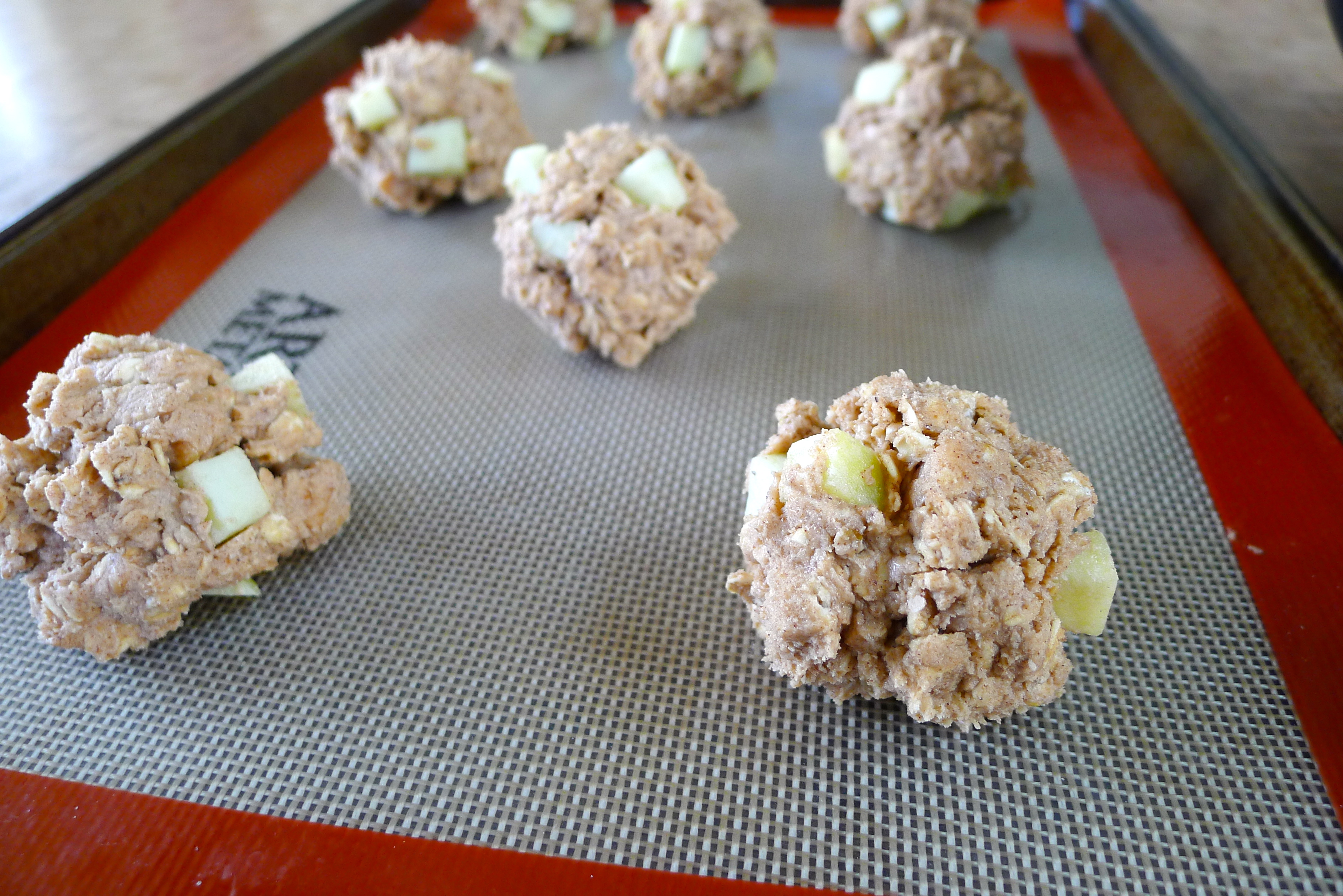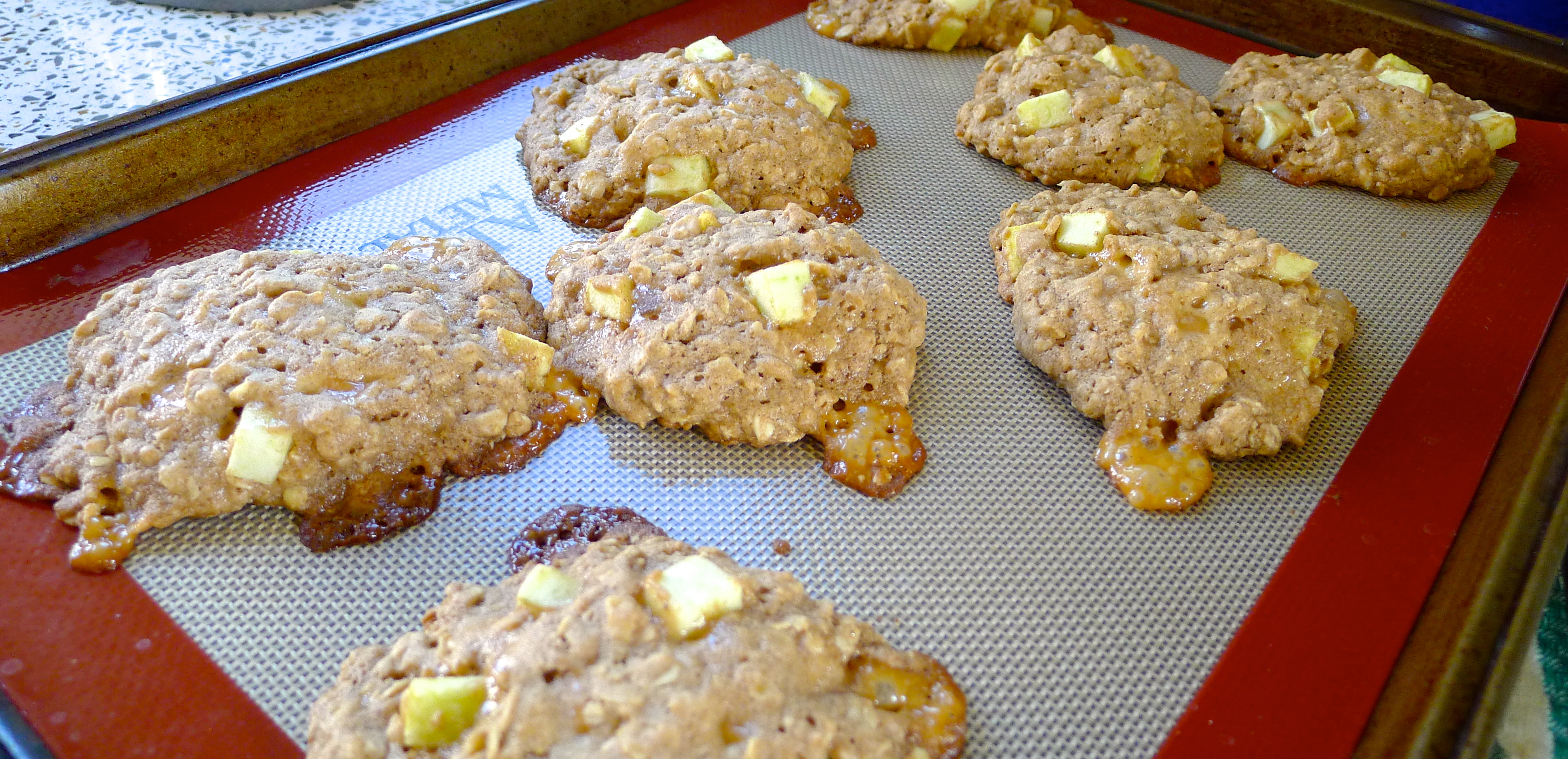 Before baking, I chilled the dough for a half an hour in the fridge. I’ve learned that this helps the cookies spread less while baking. I used a silicone mat under the cookies to help with clean-up. The aroma in the kitchen was a heavenly blend of warm cinnamon and apple pie!