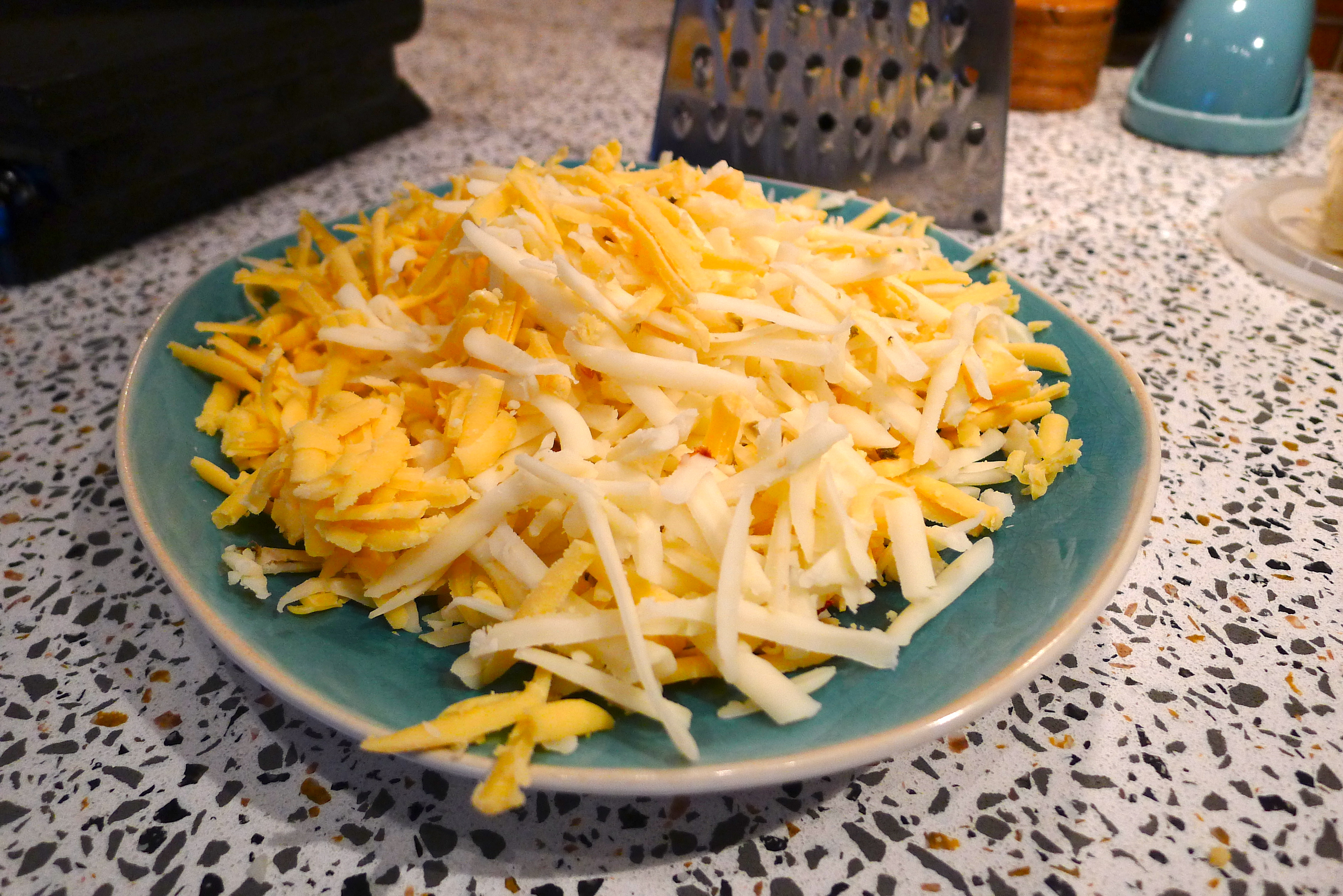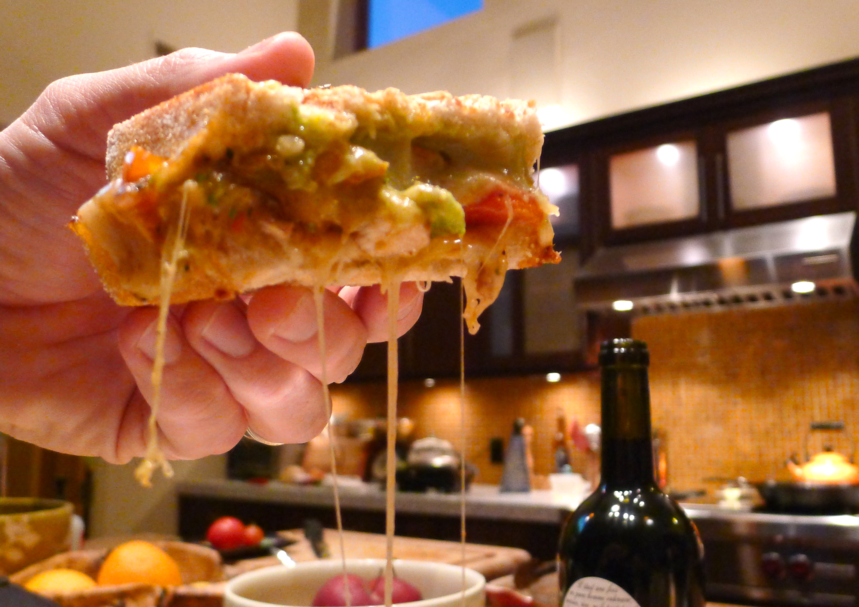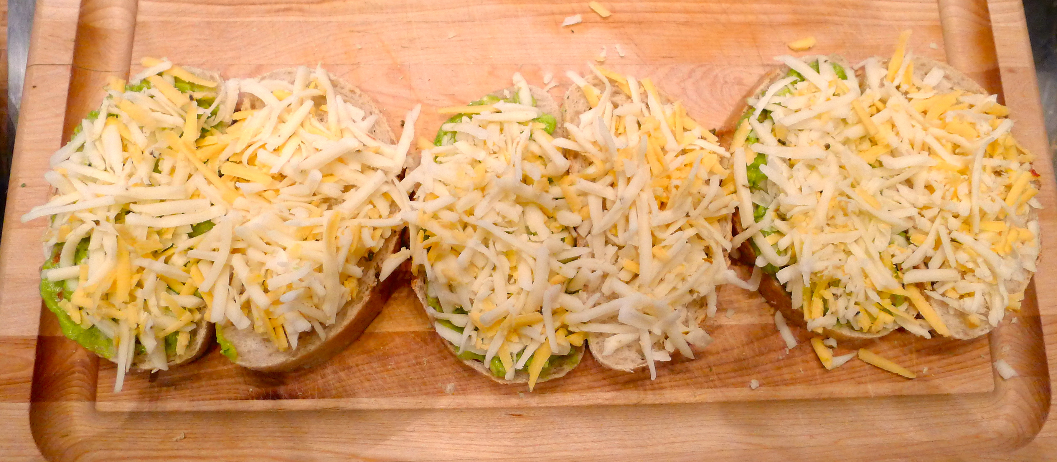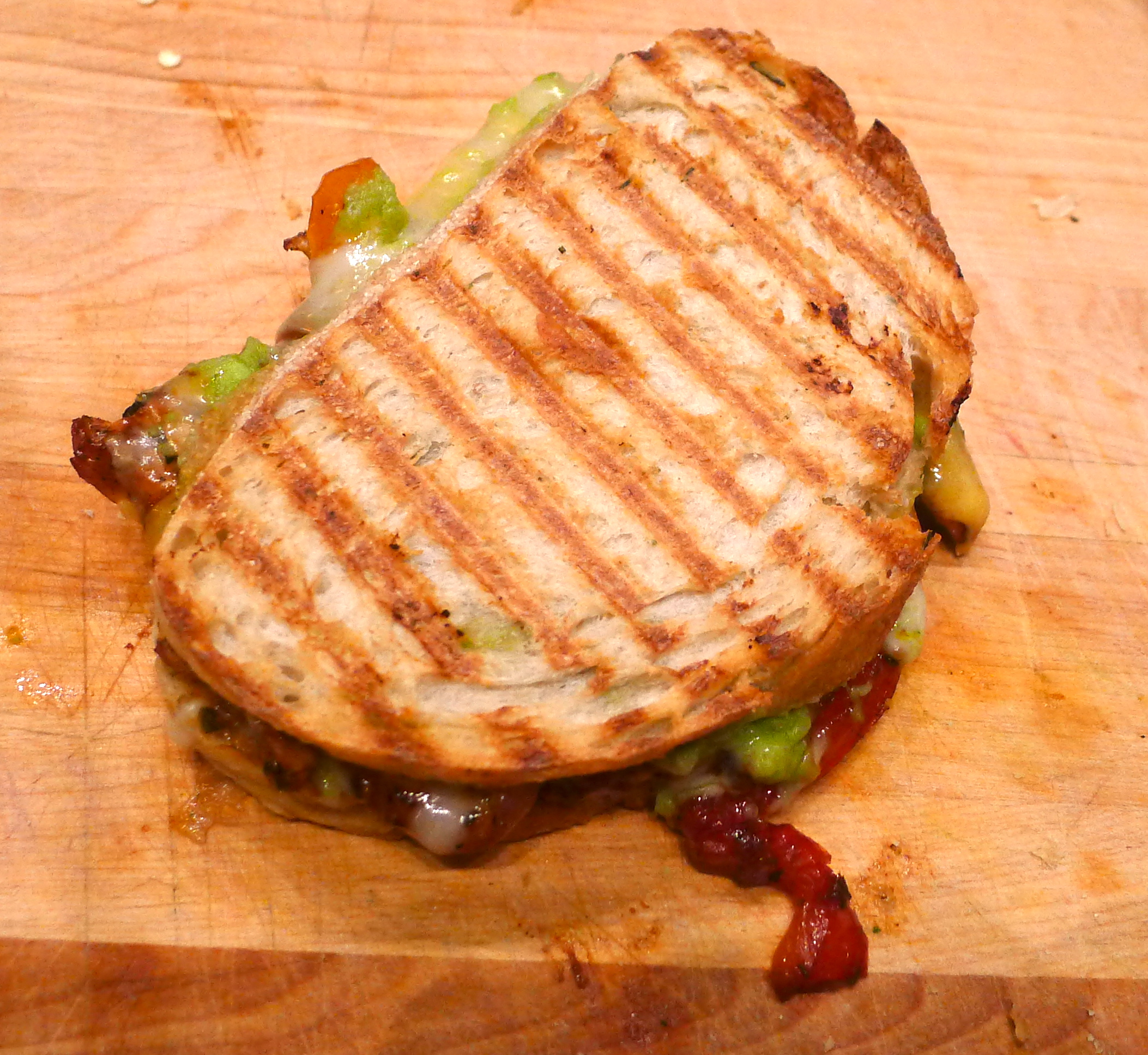 Normally, you’d take a tortilla and scoop some fajita mixture into it. You might top it with guacamole or cheese before diving in. But this is where we go Italian. I sliced up some good bread and warmed up the panini press. I shredded cheddar and pepper jack cheese and opened some locally made guacamole. Let’s make a panino!