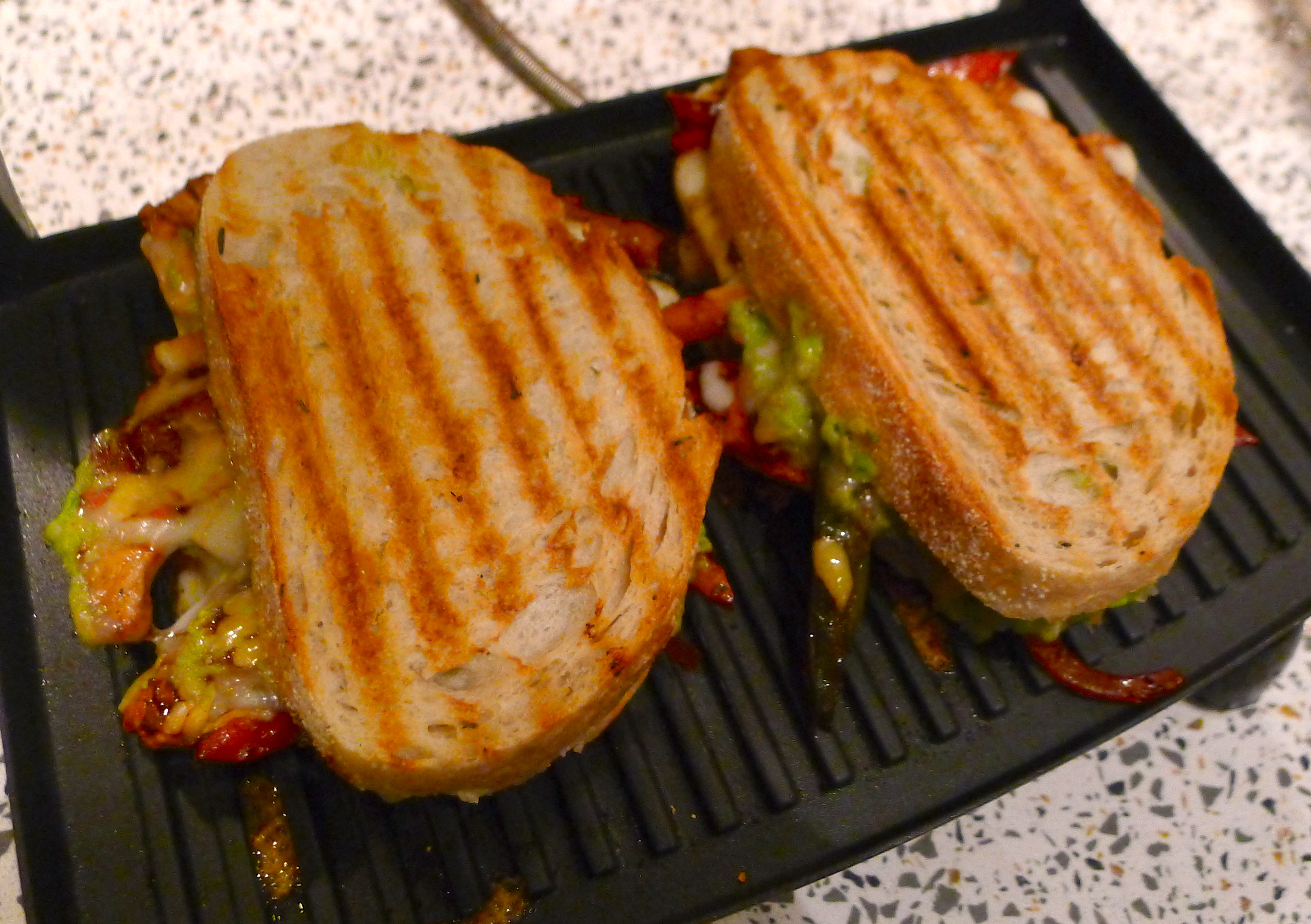 Fajitas should ALWAYS go in a panino. They were scrumptious! Each bite had a crunch to it, with melted cheese and spicy chicken. The guacamole provided another creamy texture. It was a little bit like a Mexican grilled cheese sandwich with a lot of extra stuff in it.