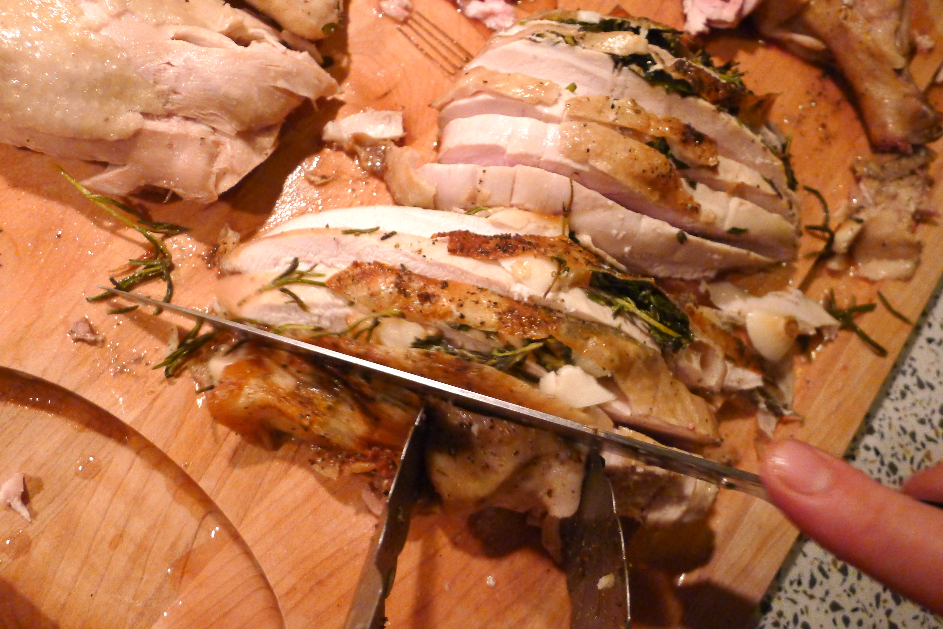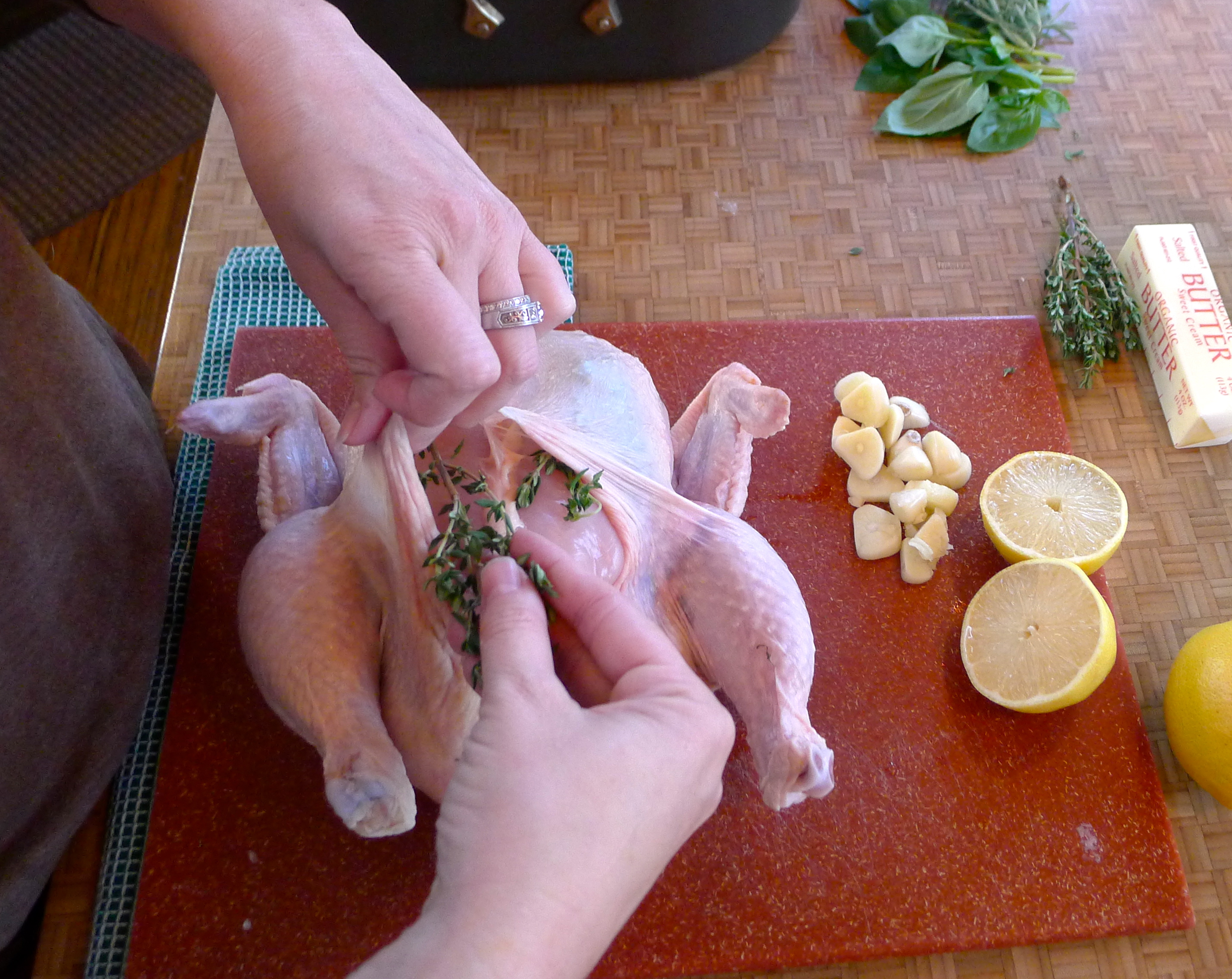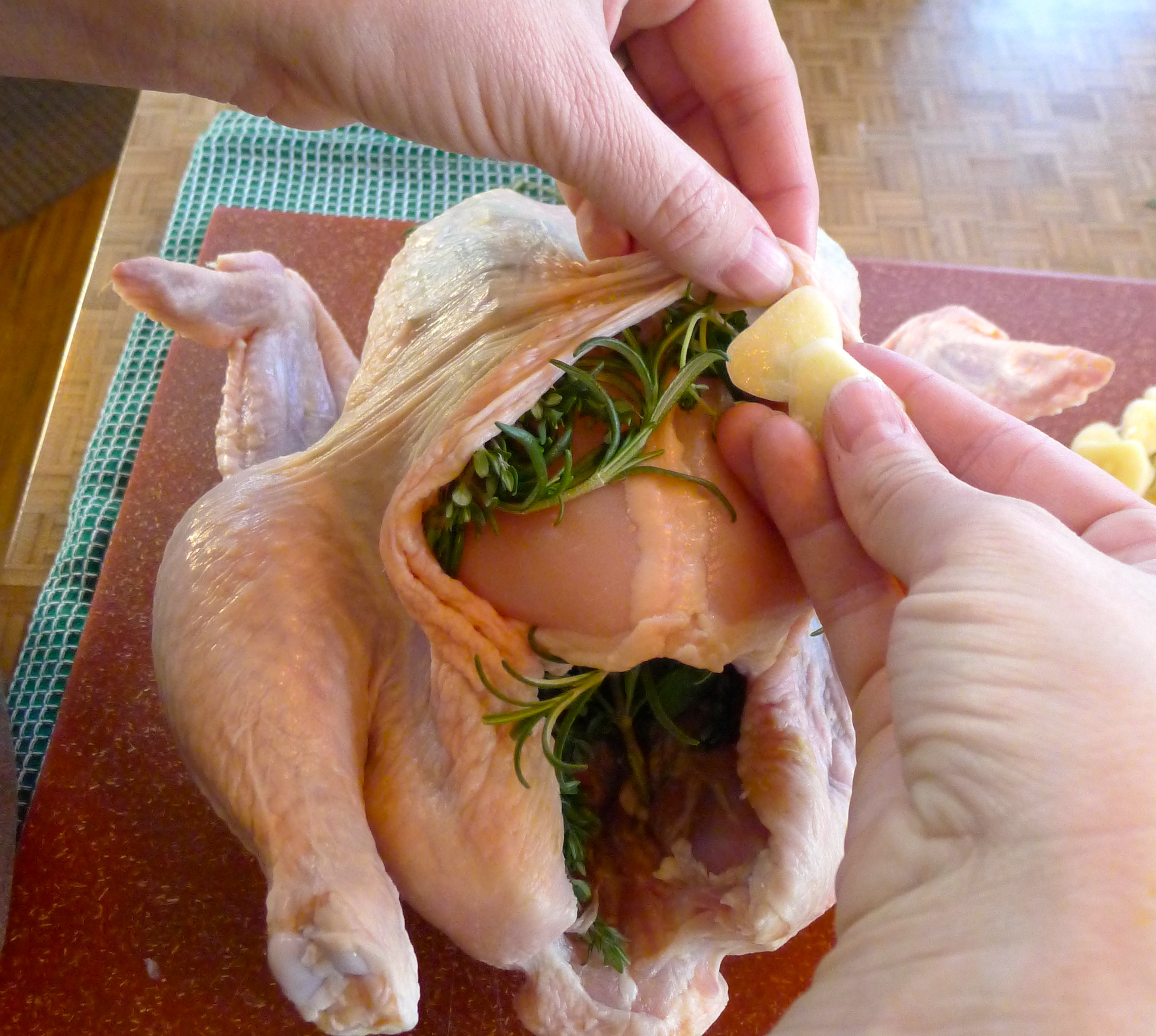 First the herbs. Under the skin of the breasts, I tucked whole sprigs of fresh herbs: thyme, rosemary, and basil. I also put some inside the chicken. Next, I did the same thing with thick slices of garlic, under the skin and inside.
