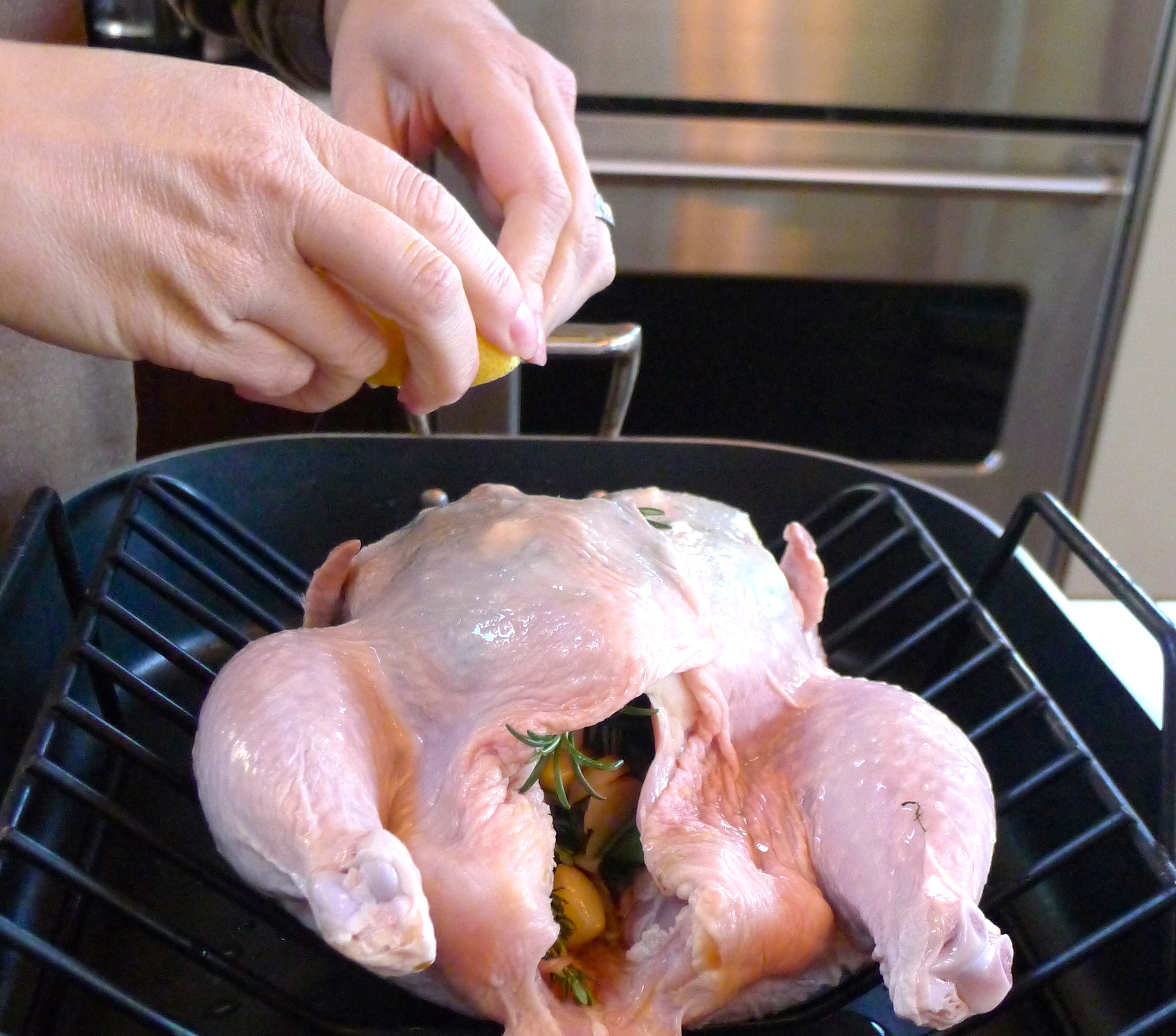I placed the birdie on the roasting pan and squeezed the juice of a whole lemon over it, then put the lemon halves inside with the herbs and garlic. I generously seasoned the chicken all over with salt and pepper.