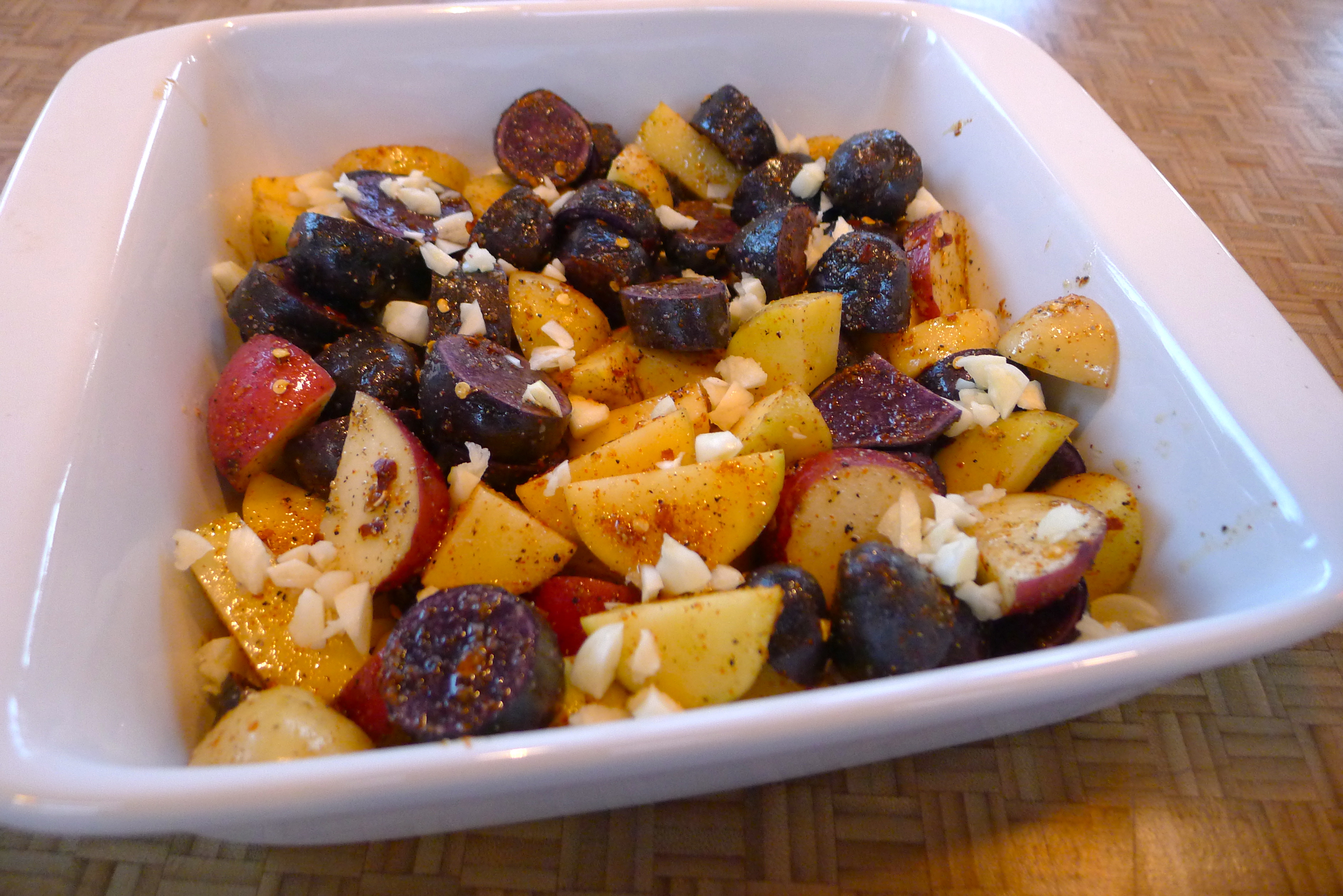 While the chicken roasted, I put together a simple garlic potato dish and put it in the oven toward the last half of the cooking time. I used a meat thermometer to gauge when the chicken was done. (Full disclosure: it was my first time using this thermometer and the chicken wasn’t done. We put it back into the oven for awhile. Another lesson in reading directions.)