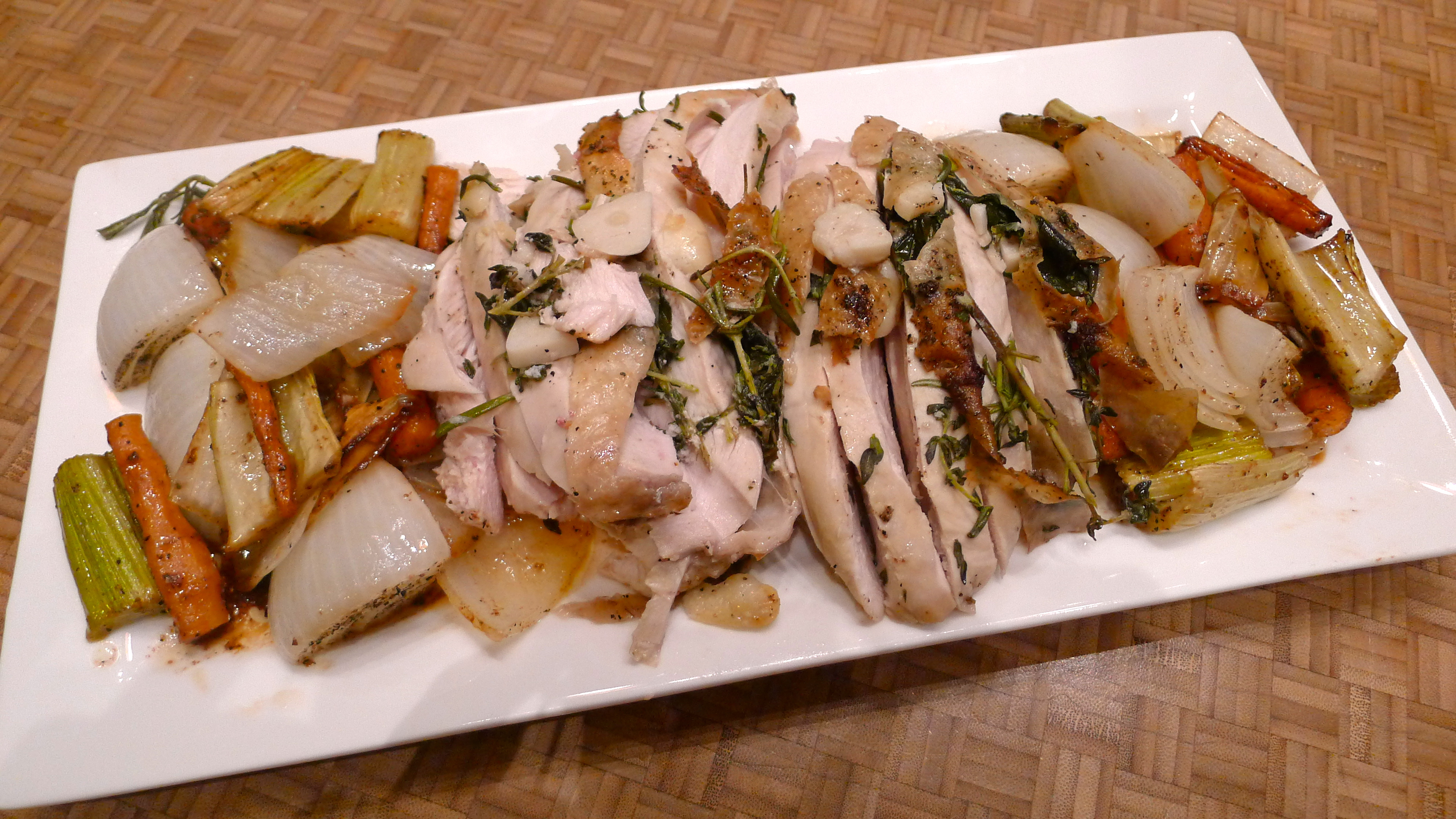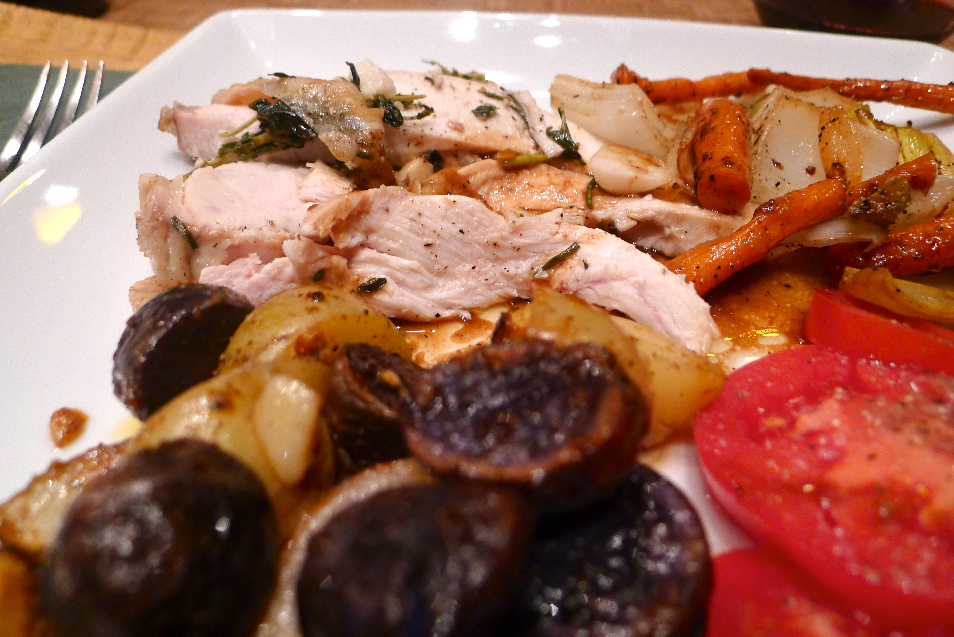 When the chicken was (finally) done, he was browned and crispy on the outside. John sliced some juicy pieces for each of us, which we ate with the roasted veggies and ‘taters.