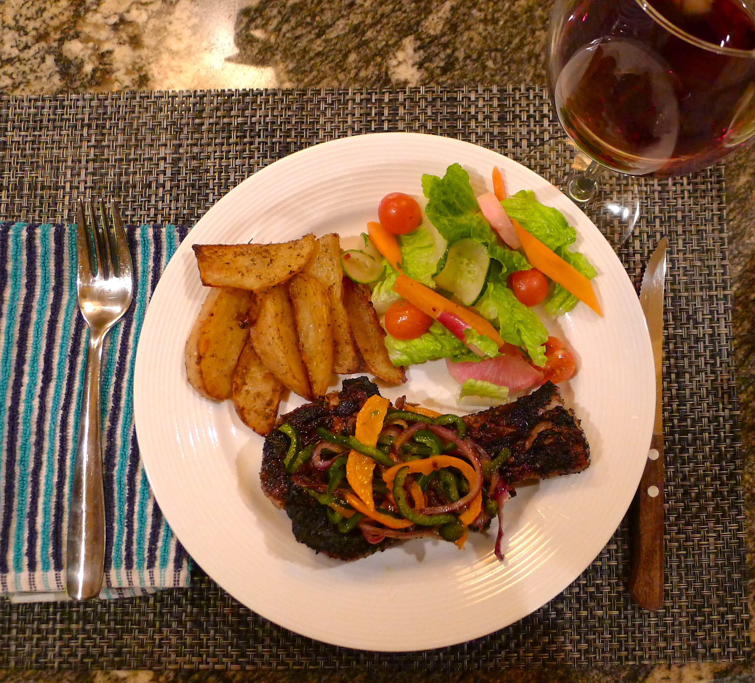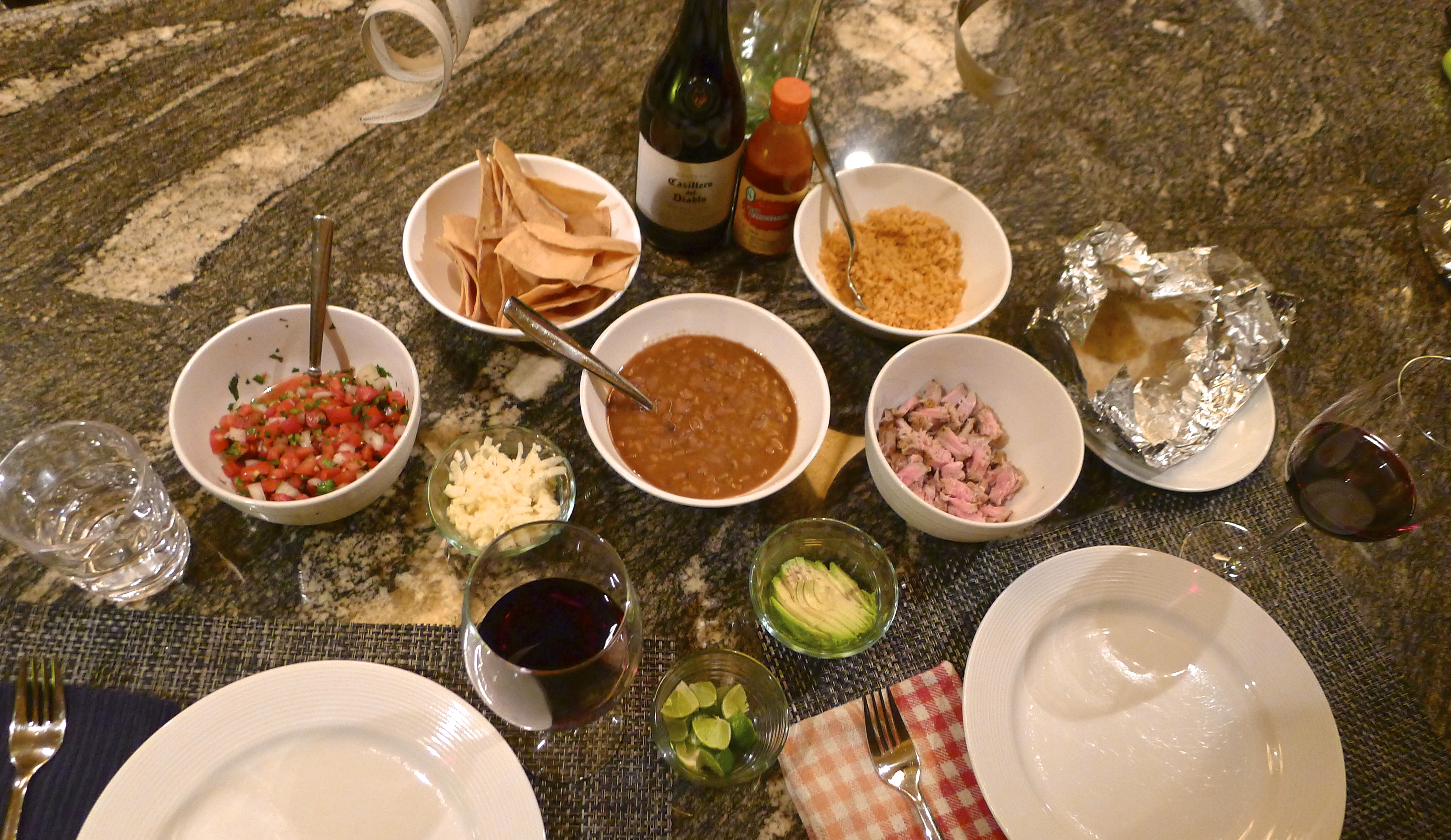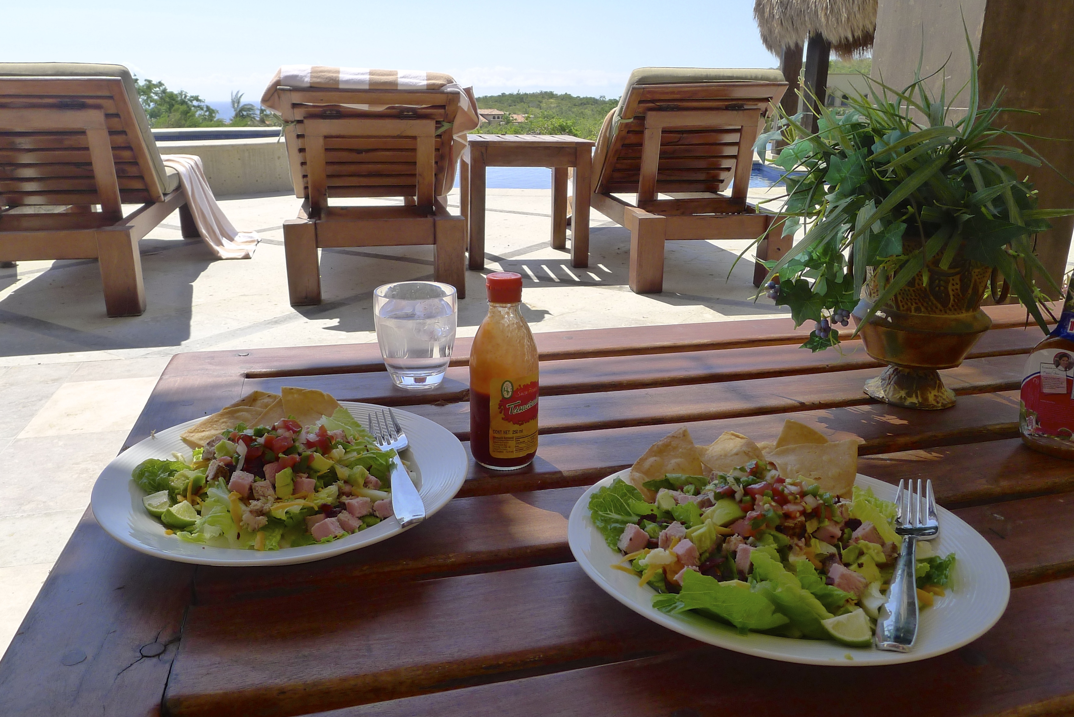 The local supermarket was up and running (amid construction), so we were able to stock up on food for the house. As always, we have some sort of grilled taco party every night: tuna, marinated steak, chicken. We make homemade salsa, and there’s nothing like real-deal Mexican rice, beans, and tortillas. One day after an at-home pilates session, we made incredible taco salads for lunch using leftovers. The one meal when we strayed from Taco Town was our “last supper”: grilled pork chops from Flora Farms’ butcher, roasted potatoes, and salad.