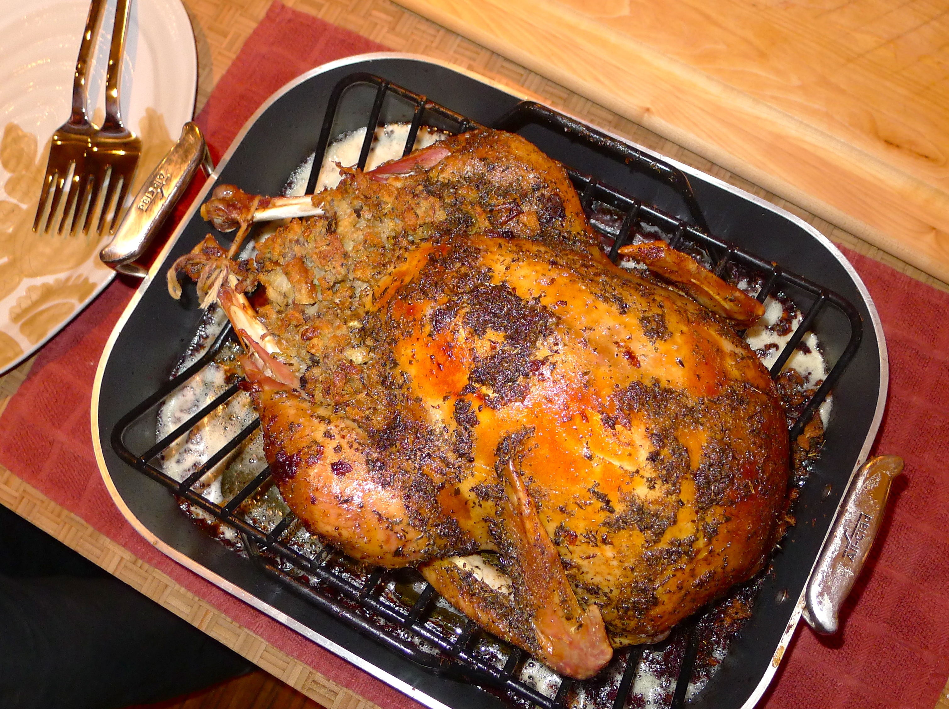 Saturday was our official holiday. With college ball games on TV, we got to work. We made the rest of the side dishes, like green bean casserole and corn and mashed potatoes. Mom stuffed the bird. John buttered and seasoned it. While Mr. Turkey cooked, we played (very competitive) card games. Occasionally, John would pause the game to baste the turkey in butter, which led to a group Viewing of the Turkey each time. Our “ooohs” and “ahhhs” were warranted- it was a gorgeous bird!