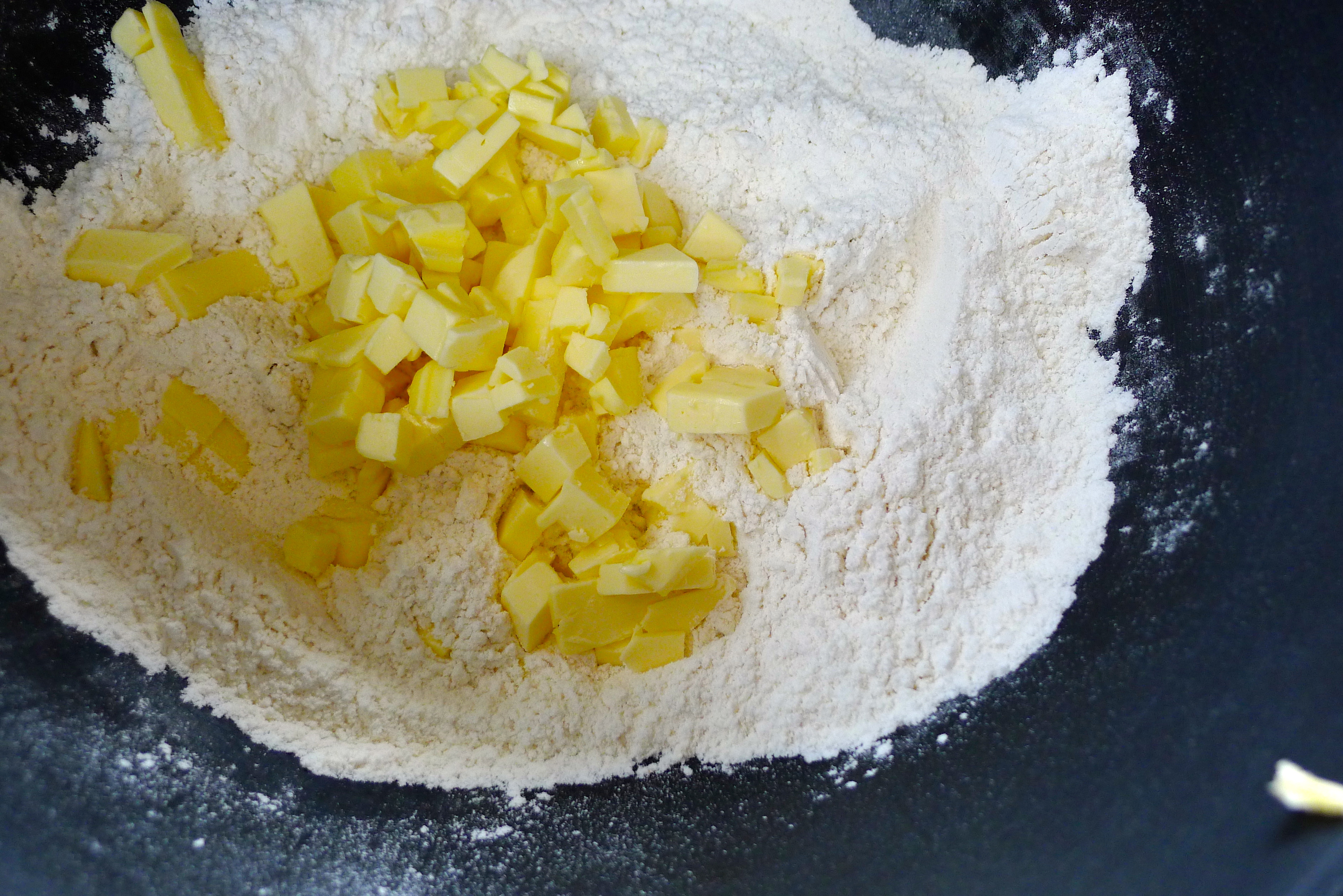 Next, I added cold butter that I’d chopped into small pieces and gave it a toss in the flour. Using my fingers, I rubbed the butter and flour together. When the butter chunks were the size of small peas and evenly distributed in the flour, I added shortening and did the same thing. The dough should come together in clumps when squeezed.