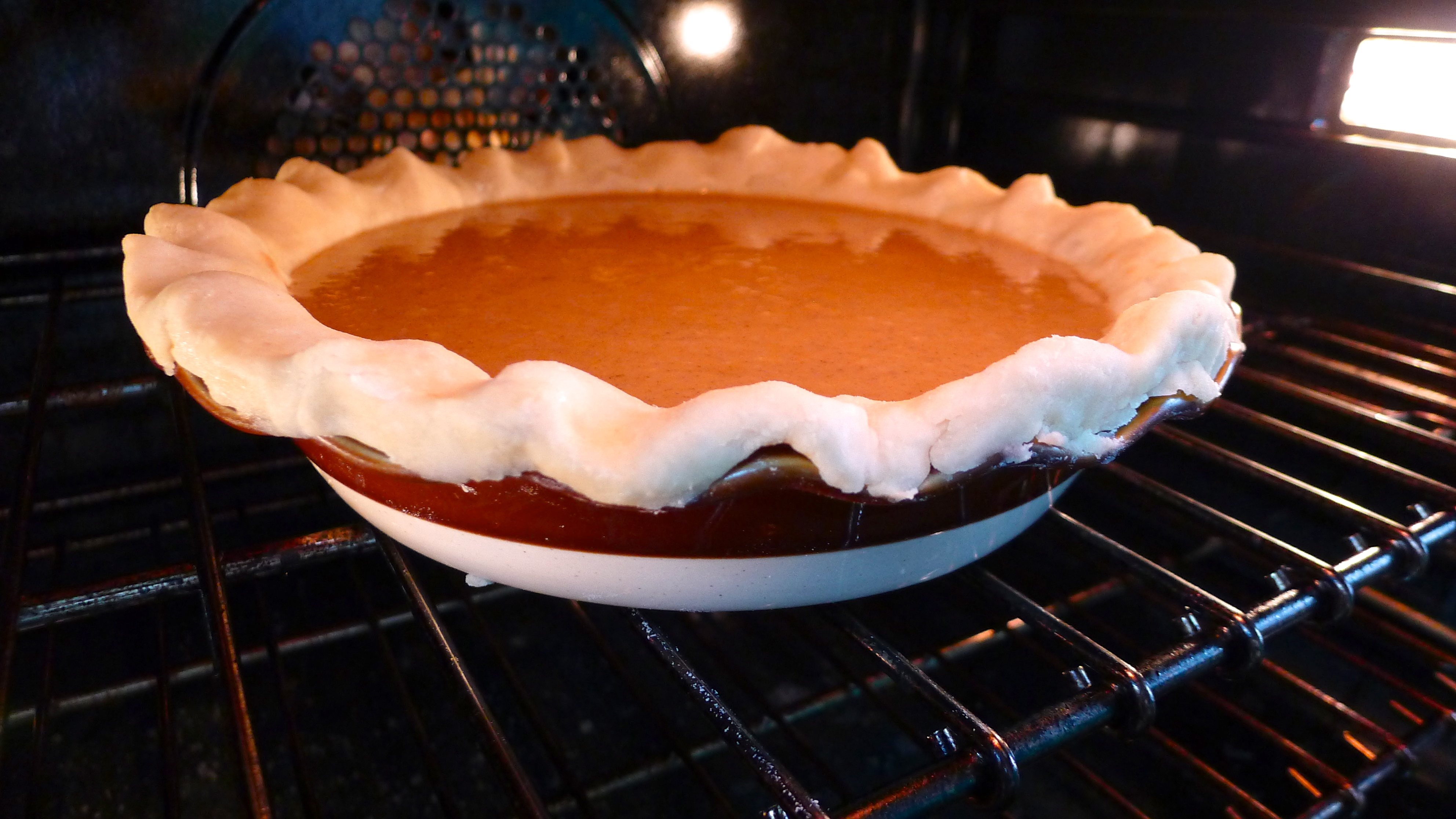 The whole dough-making process happened quickly, because you want the butter to stay cold and in chunks so that when it bakes, it leaves little air pockets that create flakiness. When the dough had chilled enough, I rolled it out on a floured counter, rolled it onto my rolling pin, and rolled it off over my pie plate. You could see little chunks of butter and shortening in it. So far so good! Mom got to work on her special pumpkin pie filling. (Remember her cute newlywed-pumpkin pie story?) Dad gave it the thumbs up! Into the oven it went.