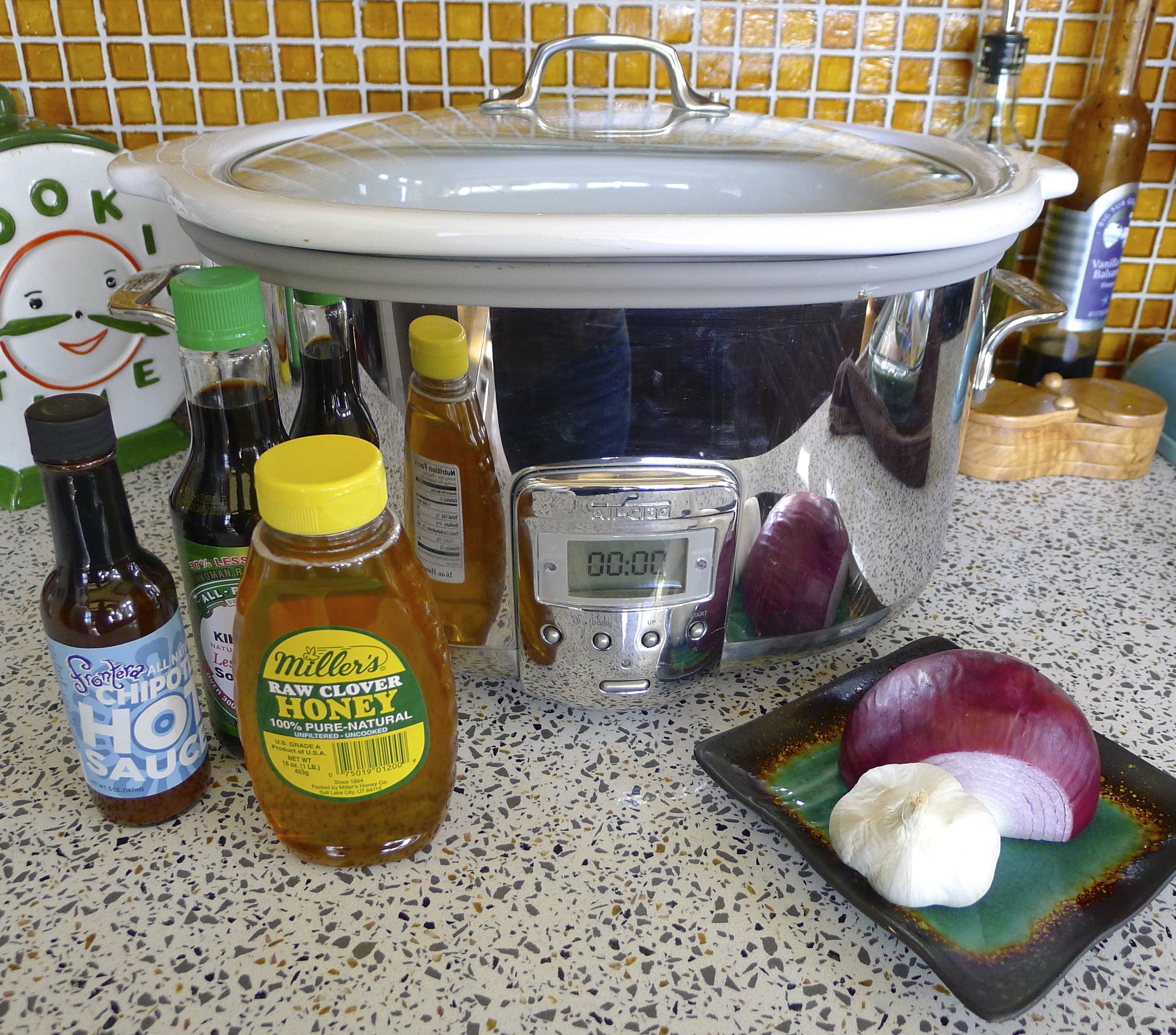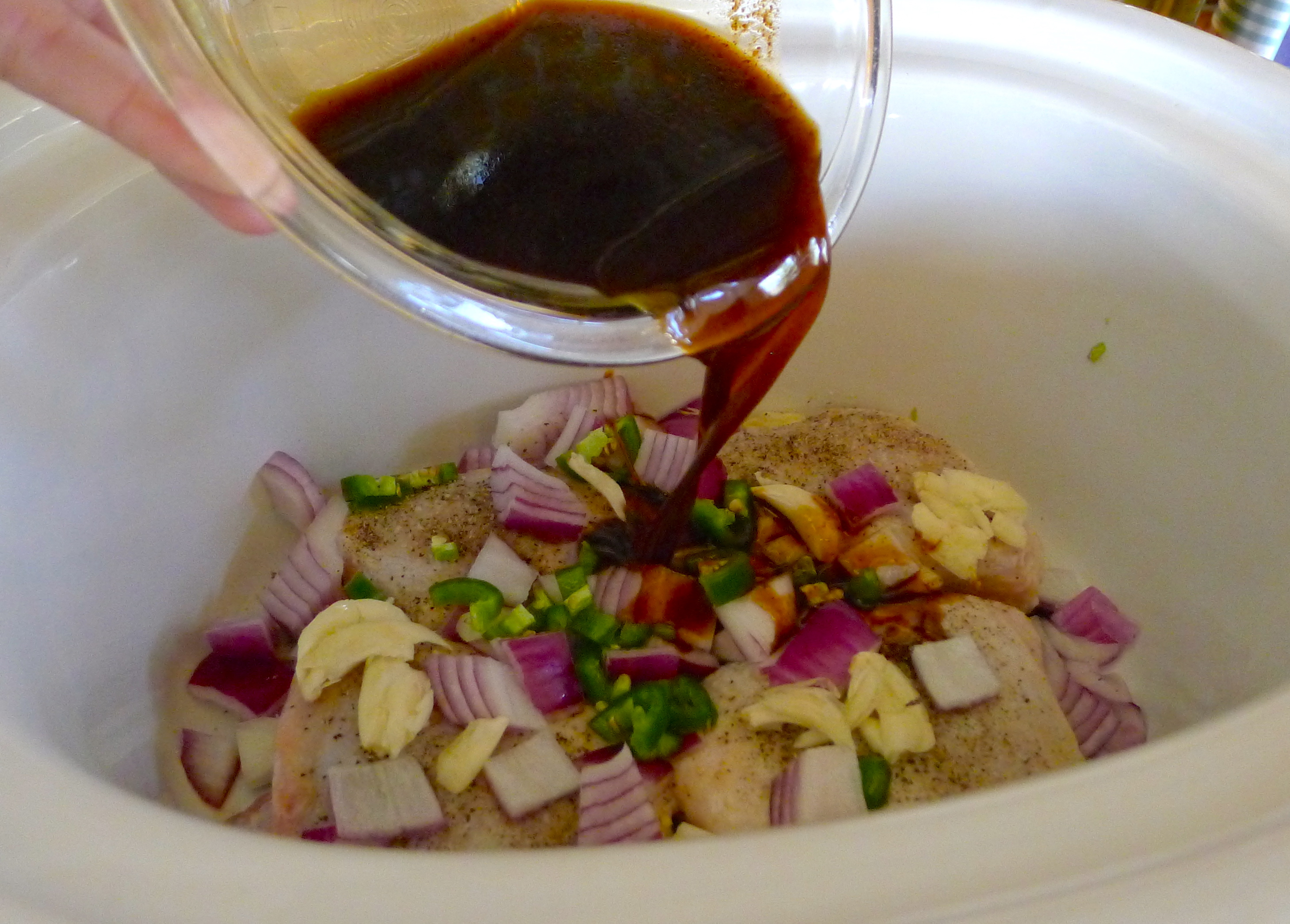 I usually use canned chipotle peppers in adobo sauce, but I didn’t have any in the pantry. A quick search through our (extensive) condiment drawer turned up a prepared chipotle hot sauce. I added some honey for sweetness and a little soy sauce for flavor. I poured the sauce mixture over the chicken, put the lid on, and turned the crockpot on high.