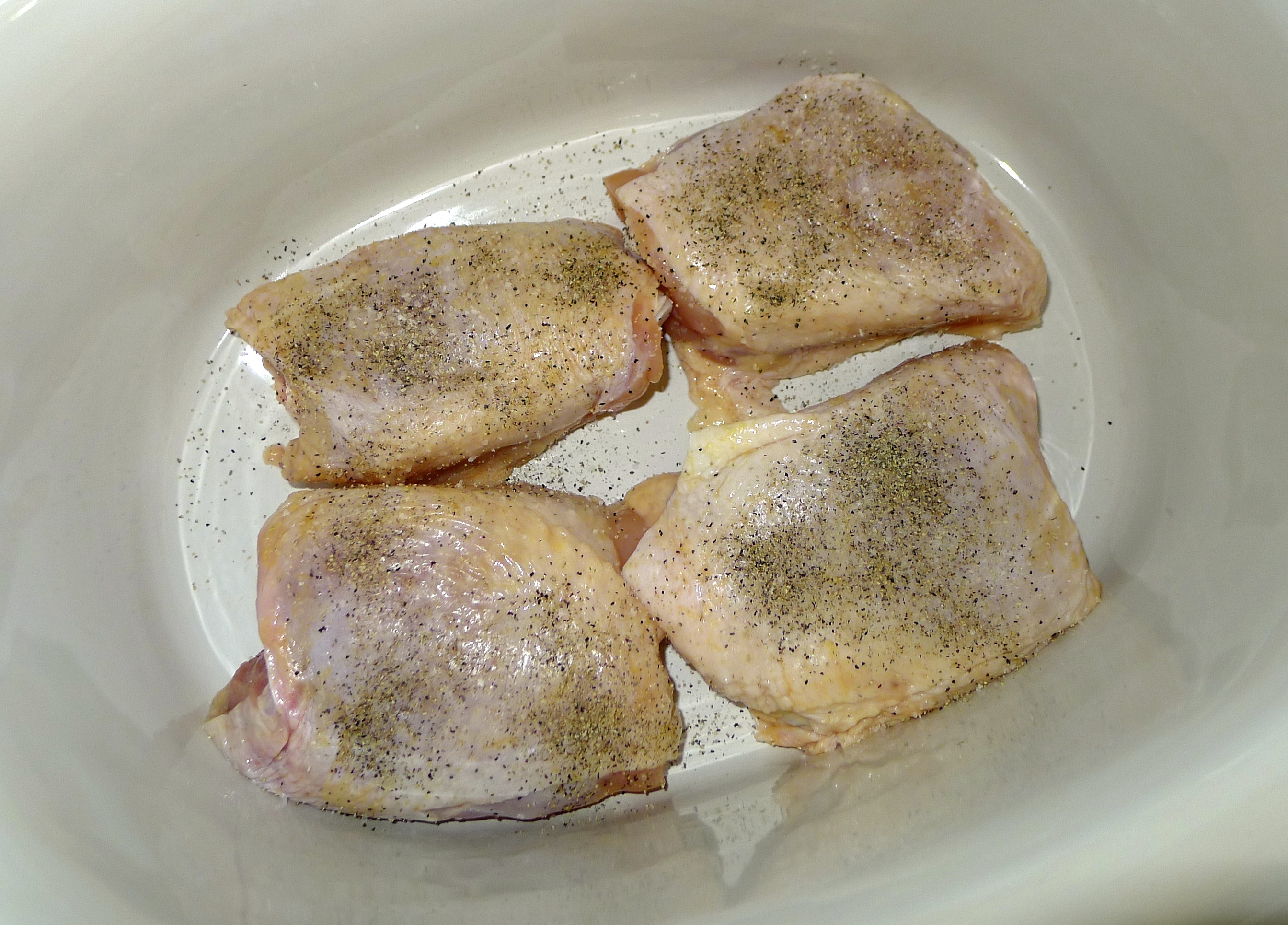 I haven’t had time yet to sort through the hundreds of photos or even wrapped my head around all of the things we experienced. I can’t wait to share it all with you, but in the meantime, how about a super-simple slow-cooker recipe? This time of year is hectic, whether you’ve been on the road for two weeks or not. I have yet to decorate a tree or wrap a single present! A comforting and scrumptious supper that’s easy to throw together is just what the doctor ordered: Slow-cooker Honey Chipotle Chicken. For this recipe, I used four chicken thighs with the bone in and skin on. I laid them in the bottom of the slow-cooker and gave them a generous sprinkle of salt and pepper.
