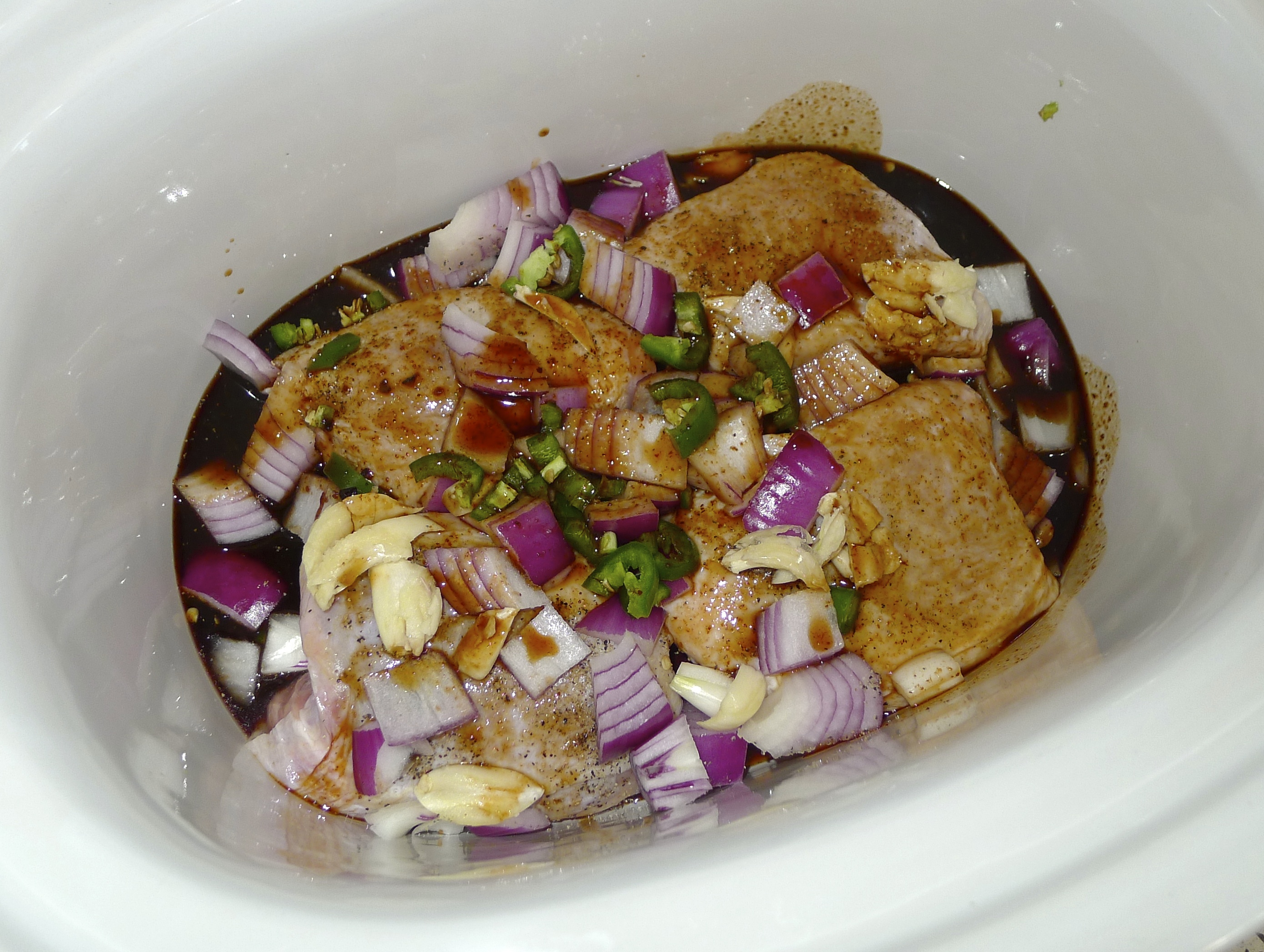 What I love best about crockpot cooking is the fact that there are no rules. Just toss yummy things into it and something delish happens! I just used what I had on hand. On top of the chicken, I added about half of a red onion, a handful of smashed garlic cloves, and a half of a jalapeno left over from another recipe.