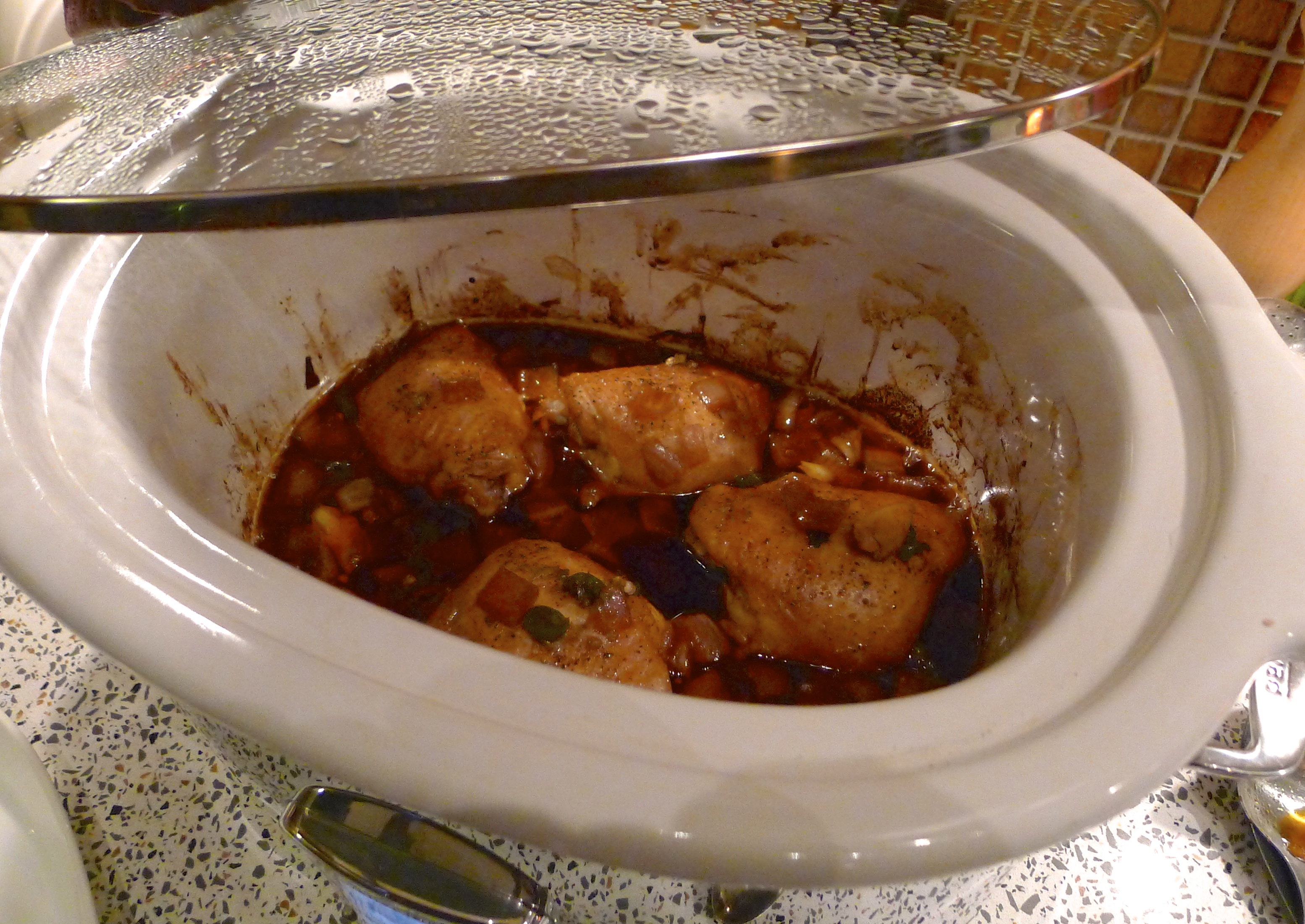 Two hours later, and the chicken was tender and juicy and amazing. I transferred it to a baking dish and popped it under the broiler to brown it just a bit. Then I spooned some of the cooking sauce from the crock over the top and sprinkled basil over everything. Gorgeous!