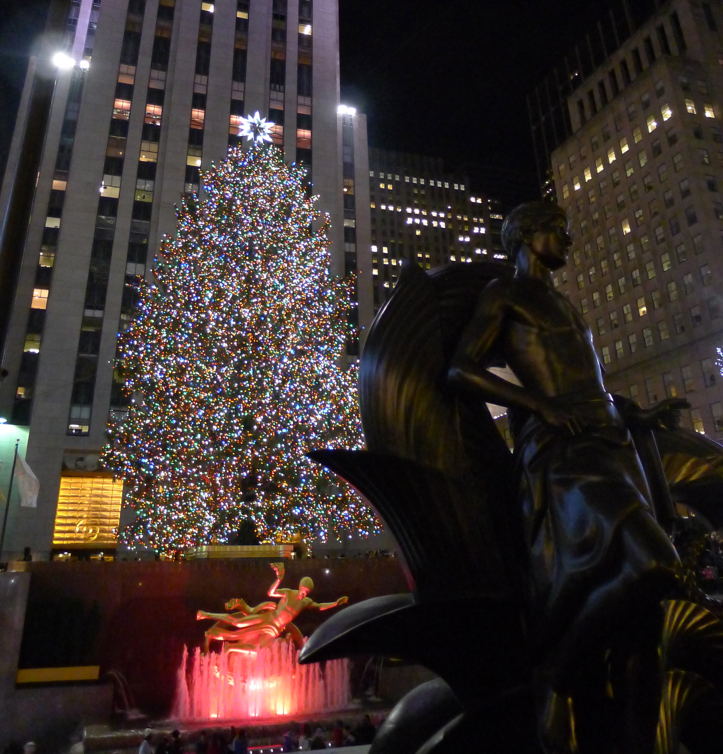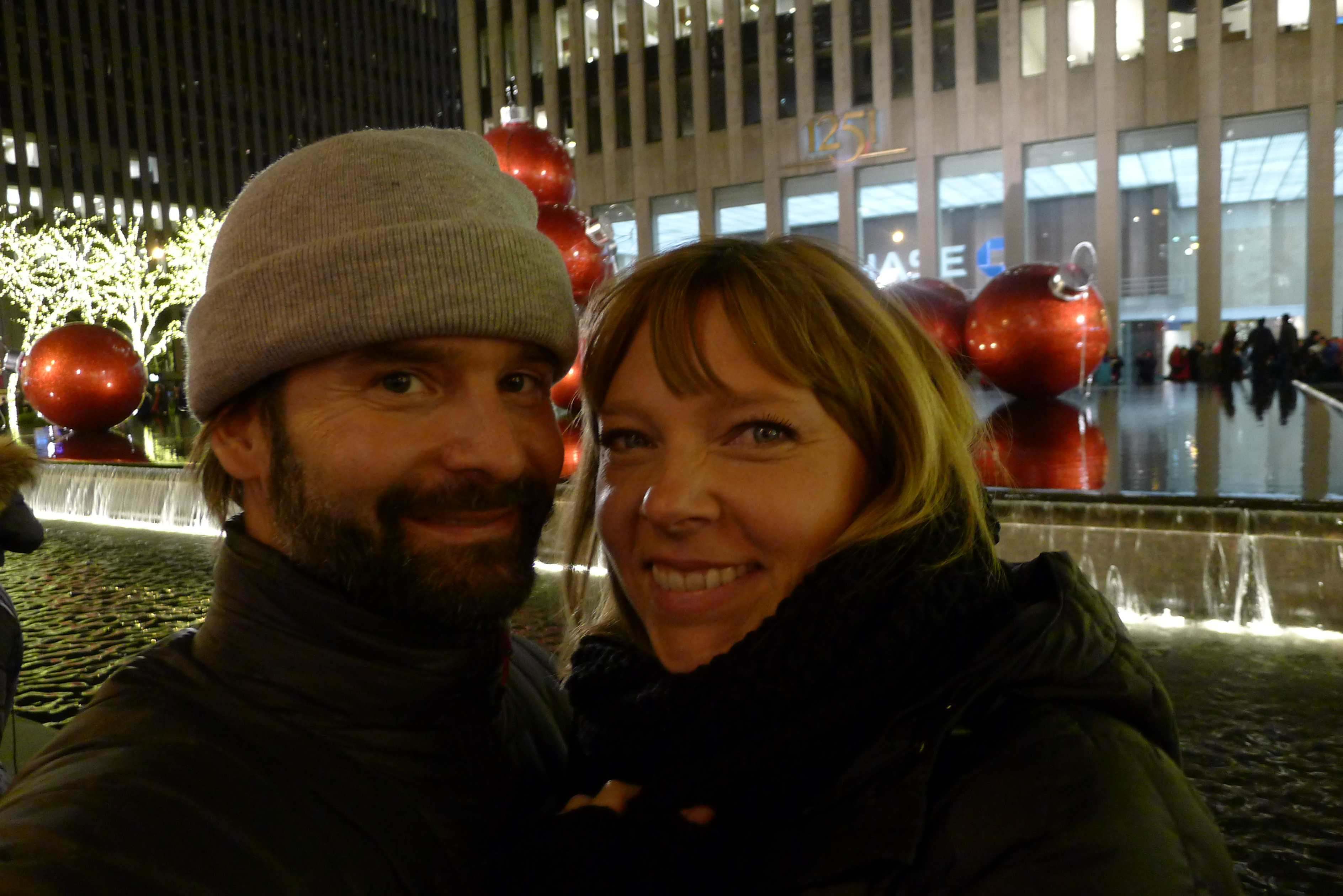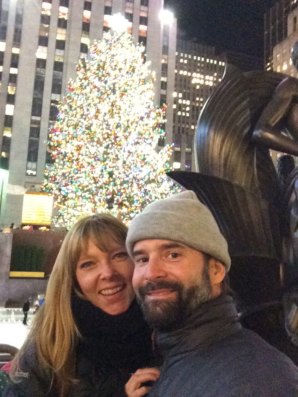 Our Christmas kick-off in New York City had just begun. After the show, we rode the elevator up 65 floors to the rooftop bar at the Rockefeller Center for martinis and champagne. We braved the cold and sipped our drinks outside on the Observation Deck, soaking in the best view in the city and sneaking a kiss or two. So romantic!