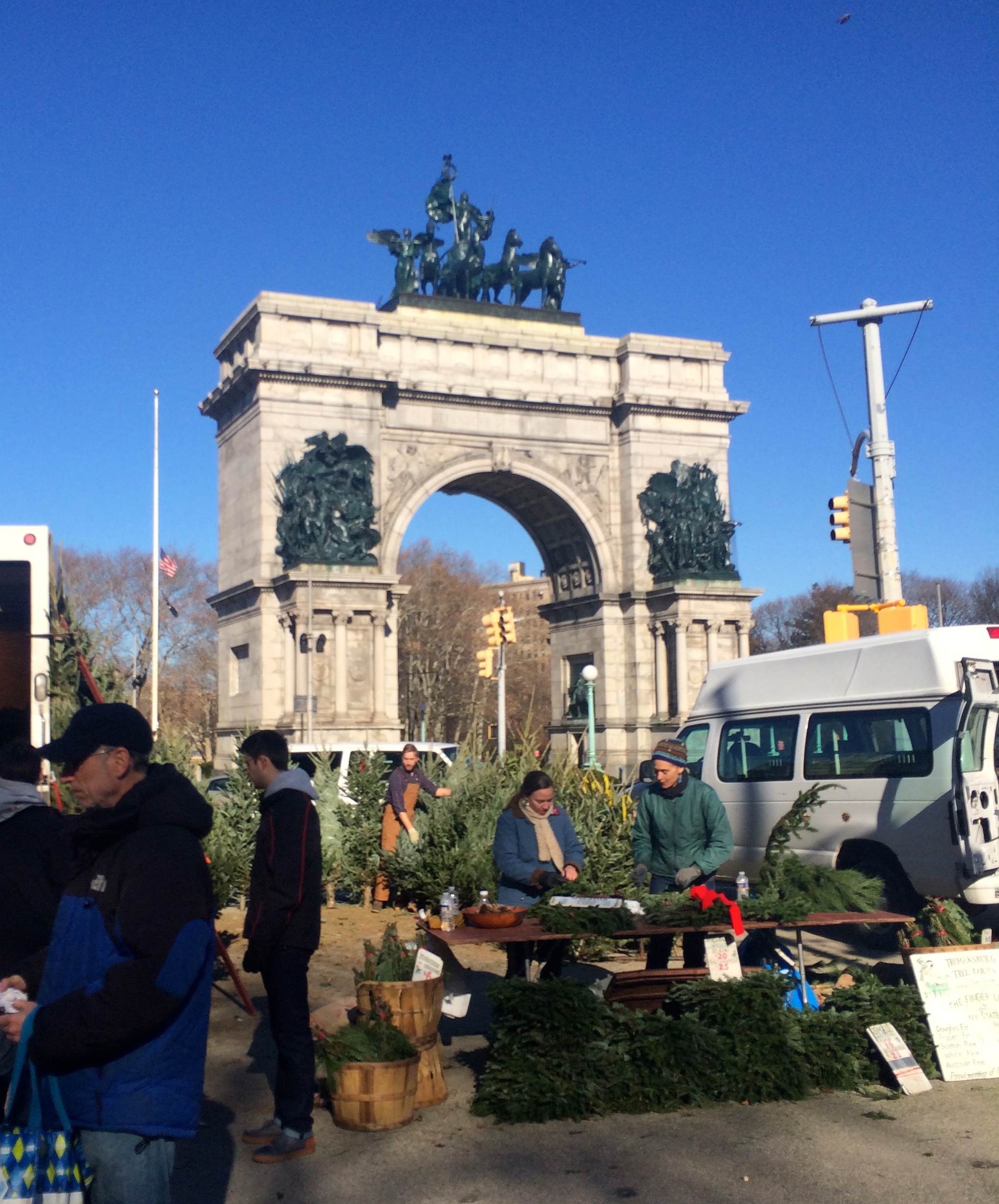 In the morning, John stayed back at the hotel to do some work while I met my friend, Betsy, and sweet baby James for a crisp, beautiful stroll in Prospect Park. I was reminded again that this was a special time to be visiting: the farmers market under the Soldiers and Sailors Arch was full of holiday goodies and Christmas tree vendors were working hard, their trees piled upon each other on the sidewalks.