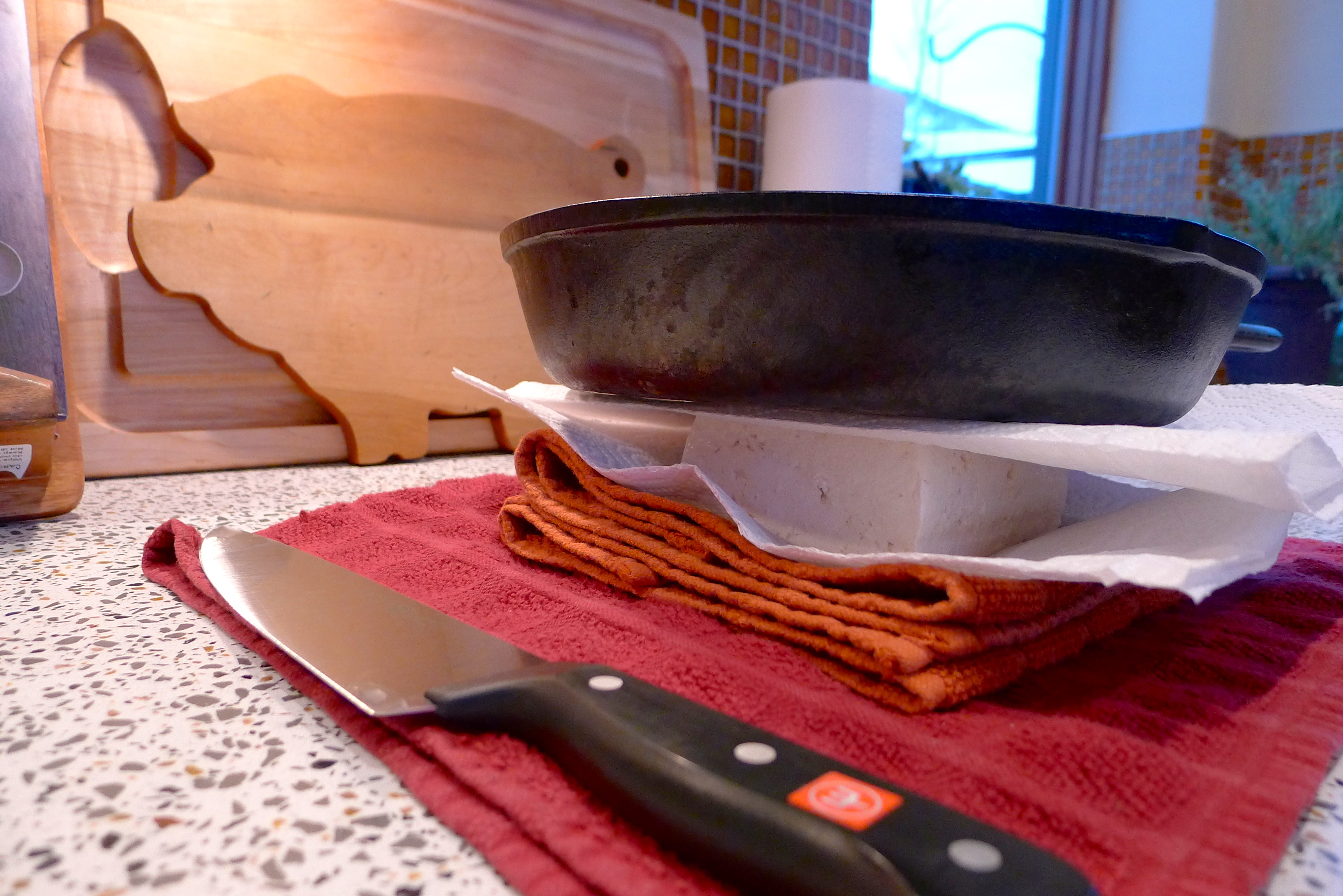 Tofu is not everyone’s cup of tea. For me, it’s necessary to change the texture and flavor it up. Baking the tofu gives it a delightfully crispy crust, but first you’ll need to get rid of some of the moisture. To do that, I laid out some kitchen towels, placed the block of tofu between some paper towels, and placed a cast iron skillet on top. The weight of the heavy object squeezes the moisture out. I left it alone while I made the stir-fry sauce.