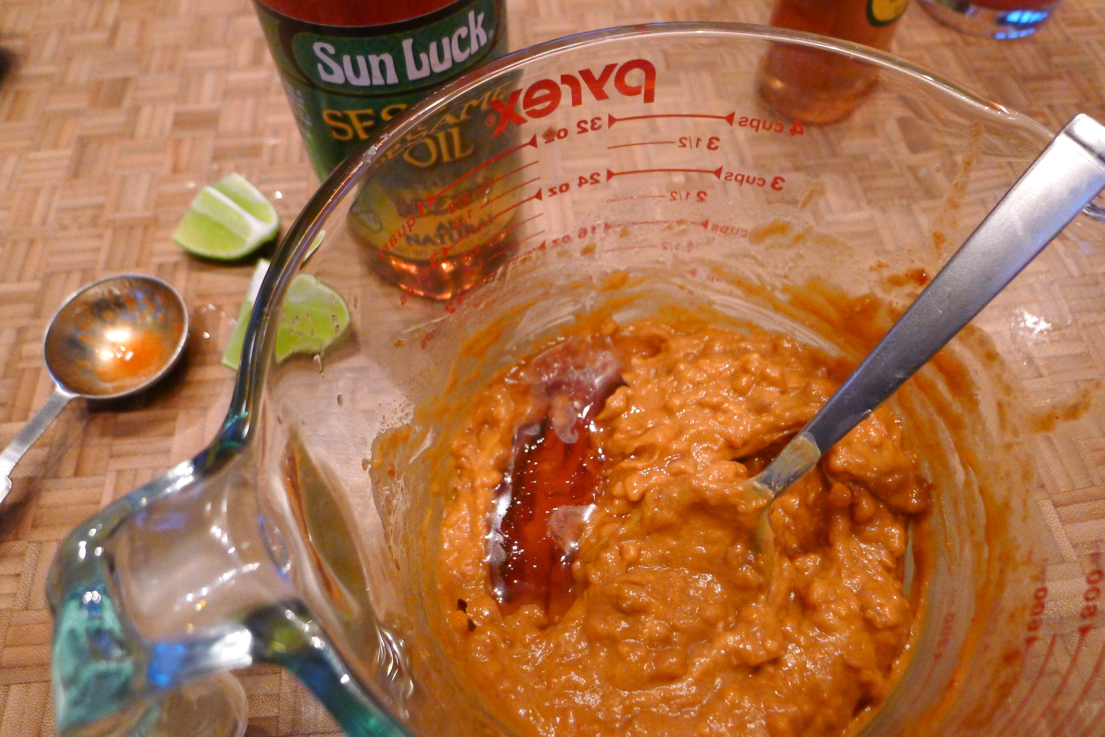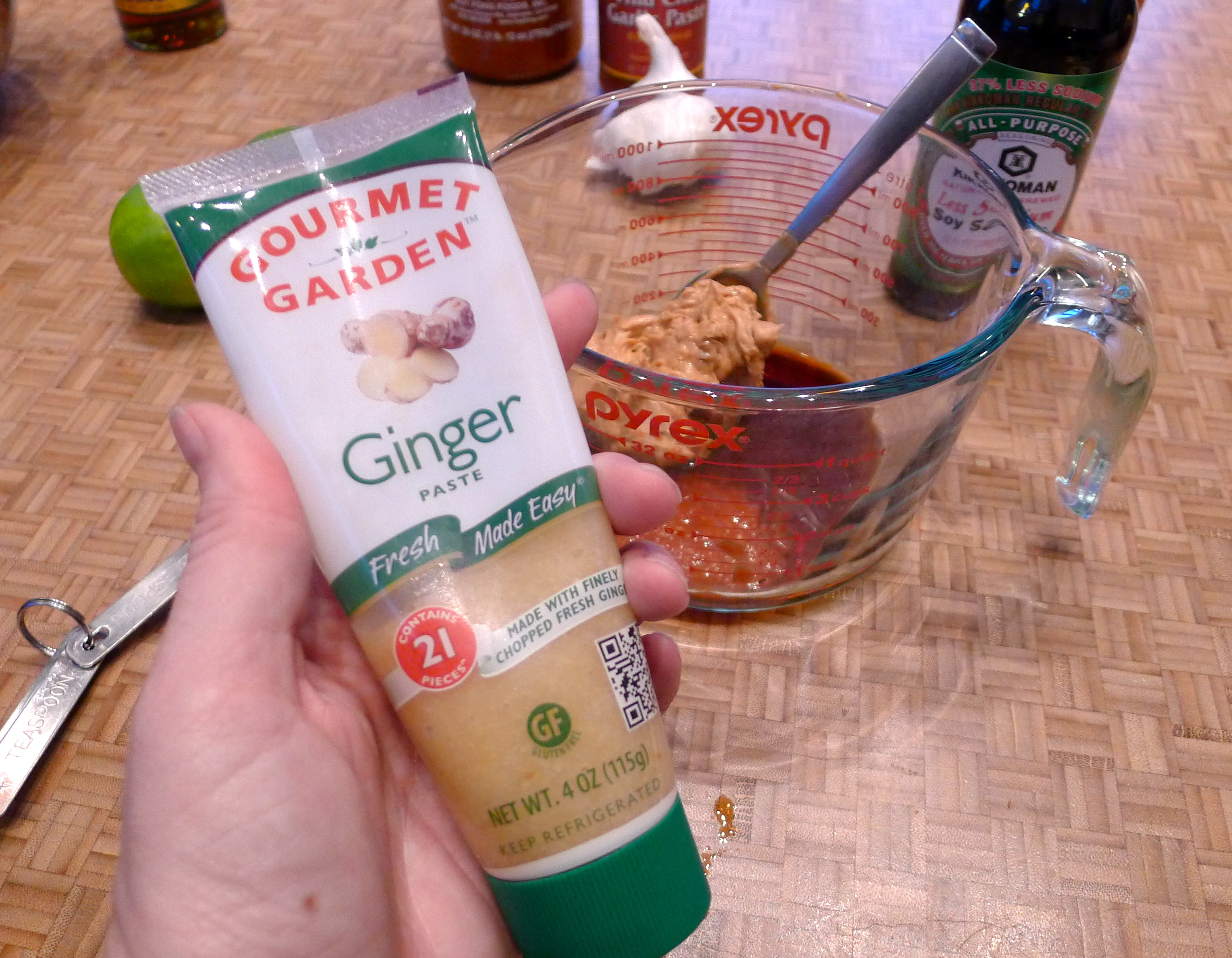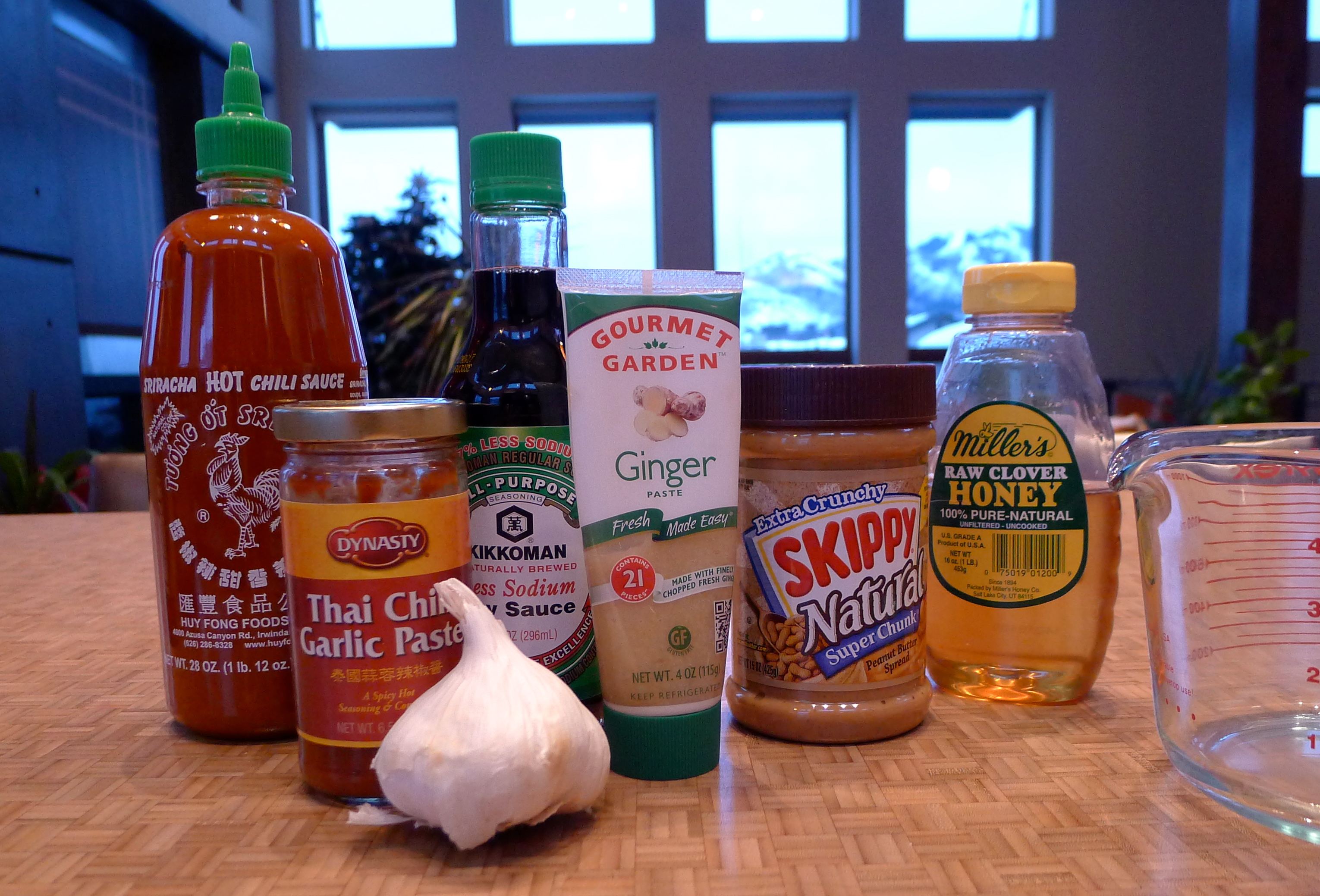 The sauce came about based on what I had on hand in the pantry. The base of it is peanut butter. I added soy sauce, Thai chili garlic paste, minced ginger and garlic, spicy Sriracha, lime juice, some honey, and a little sesame oil. I love everything about that.