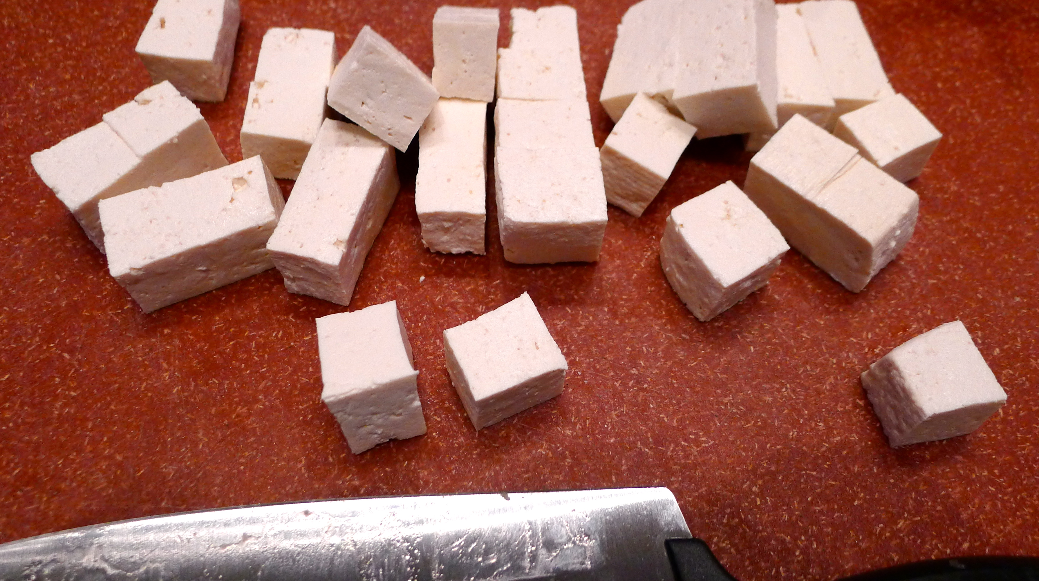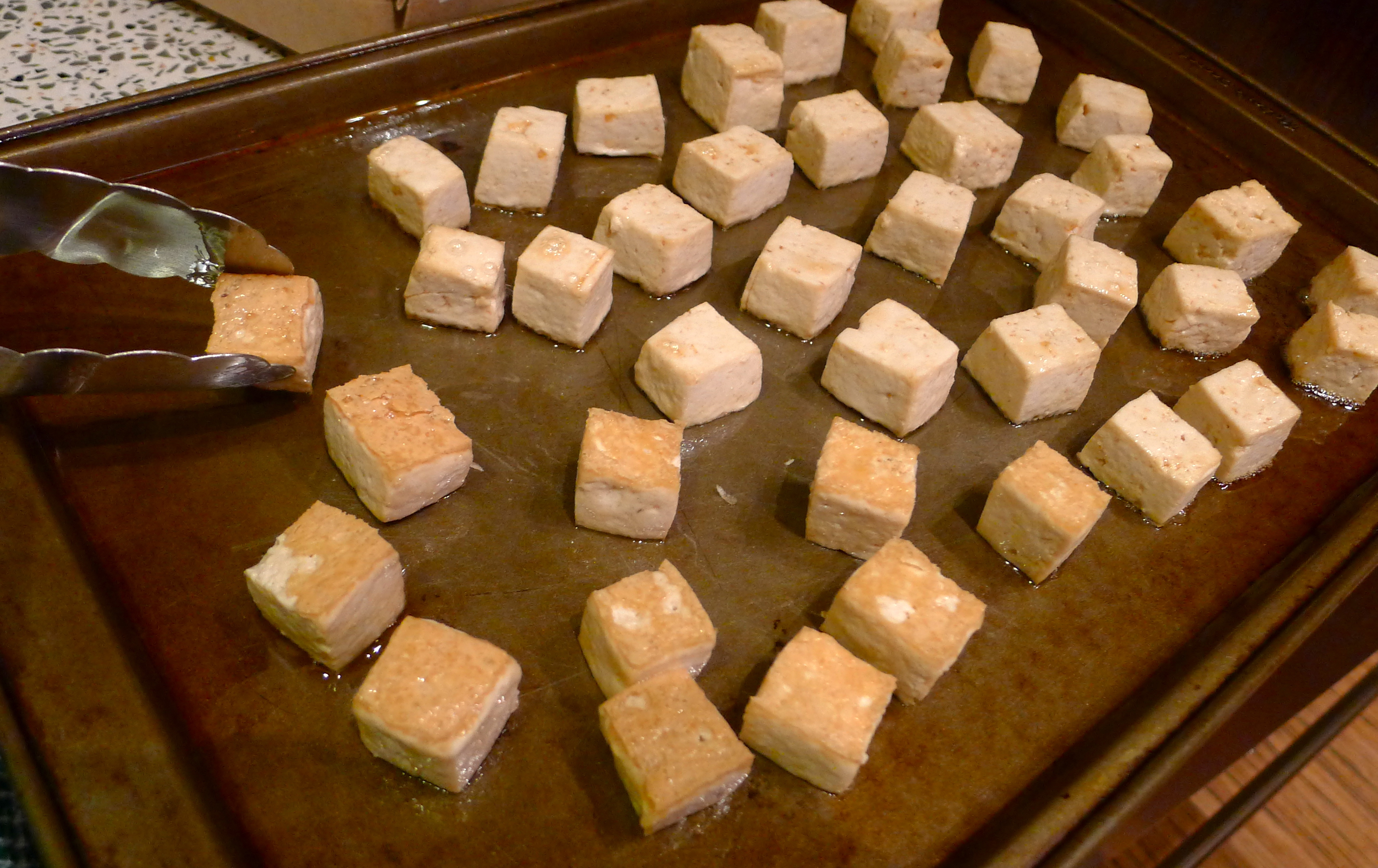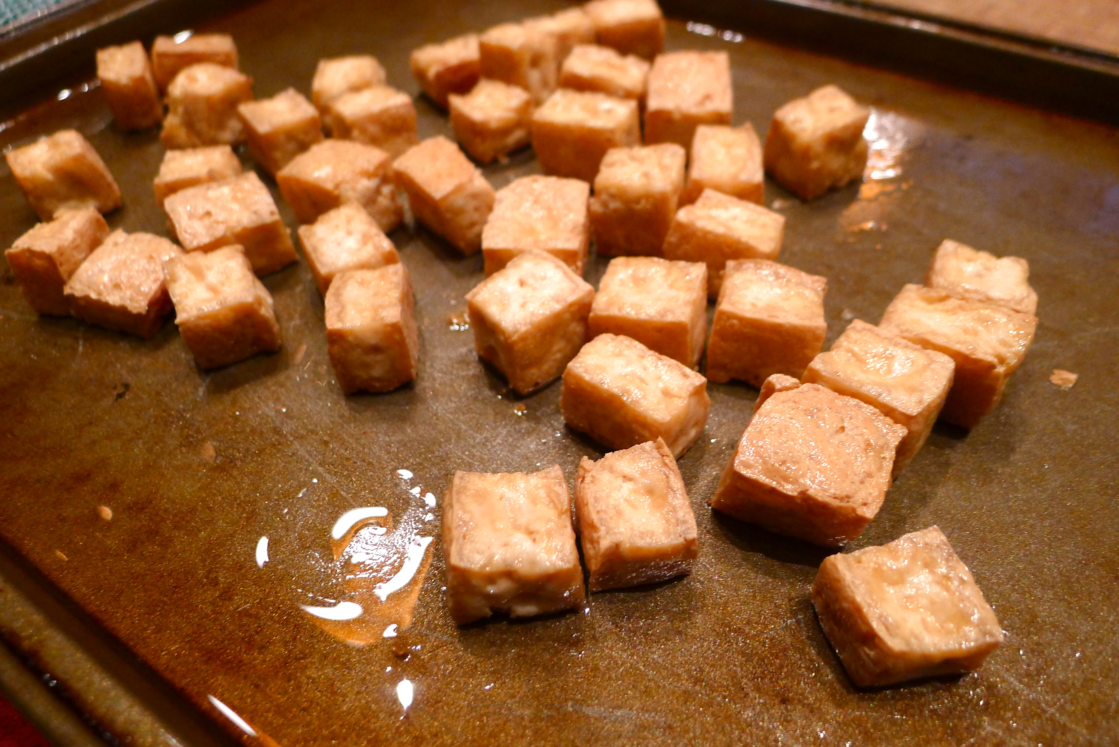 I set the thick peanut-y sauce aside and worked on the tofu. I cut the block into one-inch pieces and gently tossed them in sesame oil. I baked them at 400 degrees for probably 30 minutes, turning them every ten minutes or so to be sure all sides browned. Baking time will depend on how crispy you want the tofu and how small the chunks are. Look at those little nuggets!