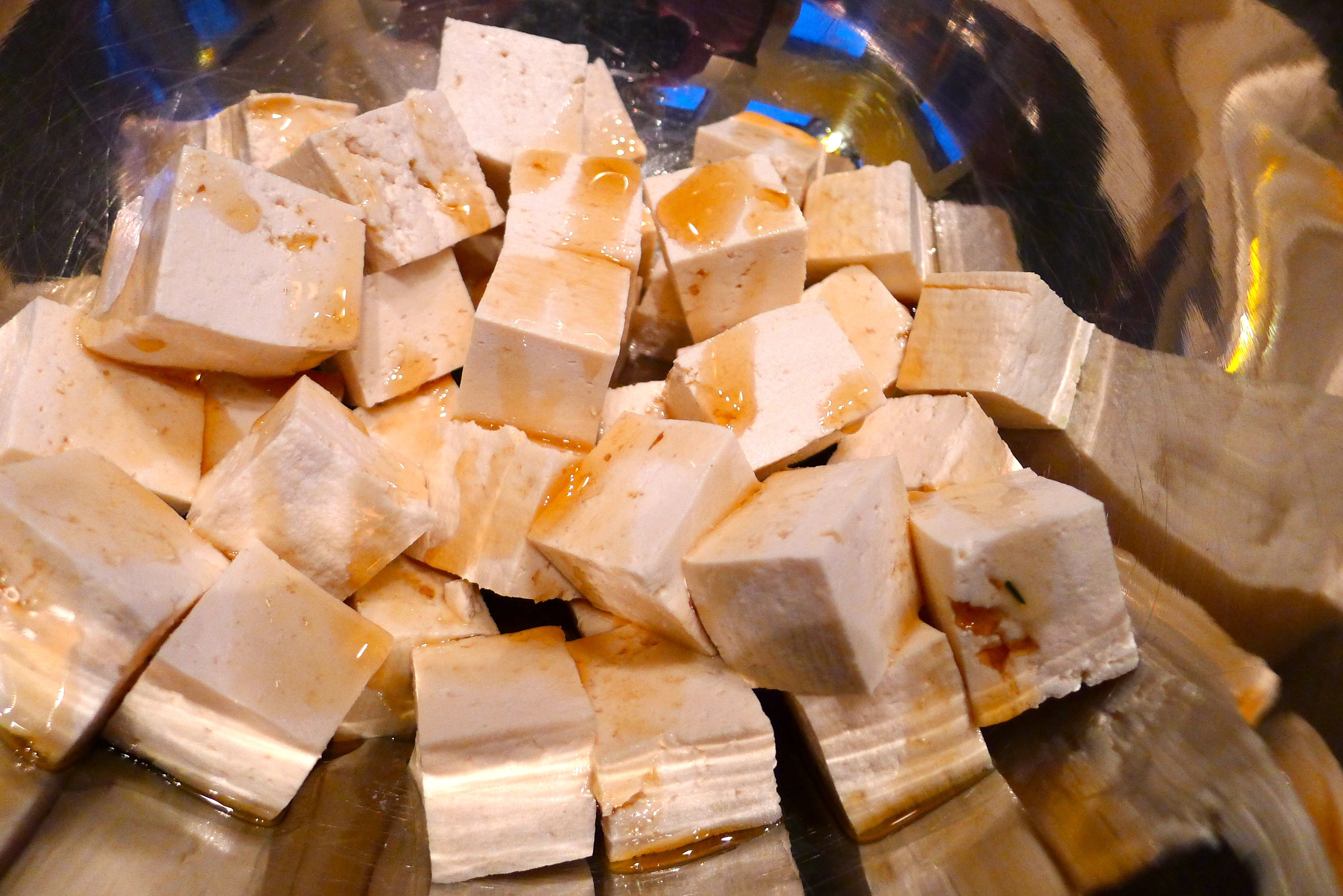 On a couple of folded kitchen towels, place the tofu block between two paper towels and weigh it down with a heavy object, like a cast iron skillet. Let the moisture be pressed out for 20-30 minutes. Preheat oven to 400 degrees. Cut up the dried tofu into one-inch pieces. In a bowl, gently toss the tofu with sesame oil and place on a baking sheet. Bake for 30 minutes, turning the pieces every ten minutes or so. Remove from the oven and set aside.