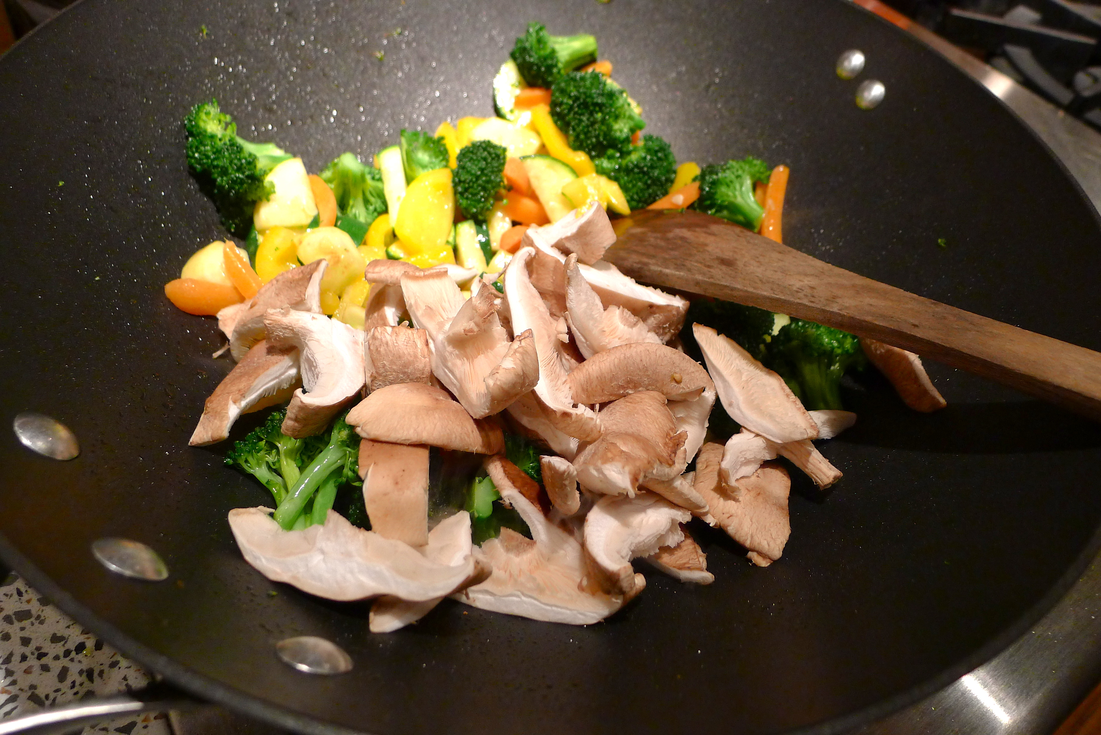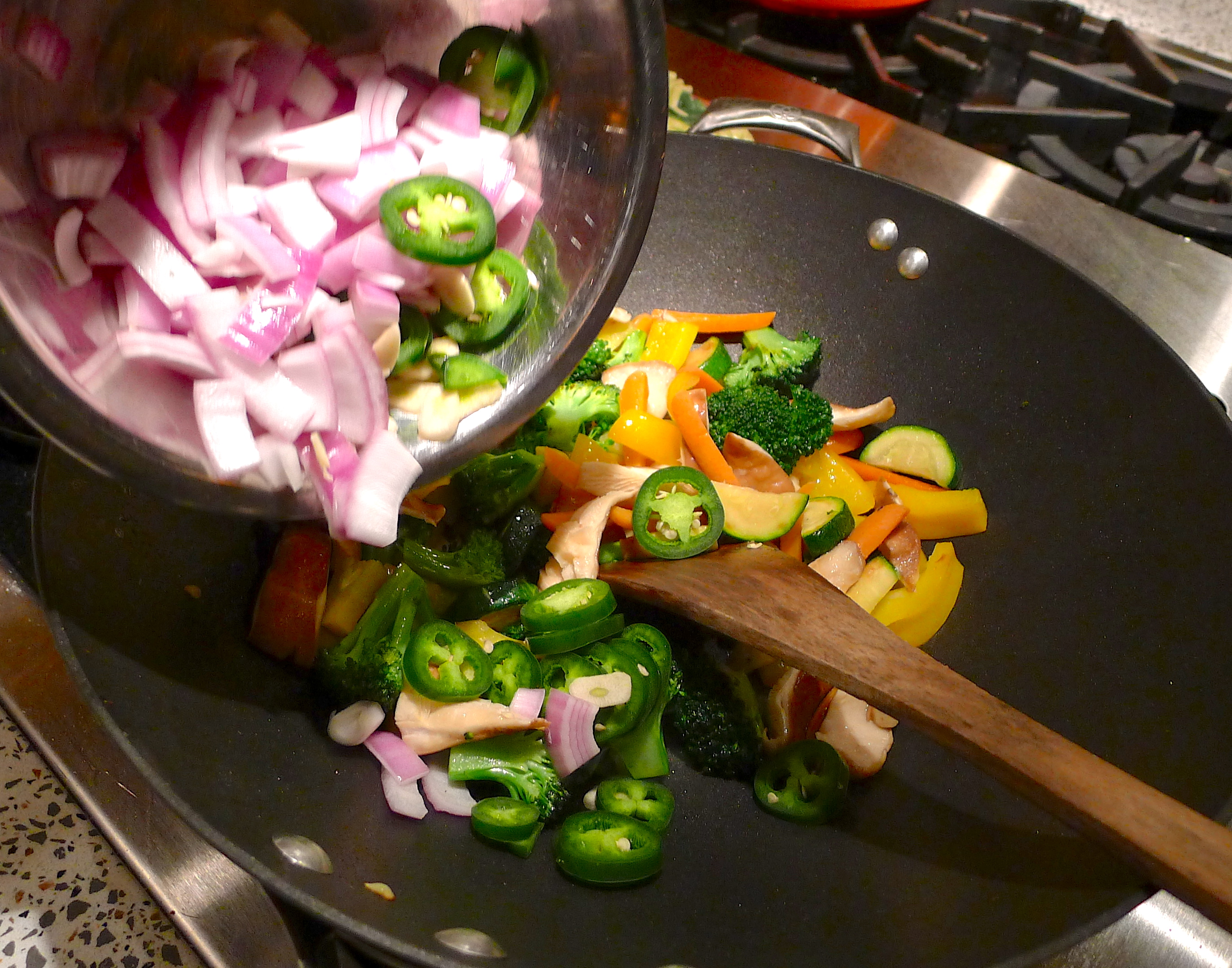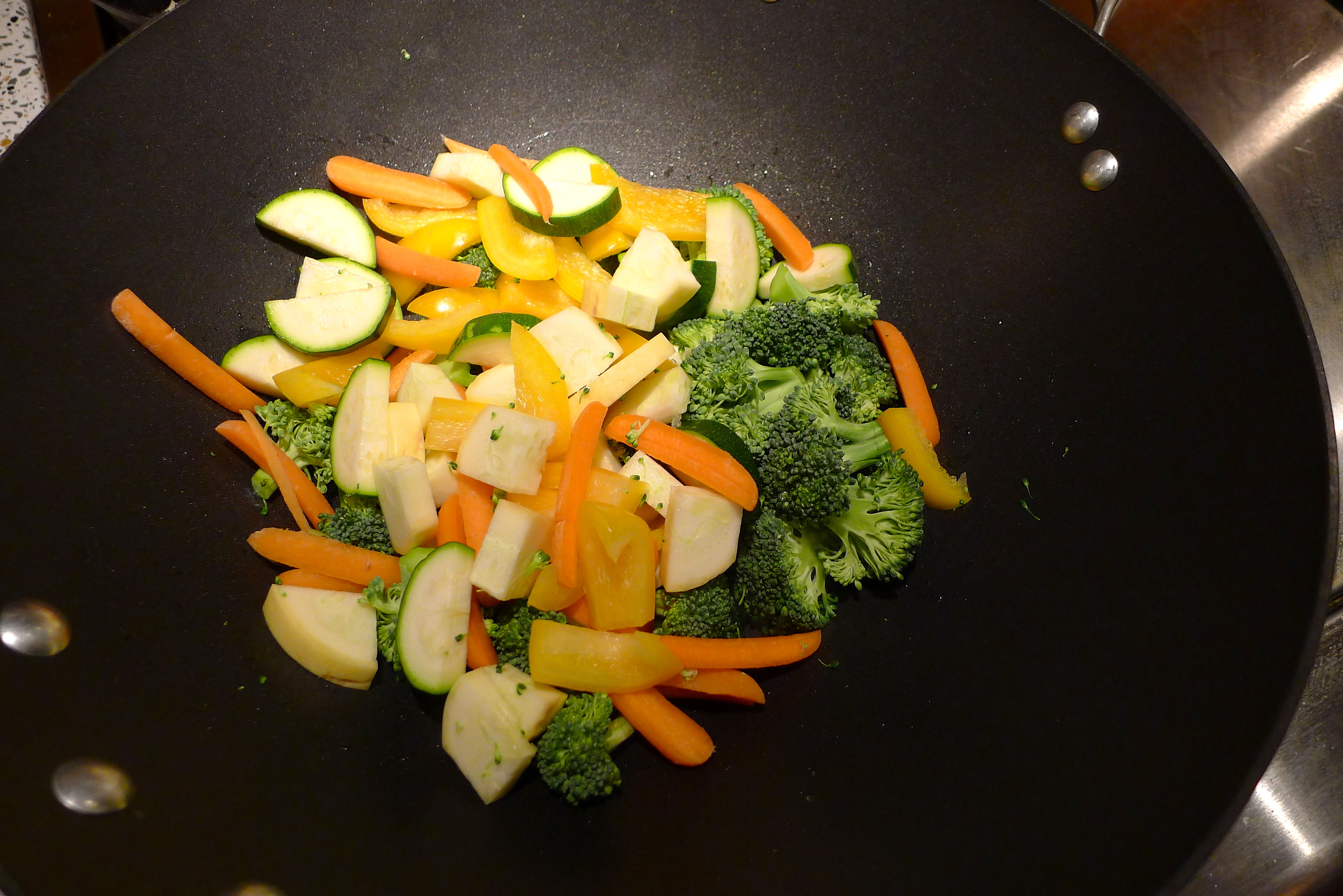 For the stir-fry, I just cleaned out the veggie drawer and chopped them into a rainbow on my cutting board. I heated some oil on medium-high heat in a wok (though a deep skillet would work fine). First, I sautéed the veggies that would take the longest: broccoli, carrot, yellow bell pepper, zucchini, and squash.