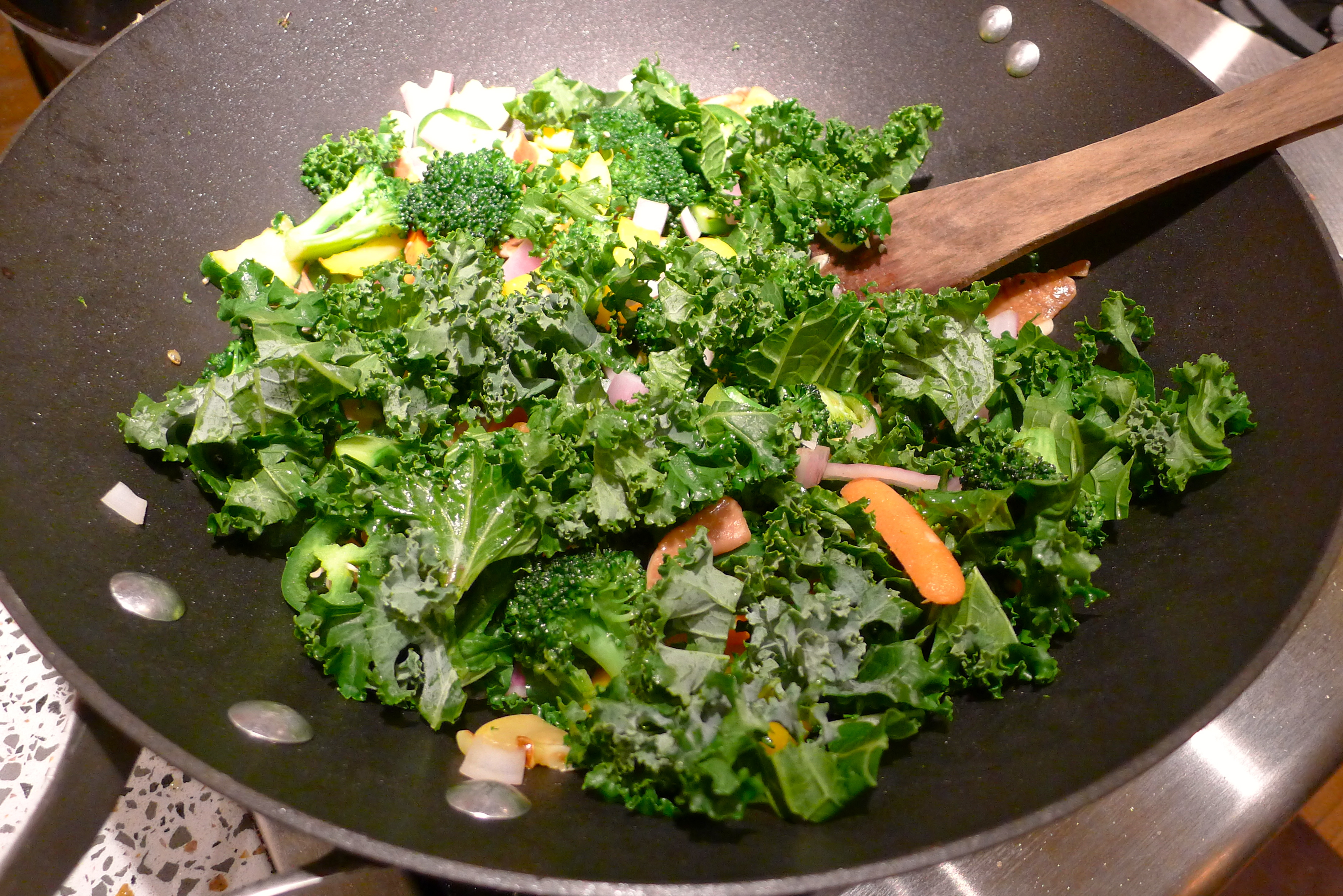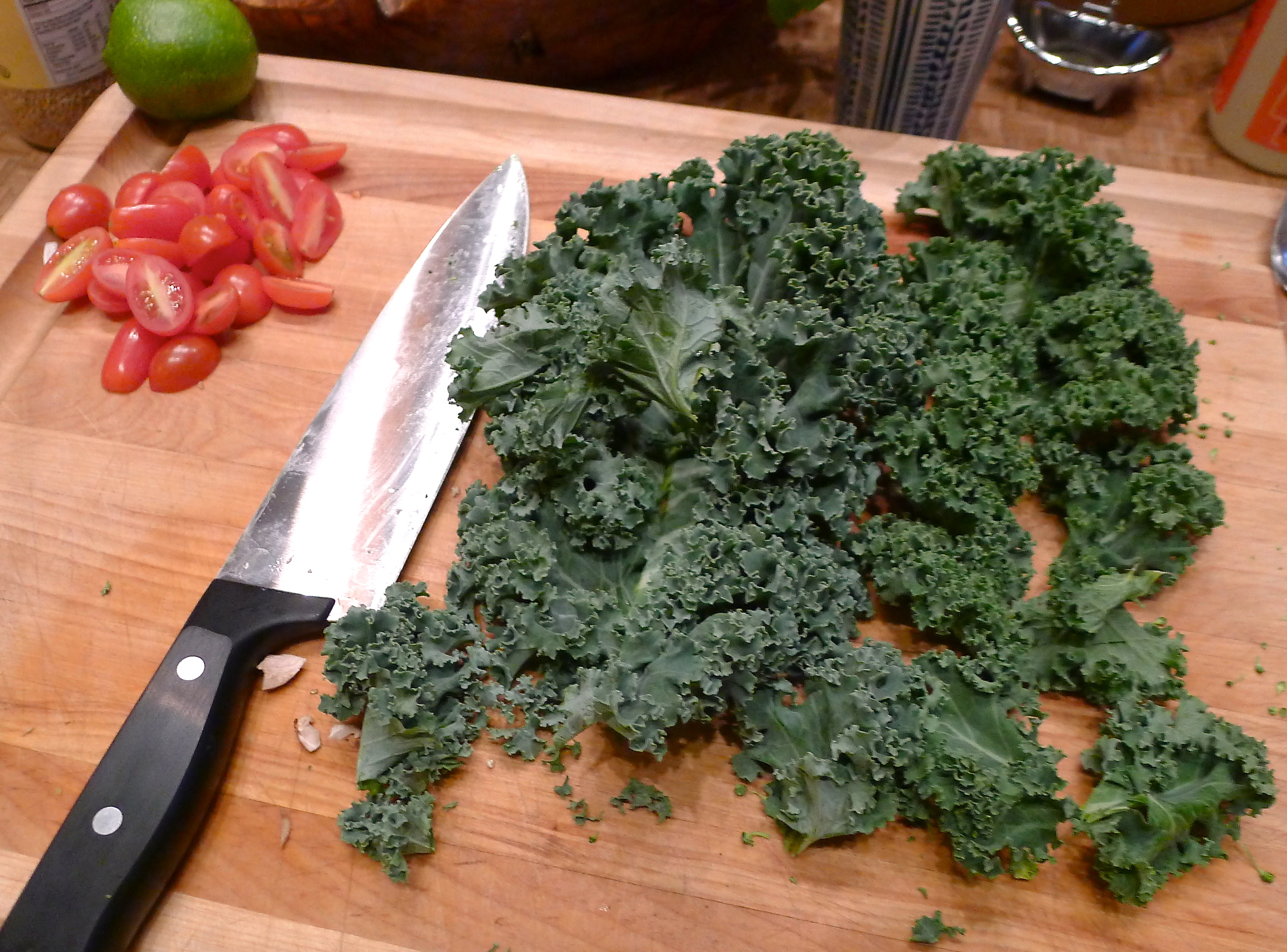 Next came some shiitake mushrooms, followed a few minutes later by onion, garlic, and sliced jalapeno. I stemmed and chopped a couple leaves of kale and tossed it in to wilt.