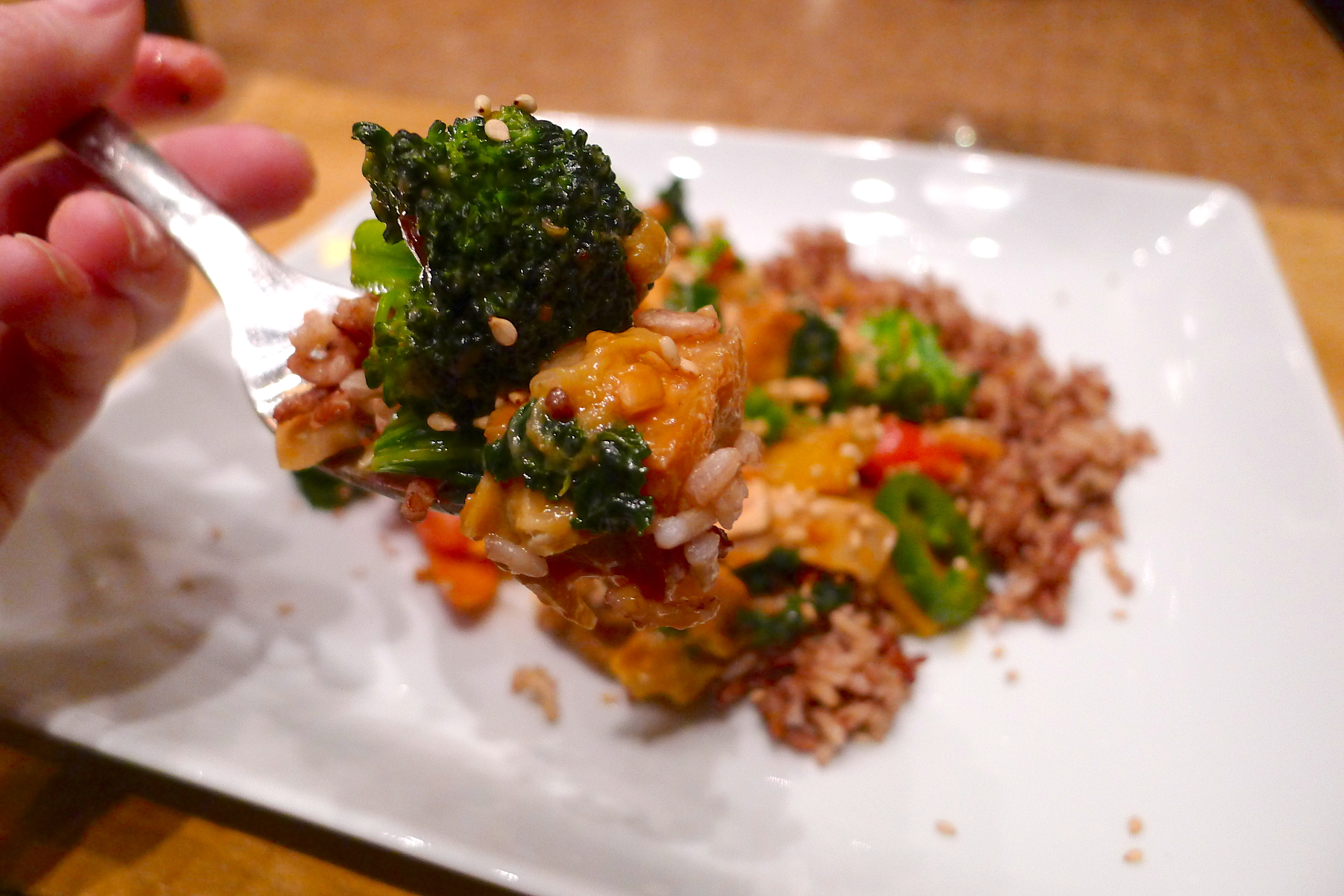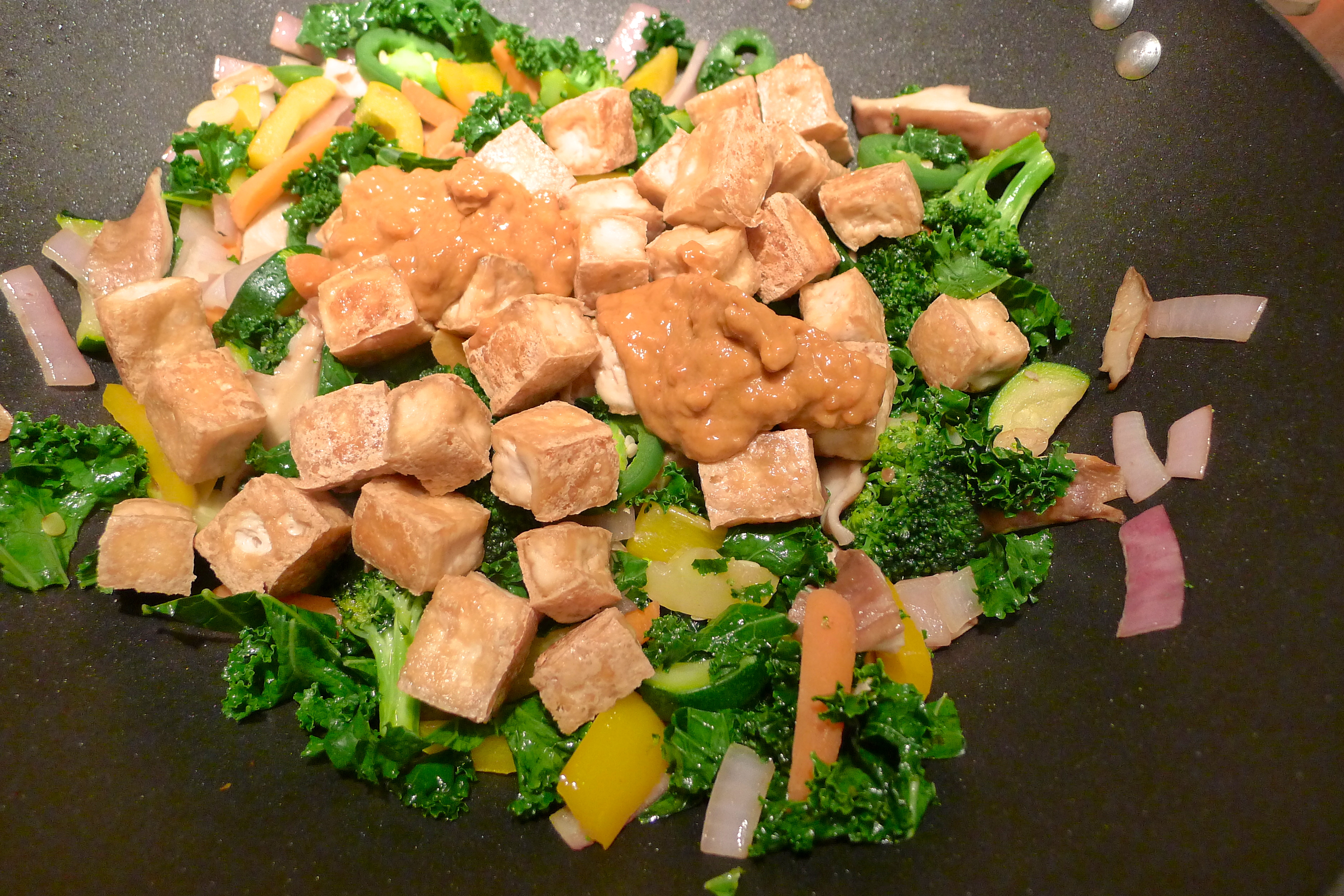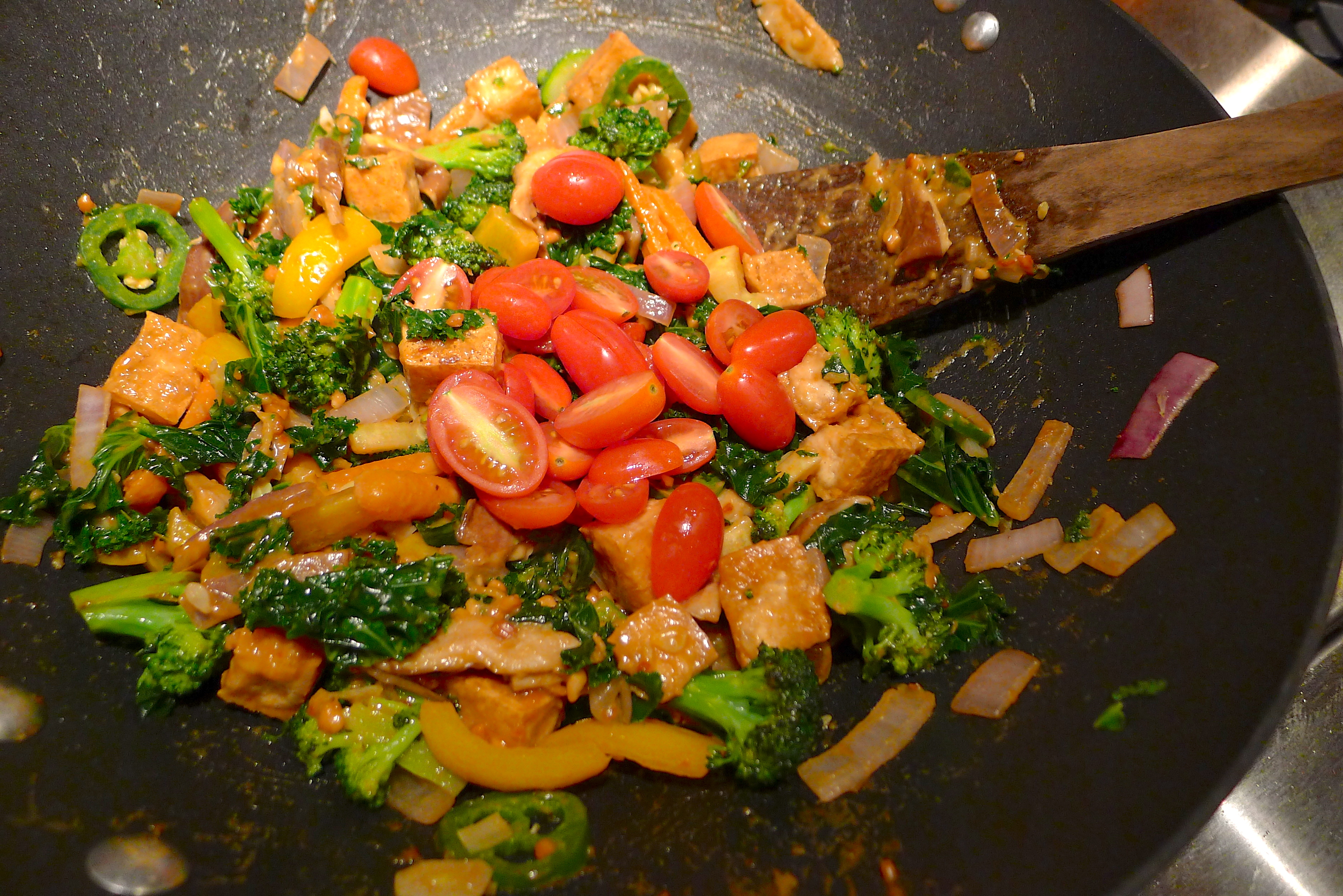 Heat 2 tablespoons of olive oil/sesame oil in a wok or deep skillet on medium-high heat. Sautee the veggies in stages, starting with the ones that will take the longest. After a few minutes, add the jalapeno and garlic. After a few minutes, add the kale. After a few minutes, add the baked tofu. Spoon most of the sauce into the wok and stir well. Taste and add more sauce if desired. Last, stir in the cherry tomatoes and warm through.