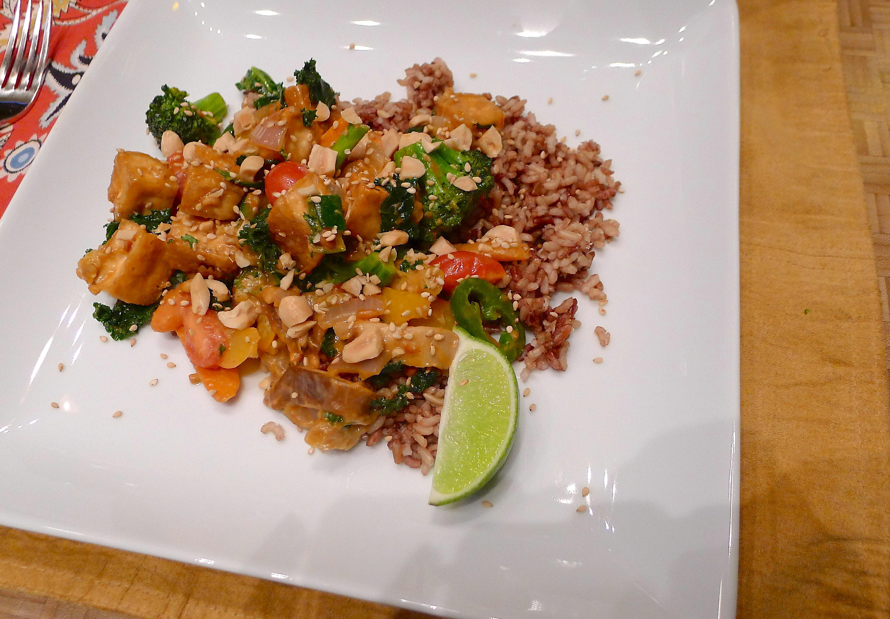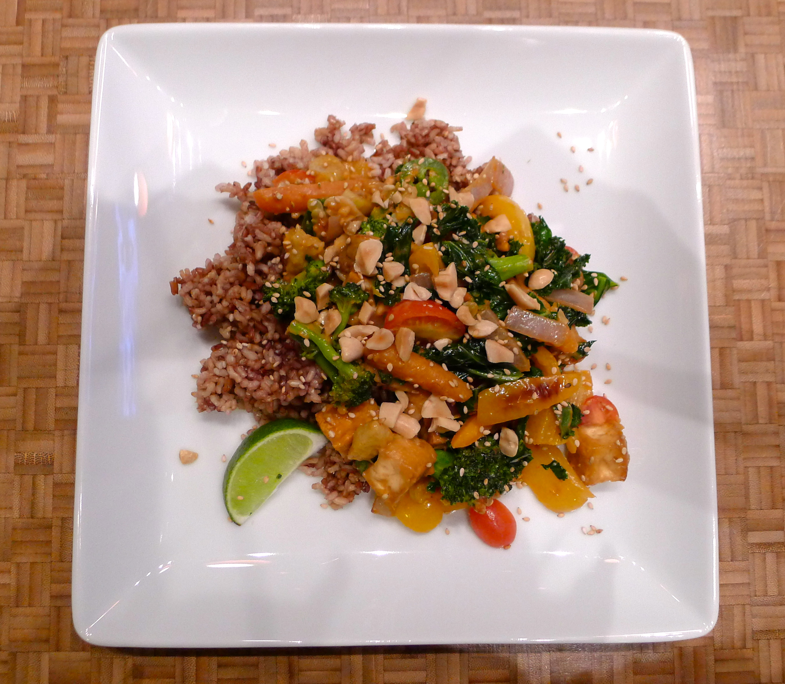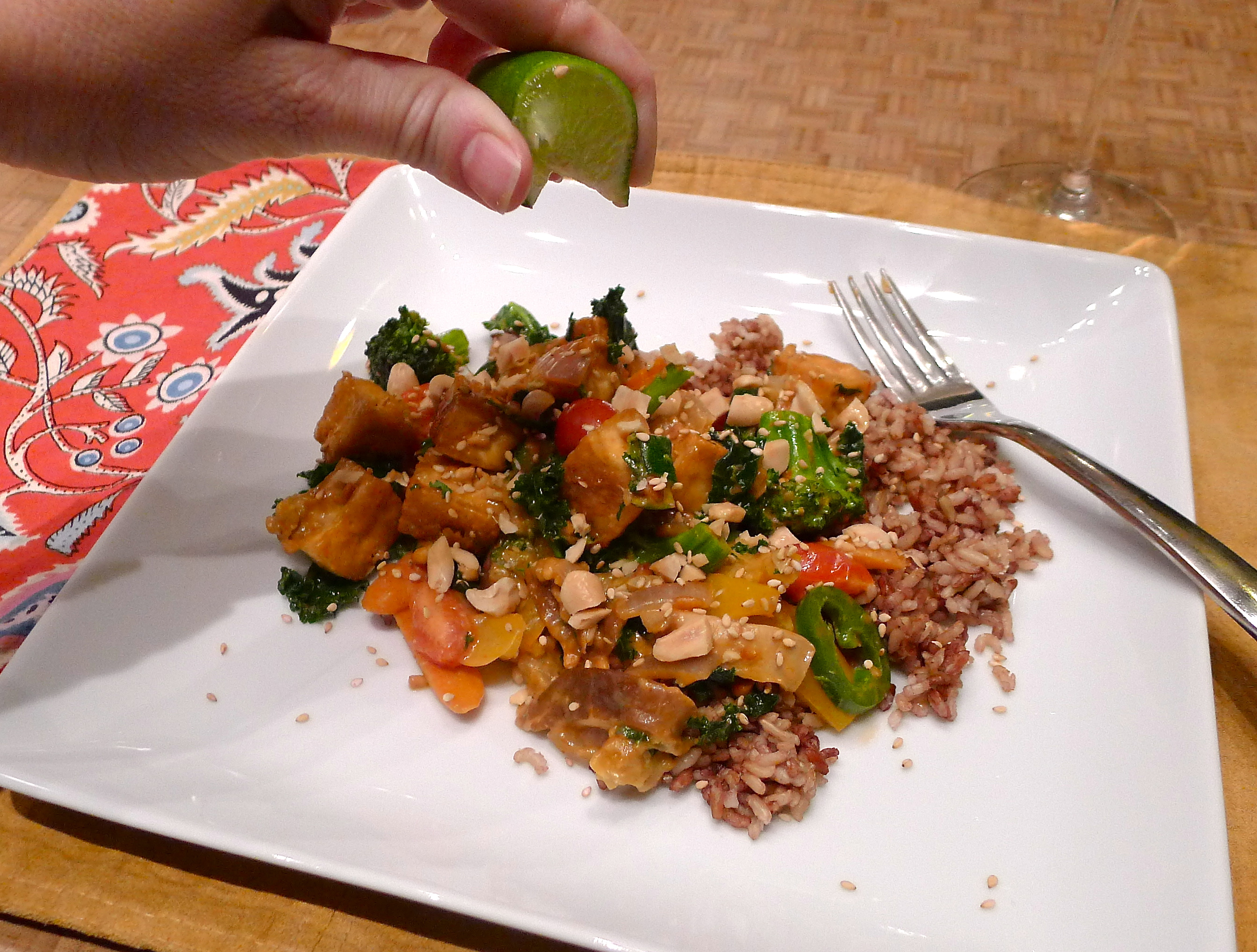 Serve stir-fry over brown rice. Sprinkle sesame seeds and chopped peanuts over the top and serve with a lime wedge. Cheers to Meatless Monday and a healthy new year. YUM.