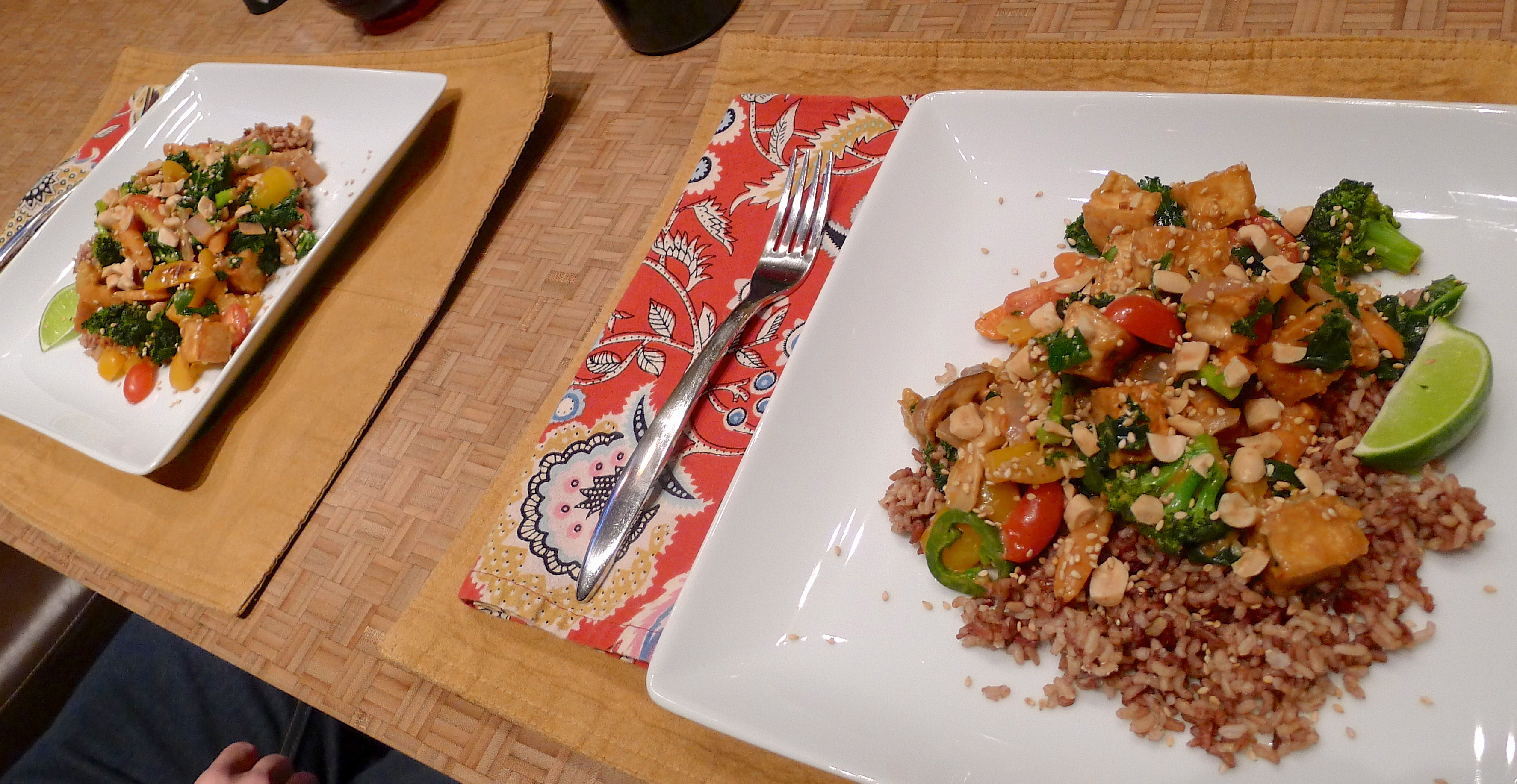 It’s time to add the tofu! I also spooned in some of the peanut-lime sauce, tasting it and adding more. To finish, I added a handful of halved cherry tomatoes and let them warm through. Let’s eat!